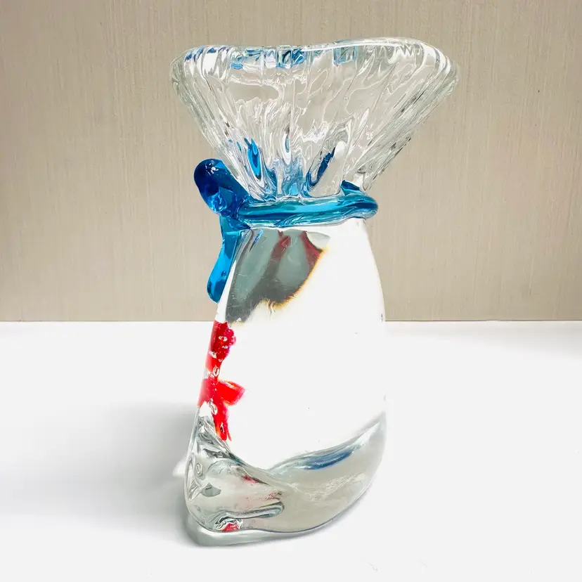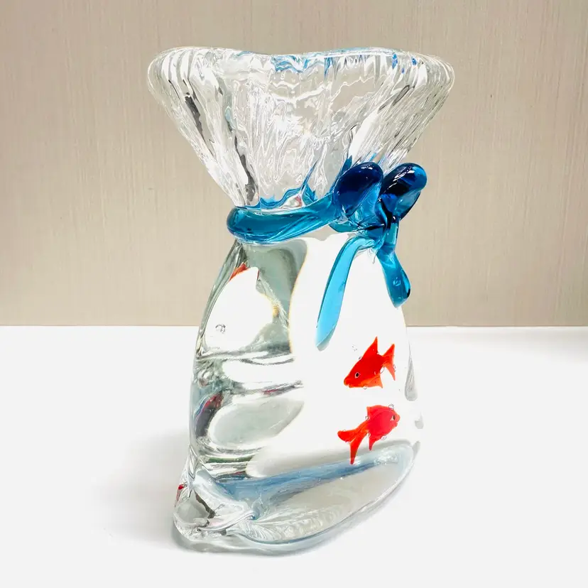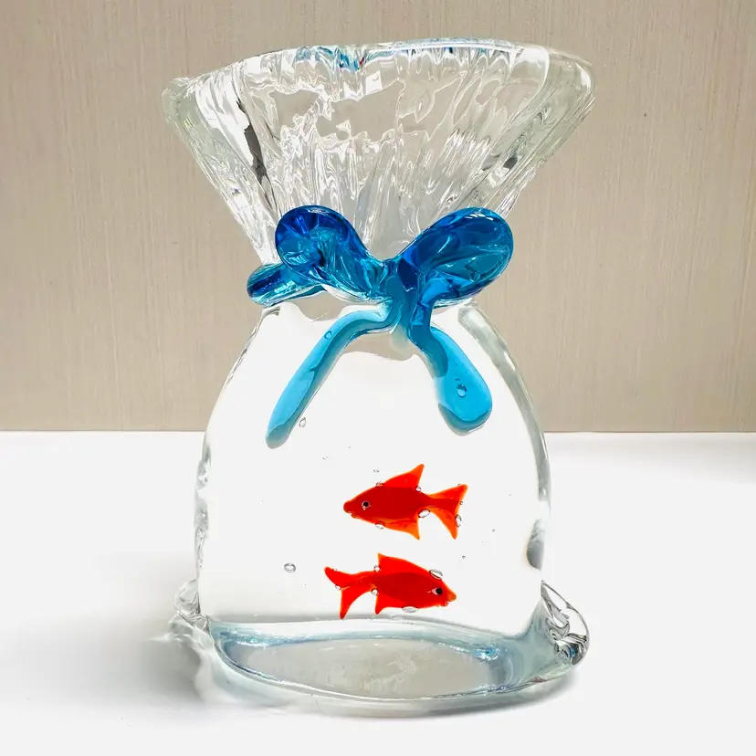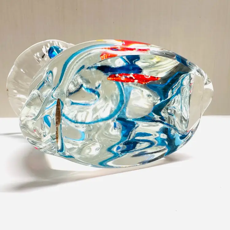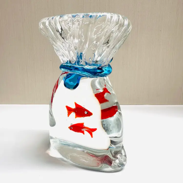 Previously owned art glass two goldfish in a bag with blue bow. There are no maker marks. Polished smooth bottom. Note glass does have small bubbles (see pictures).