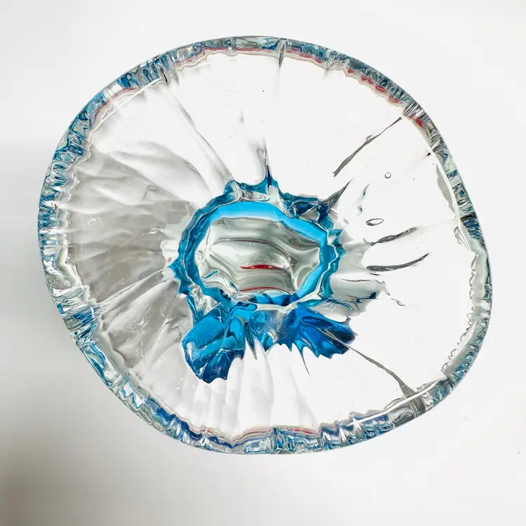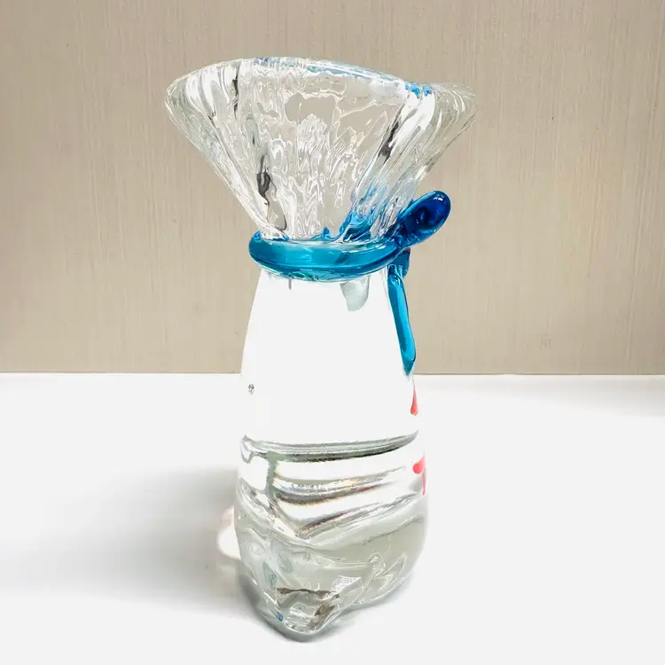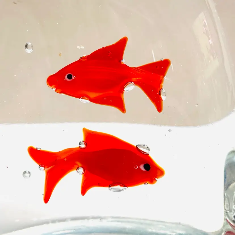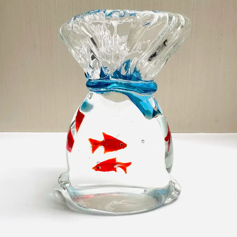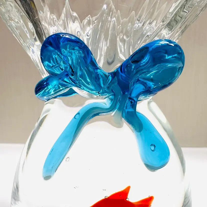Previously owned art glass two goldfish in a bag with blue bow. There are no maker marks. Polished smooth bottom. Note glass does have small bubbles (see pictures).