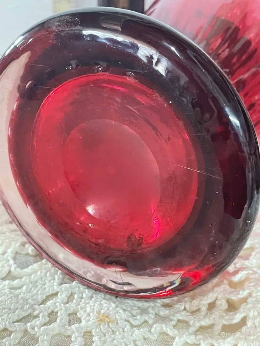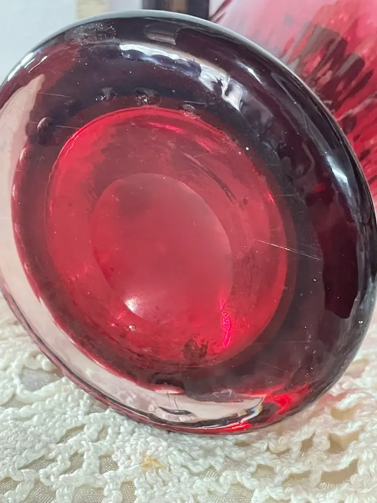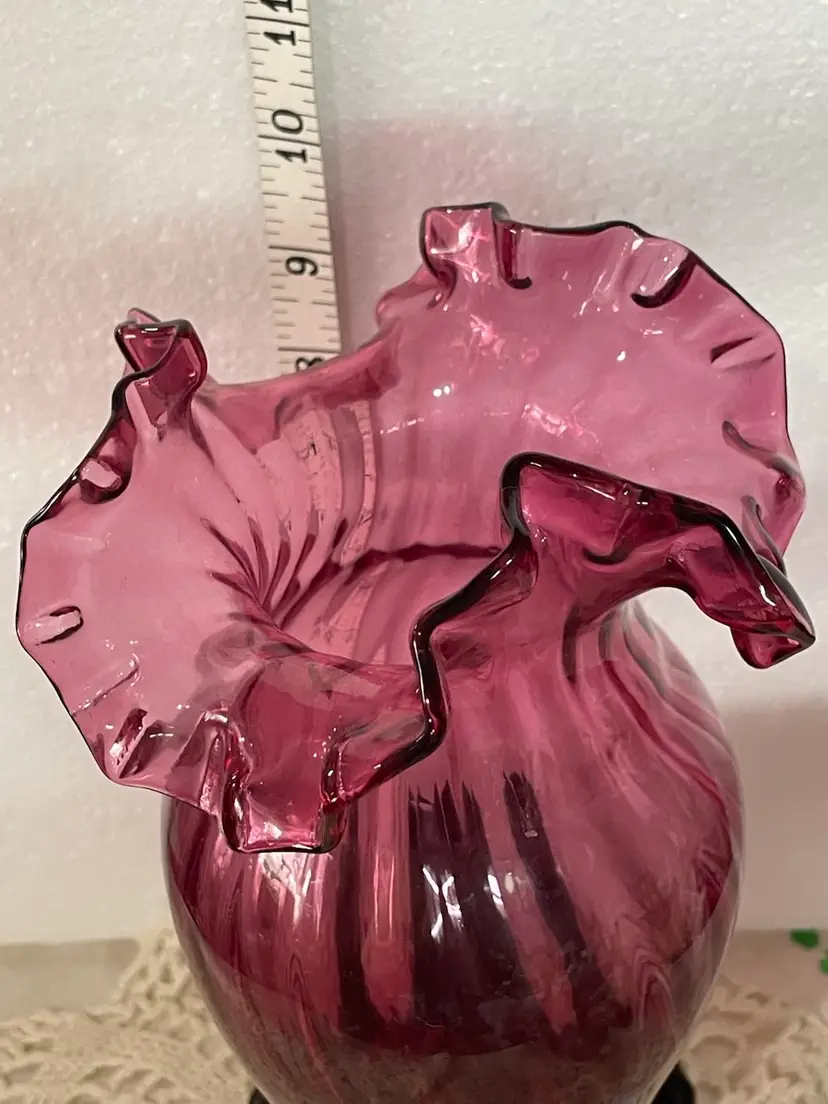 Handblown and Cut transparent Dark Pink Art Glass Vase. Features plain sides design, and a ruffled top rim edge. Measures 11.5" tall x 5 1/2" wide. This vase is in Excellent Condition ... with no notable "damage" of any kind. This piece is unmarked and not signed.