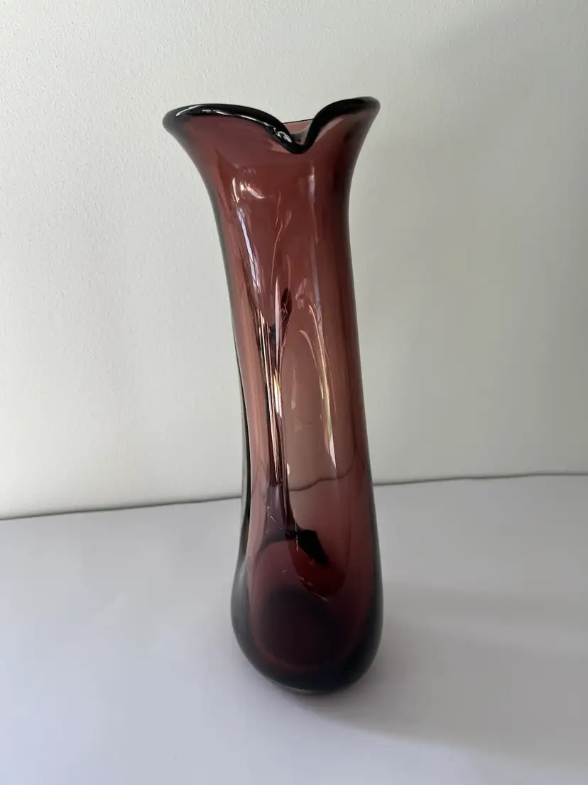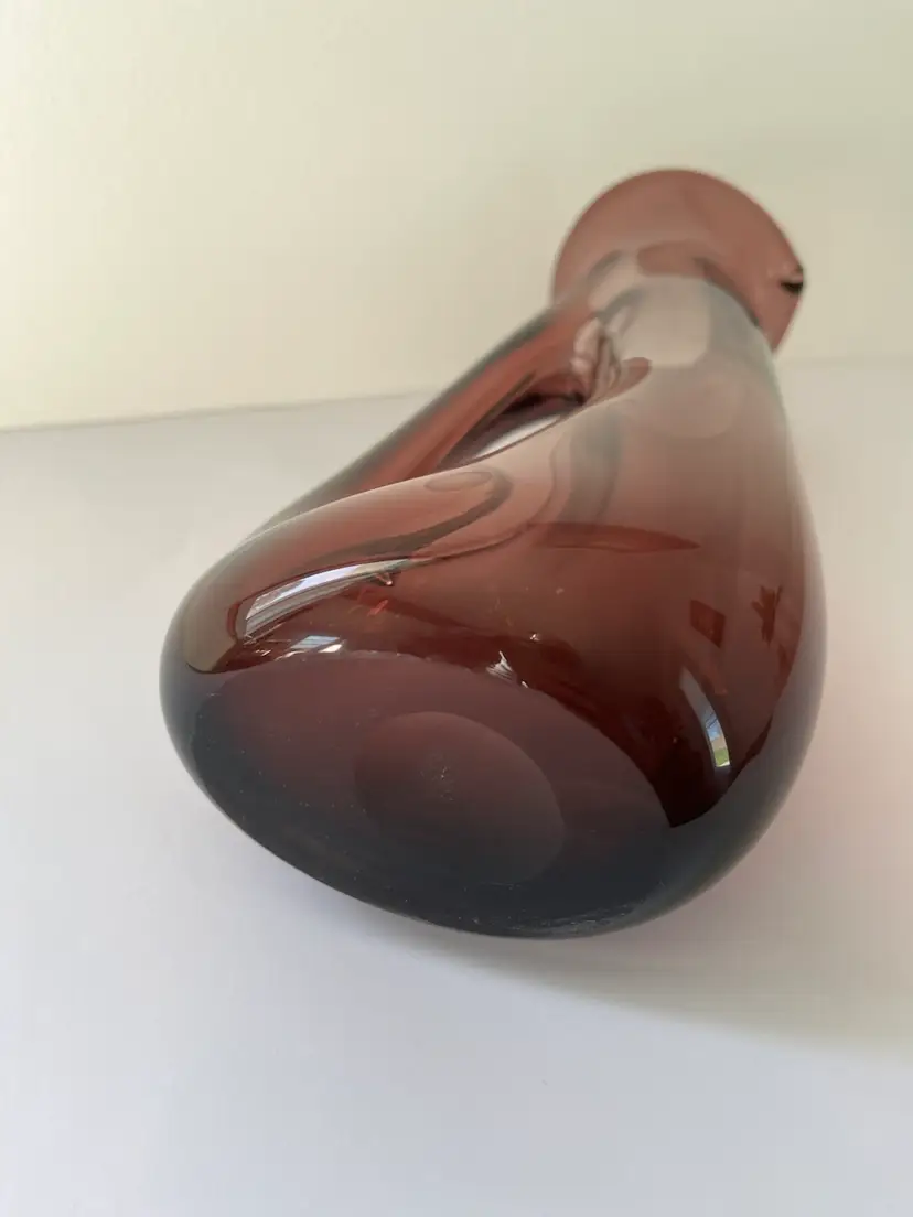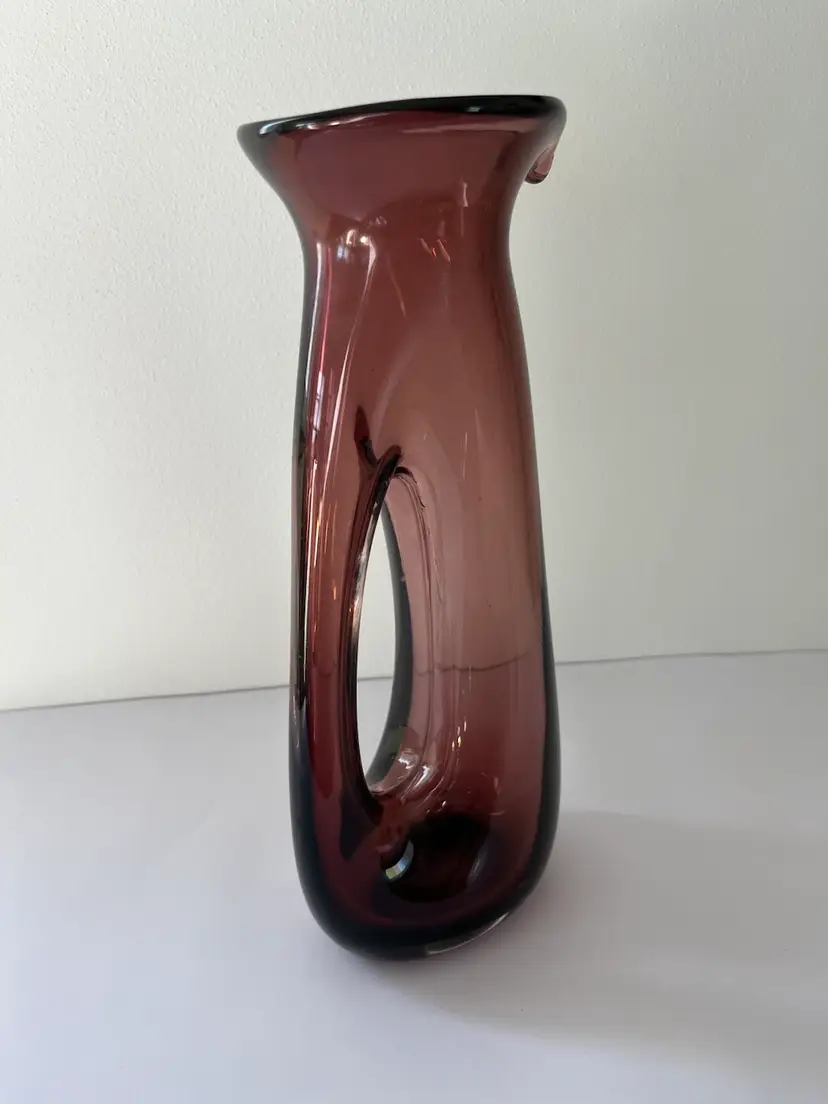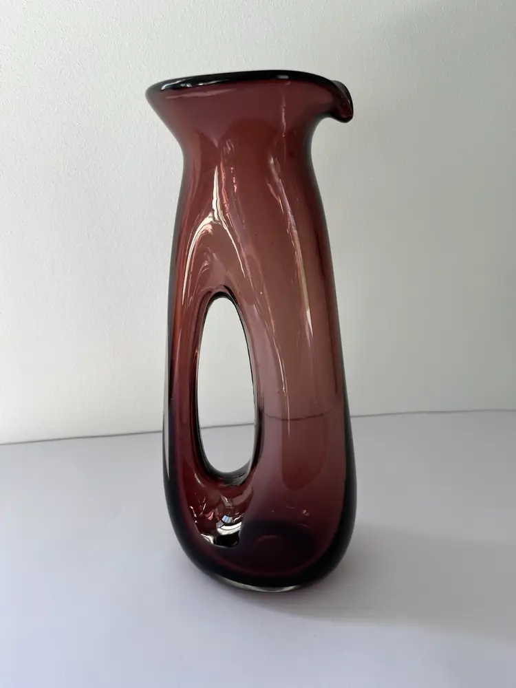 Art glass pitcher. Is a kind of amethyst in color. Hand blown with smoothed over pontil on base. Good condition with no crack or chips. Has some slightly (not sharp) rough edges inside the handle from glass blowing. Use as a flower vase, a pitcher, or as shelf or table decor.