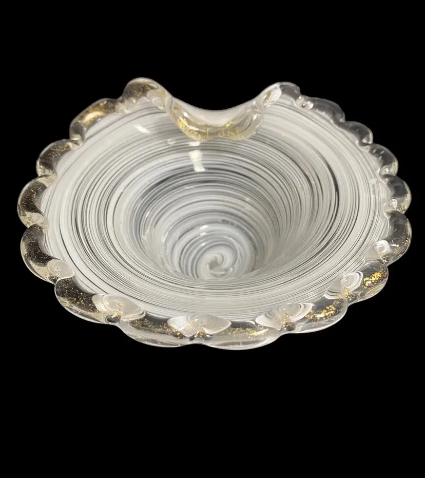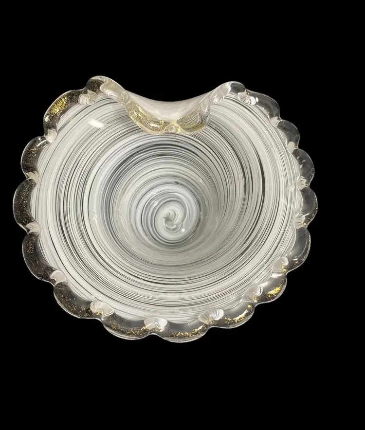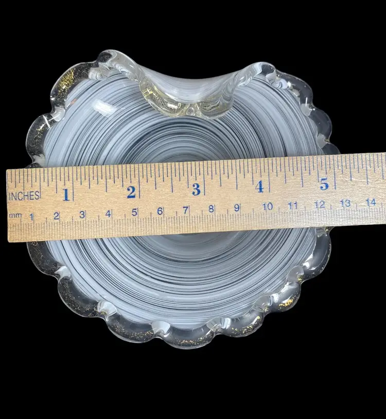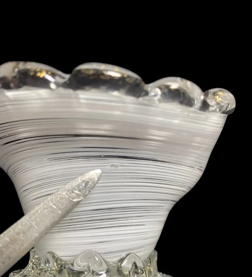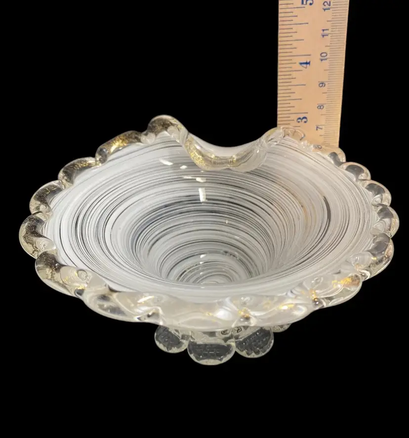 This white swirl glass is in very good condition; free of chips, scratches or cracks. It does have a few bubbles which are reflected in the pictures. It measures approximately 5” diameter at the top, 2”diameter at the bottom and 3” tall.