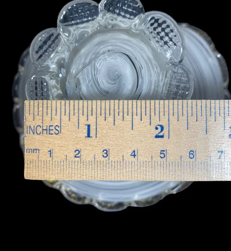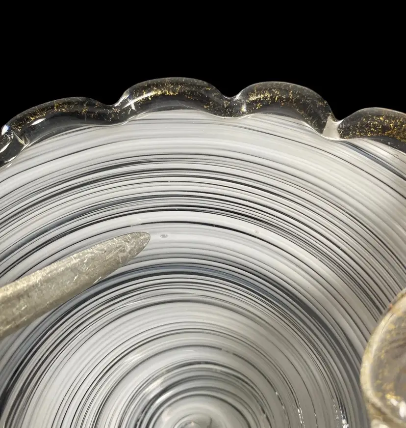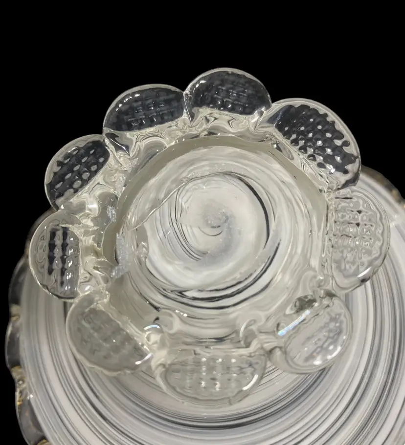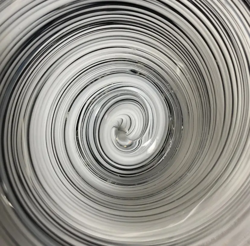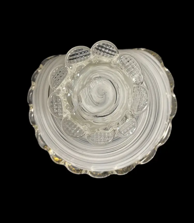 This white swirl glass is in very good condition; free of chips, scratches or cracks. It does have a few bubbles which are reflected in the pictures. It measures approximately 5” diameter at the top, 2”diameter at the bottom and 3” tall.