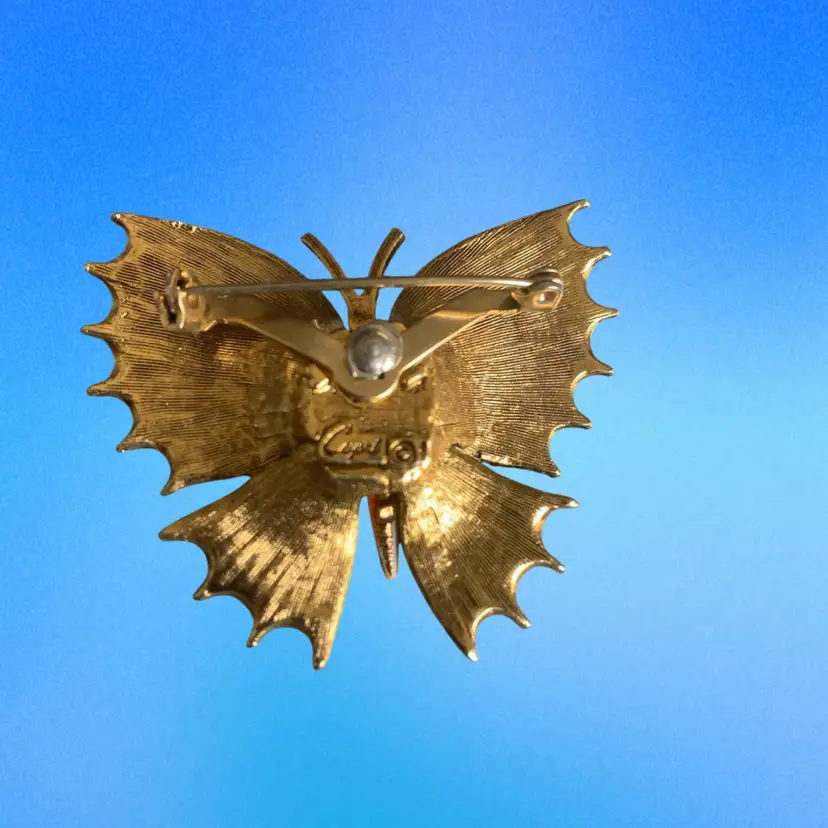 Orange and yellow enameled Gold tone Riveted V shape pin back a little movement