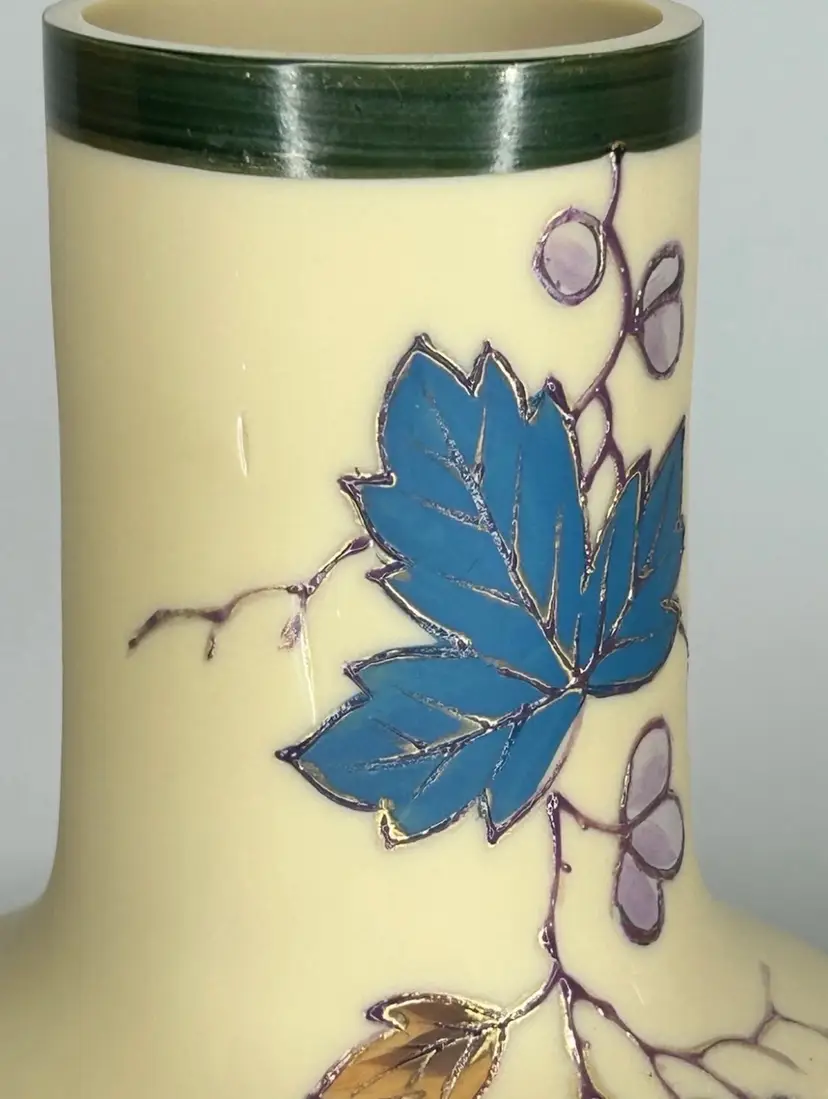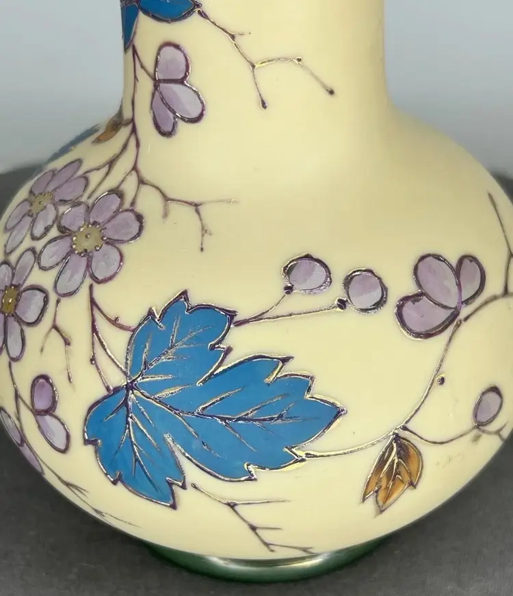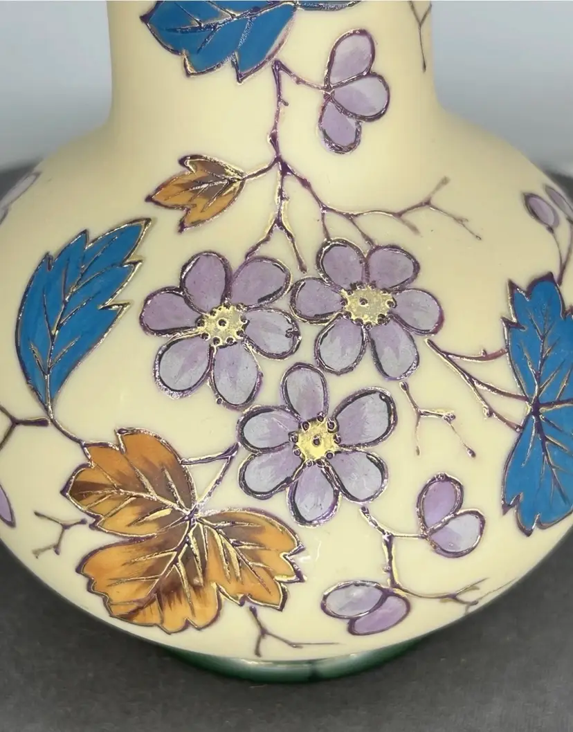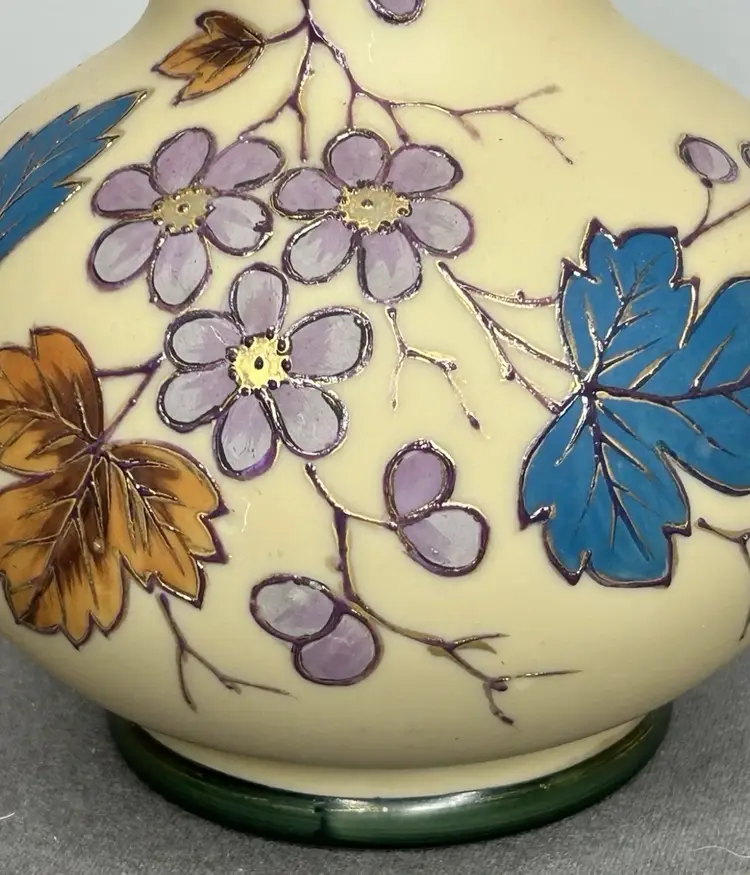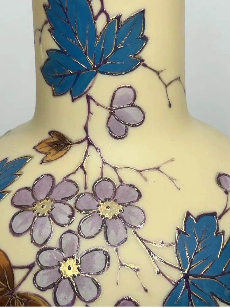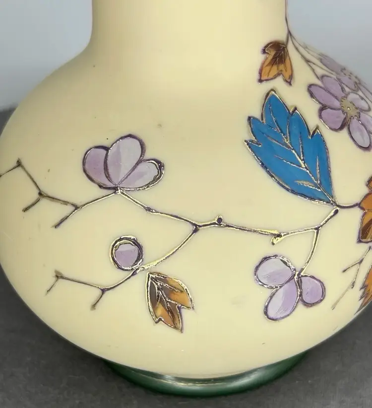 Vintage/Antique Art Nouveau Handblown Bohemian Gold Enameling Custard Glass Vase is great vintage pre-owned condition, with NO chips, cracks or repairs. It does show some slight wear consistent with its vintage age. Please review all pictures for proper assessment of its vintage preowned condition. Style: Art Nouveau, featuring hand-painted floral decorations with gold enameling. ® • Design: Bulbous base with a long, slender neck and enameled leaves and blossoms. • • Material: Known to be made of custard glass or satin glass. • Provenance: Historically produced in the Bohemia region of the Czech Republic.