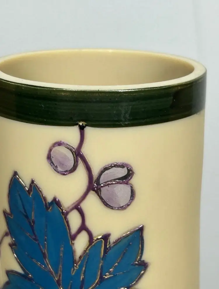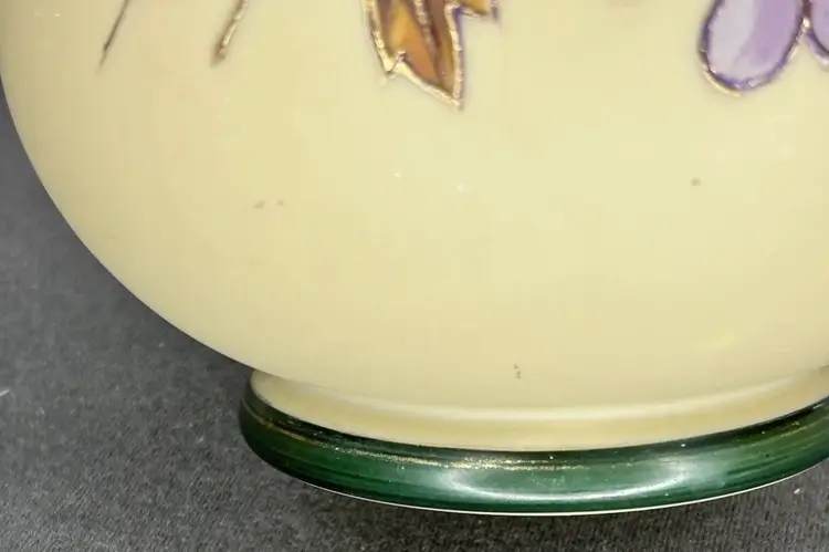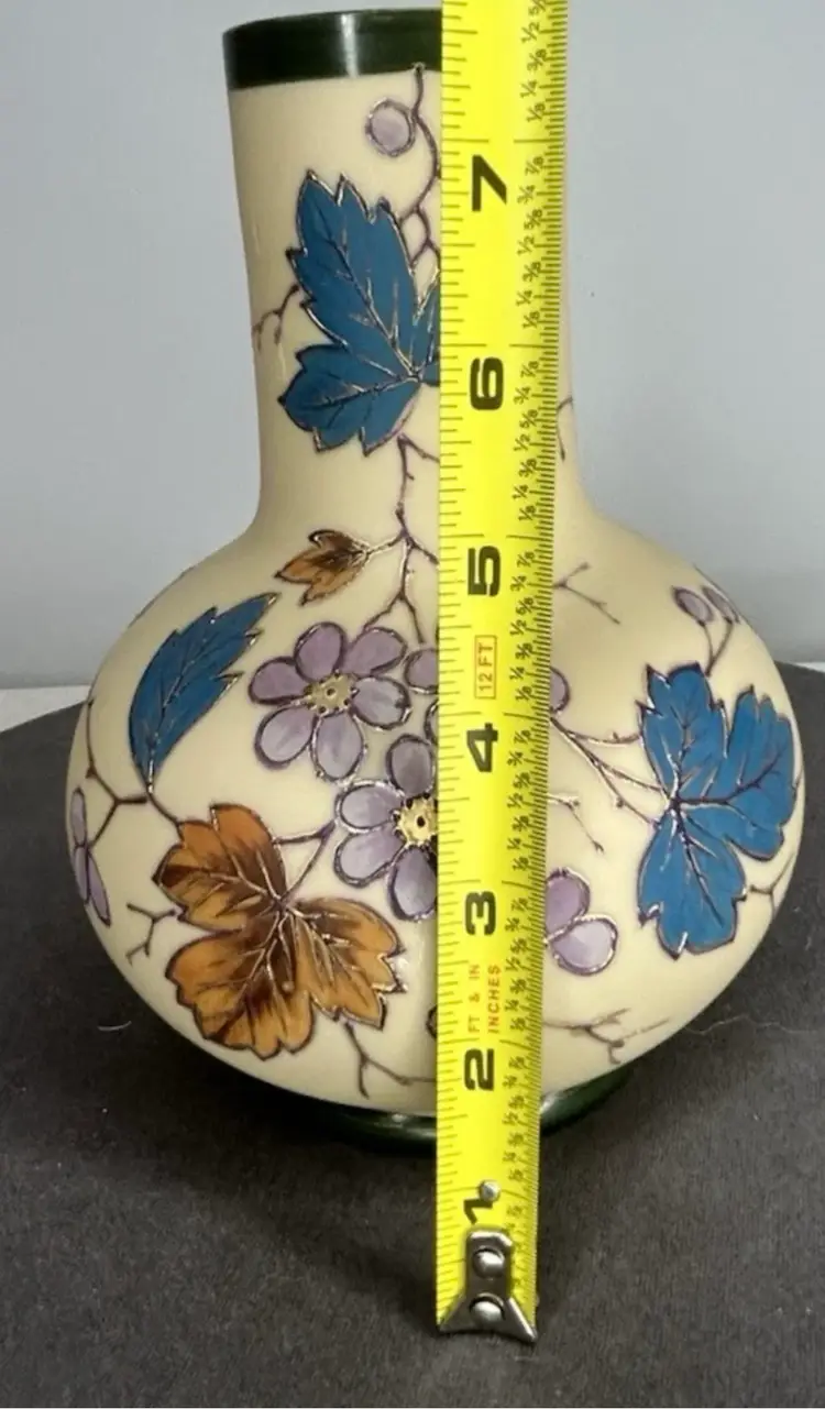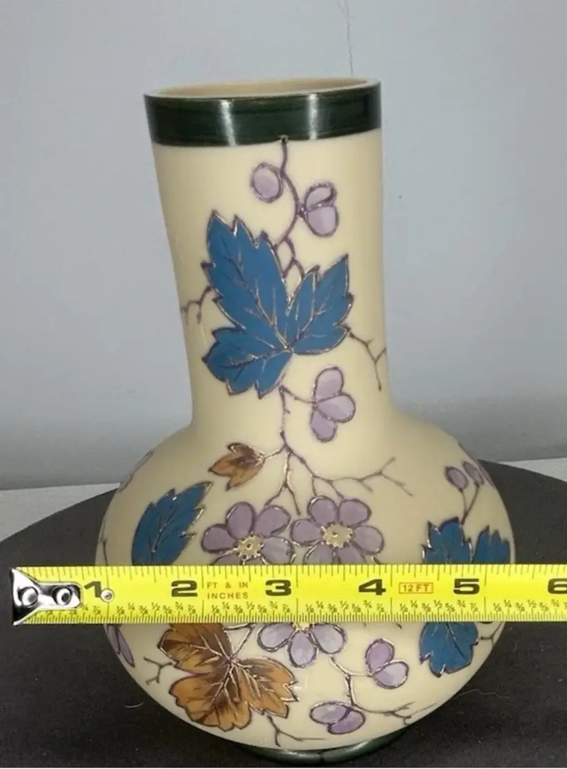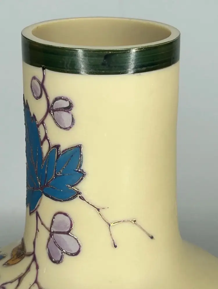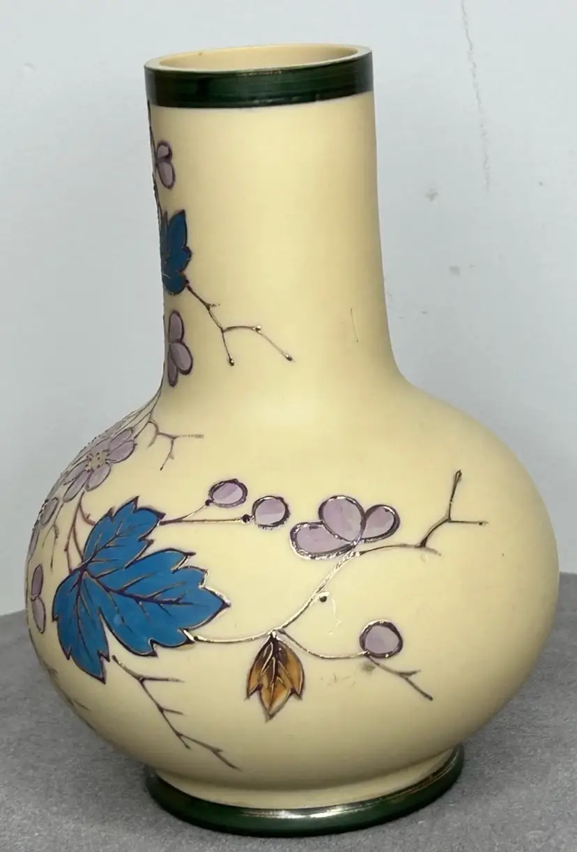 Vintage/Antique Art Nouveau Handblown Bohemian Gold Enameling Custard Glass Vase is great vintage pre-owned condition, with NO chips, cracks or repairs. It does show some slight wear consistent with its vintage age. Please review all pictures for proper assessment of its vintage preowned condition. Style: Art Nouveau, featuring hand-painted floral decorations with gold enameling. ® • Design: Bulbous base with a long, slender neck and enameled leaves and blossoms. • • Material: Known to be made of custard glass or satin glass. • Provenance: Historically produced in the Bohemia region of the Czech Republic.