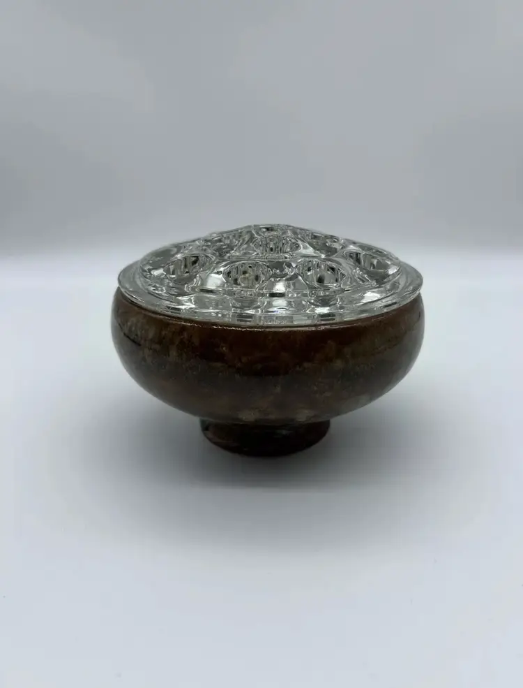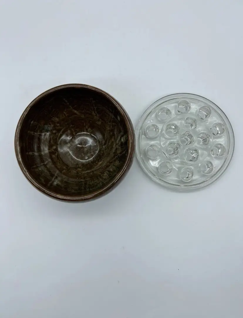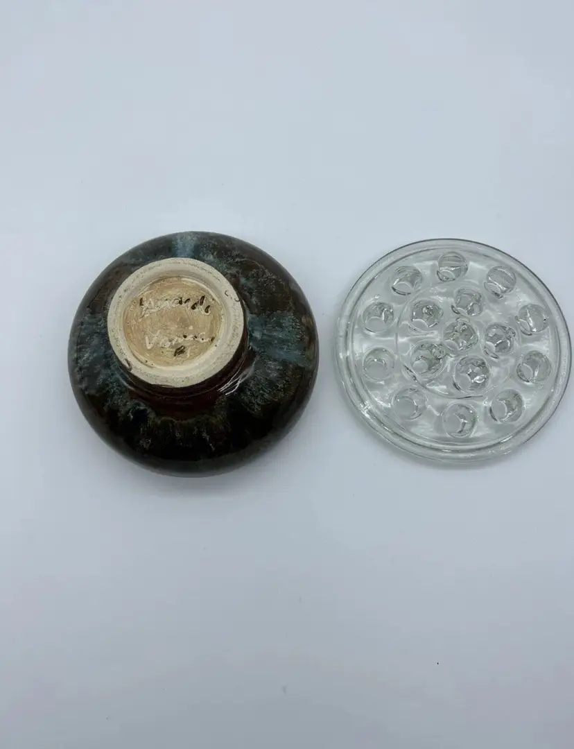 Vintage Art Pottery Bowl w/ Vintage Glass Flower Frog Decor Marked & Signed