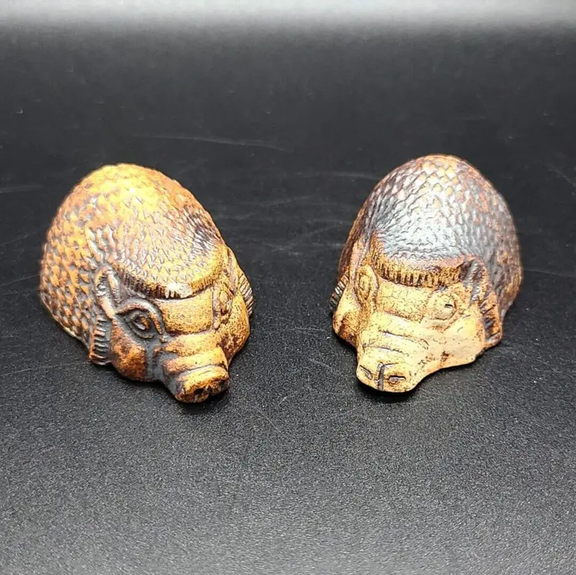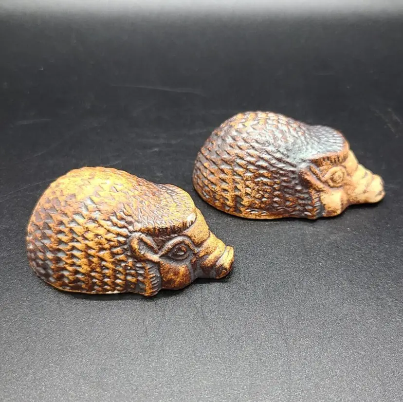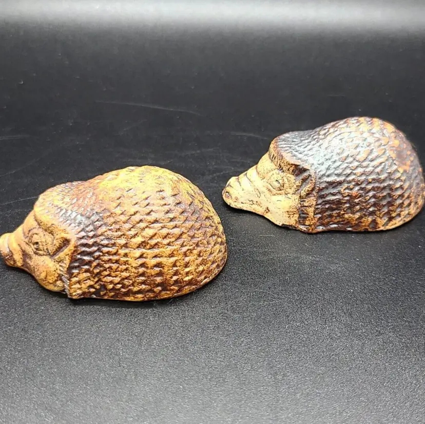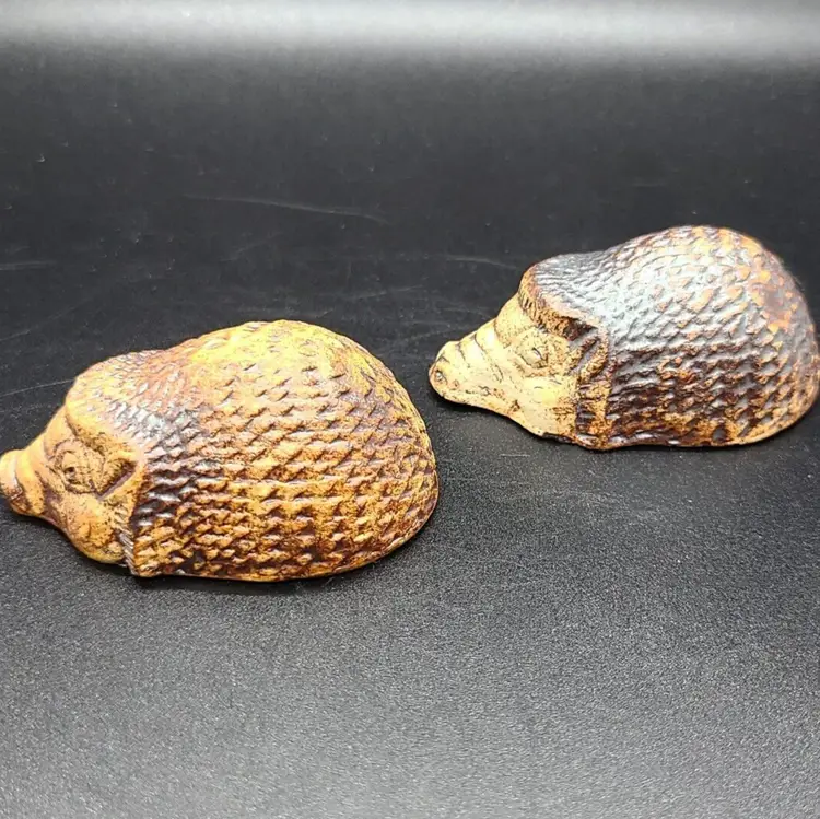 This listing is for a pair of small pottery hedgehog figurines from Quantock Design of Somerset, England. One is believed to be from Quantock Design while the other is from their studio after they closed and reopened, hence why it's stamped "Simonsbath Exmoor". One hedgehog has a small chip on its head, no other damages. They measure about 1" tall and 2.5" long.
