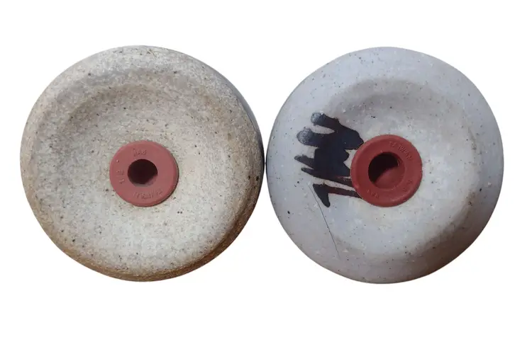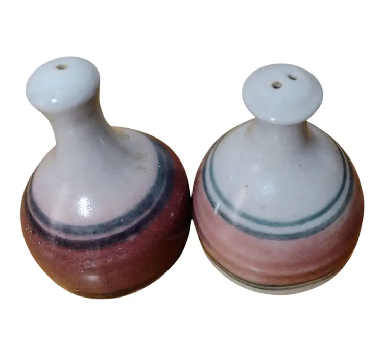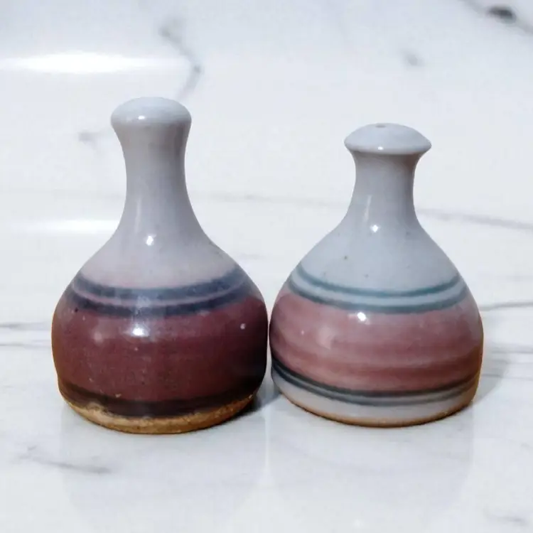 Items are pre-owned and in very good condition with no cracks or chips. Smoke free environment. These are very nice handmade Stoneware art pottery shakers in a bottleneck design and is signed on the bottom, however I could not make out the artist. Shakers measure 3" tall x 2.5" wide.