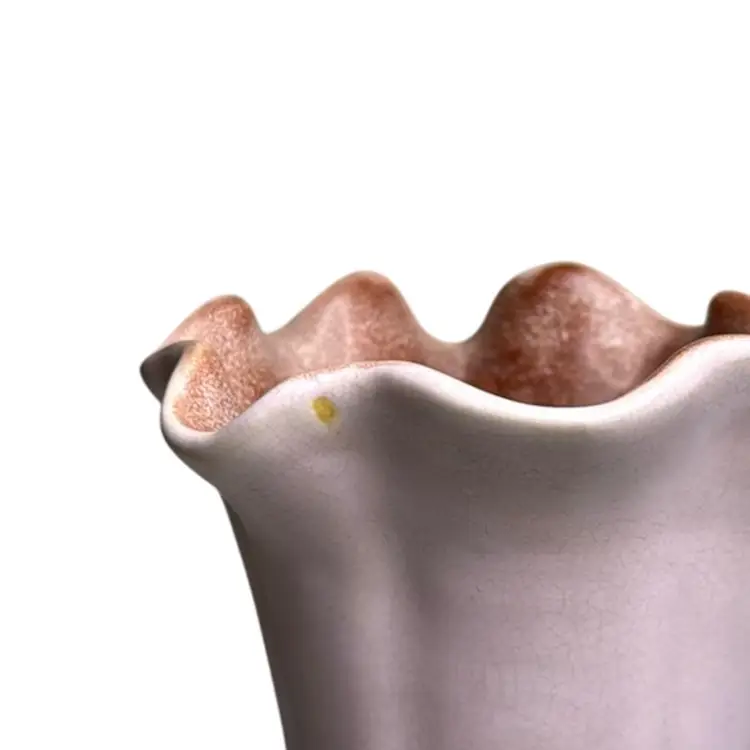 Condition: Crazing normal for age. Discoloration inside bottom of vase and a dark spec on the side. Spot near the top edge, under the ruffle missing color. See last three pictures.