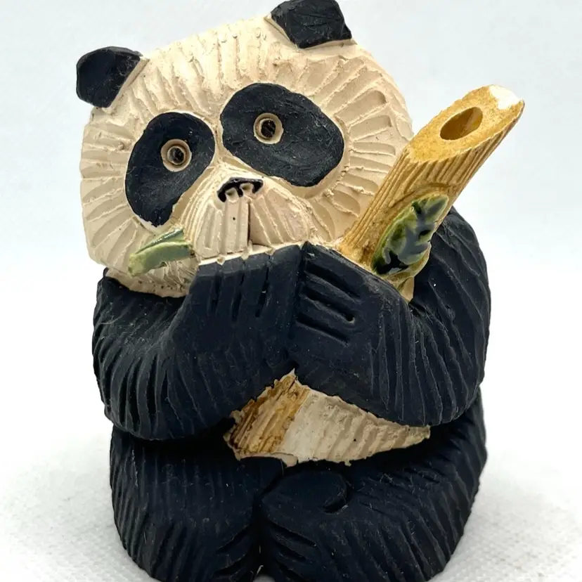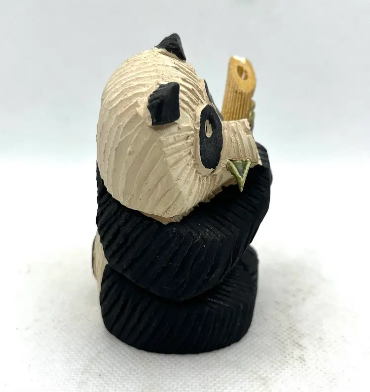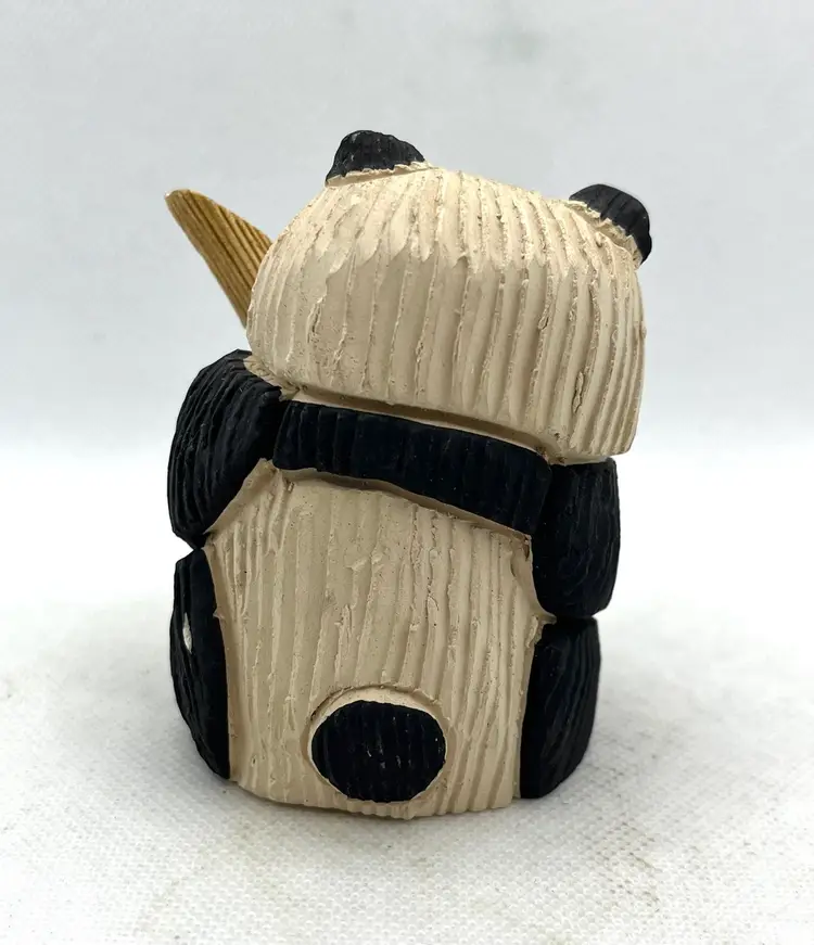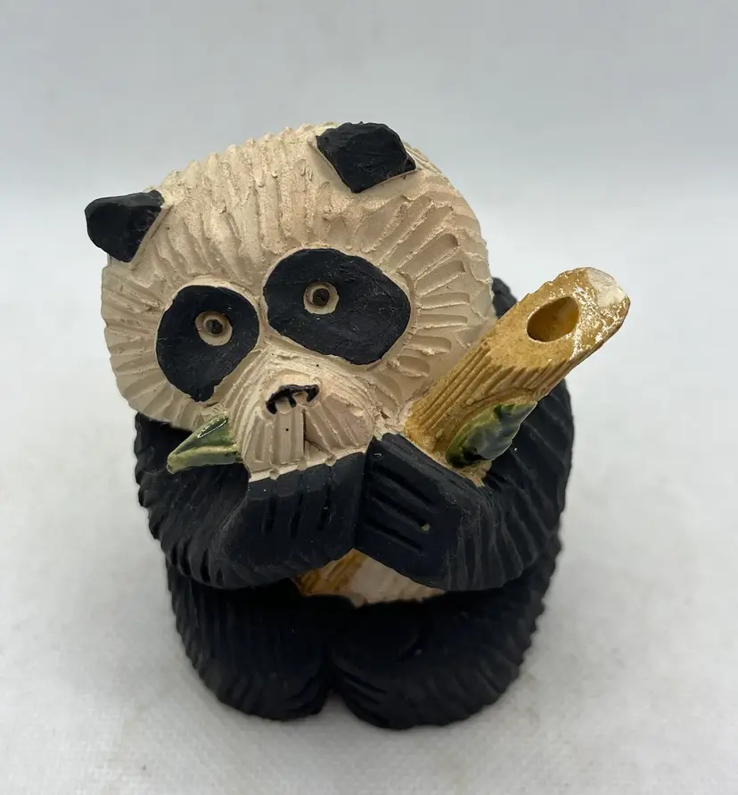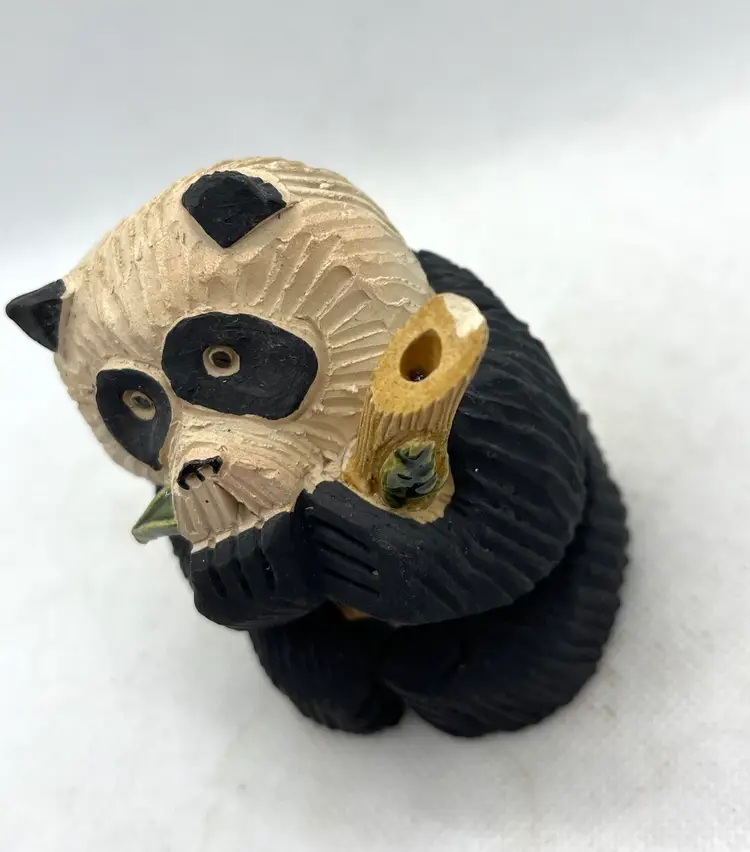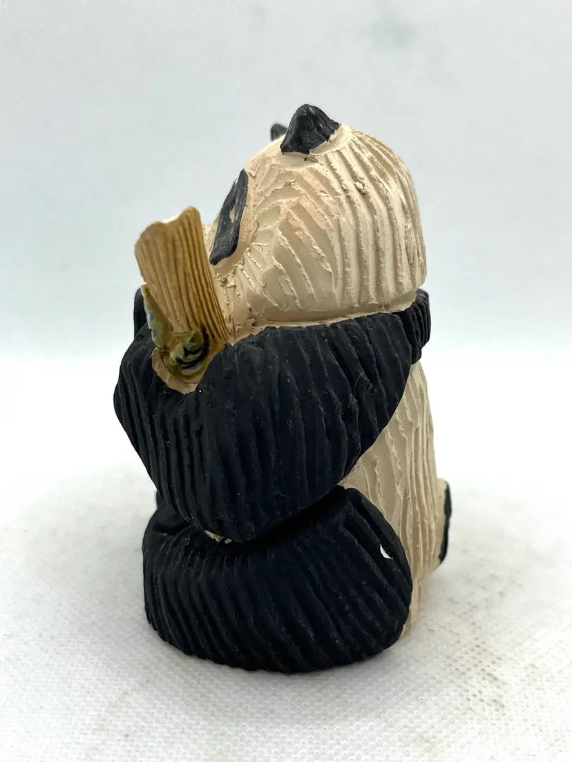 Vintage cute ceramic panda bear figurine was made by artists Jesus and Javier Carbajales of Uruguay. They created the company "Artesania Rinconada" through which they sold many different kinds of earthenware animal figurines. Small chip on top of bamboo and area of paint loss on back both shown clearly in photos.