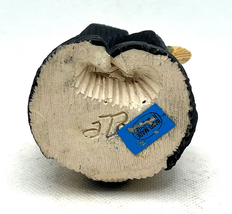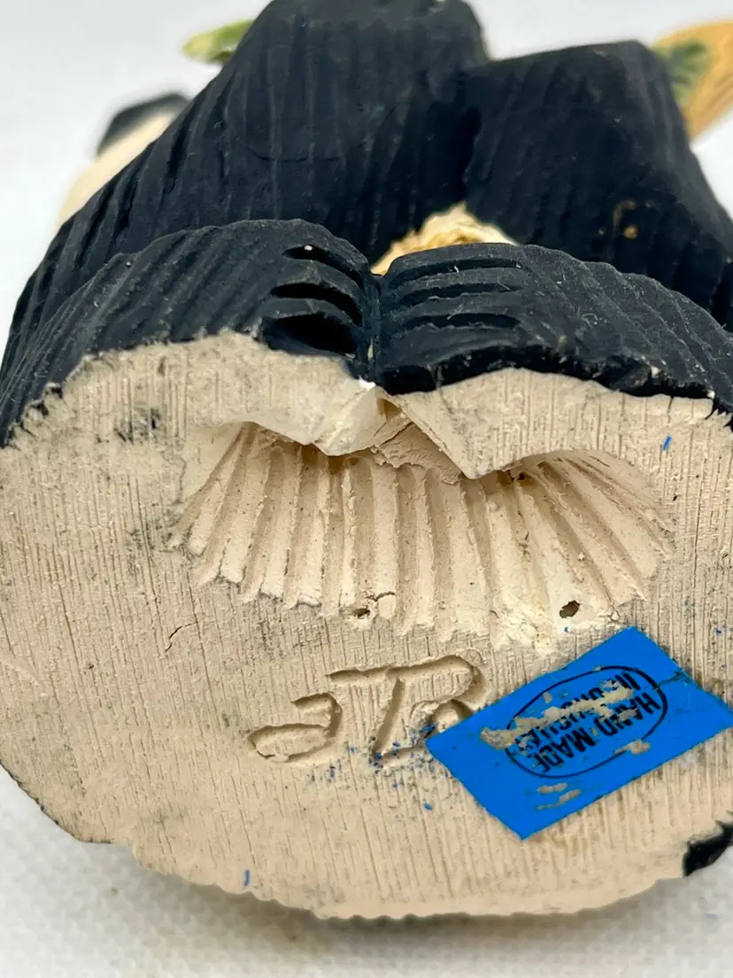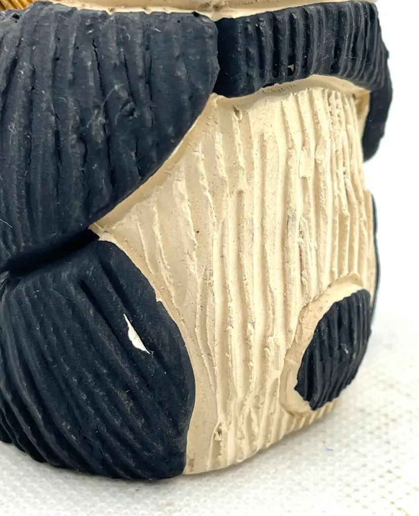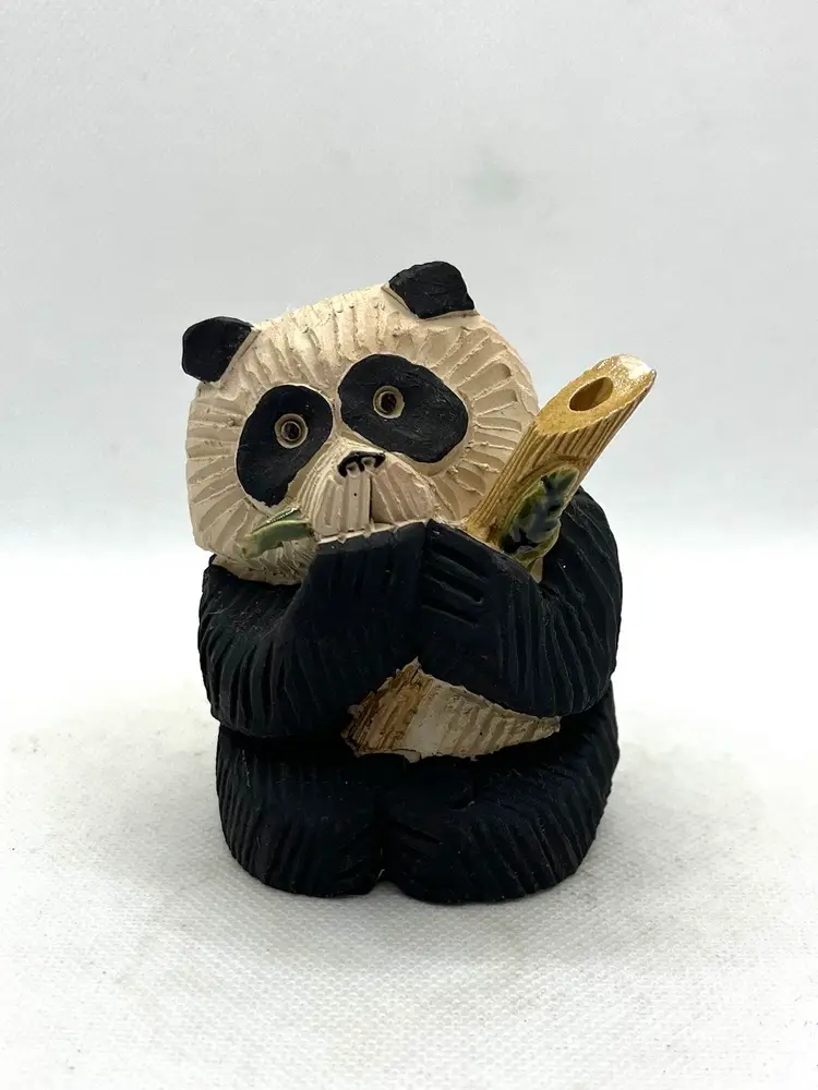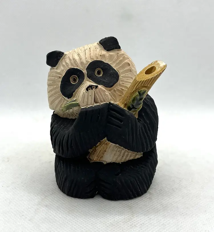 Vintage cute ceramic panda bear figurine was made by artists Jesus and Javier Carbajales of Uruguay. They created the company "Artesania Rinconada" through which they sold many different kinds of earthenware animal figurines. Small chip on top of bamboo and area of paint loss on back both shown clearly in photos.