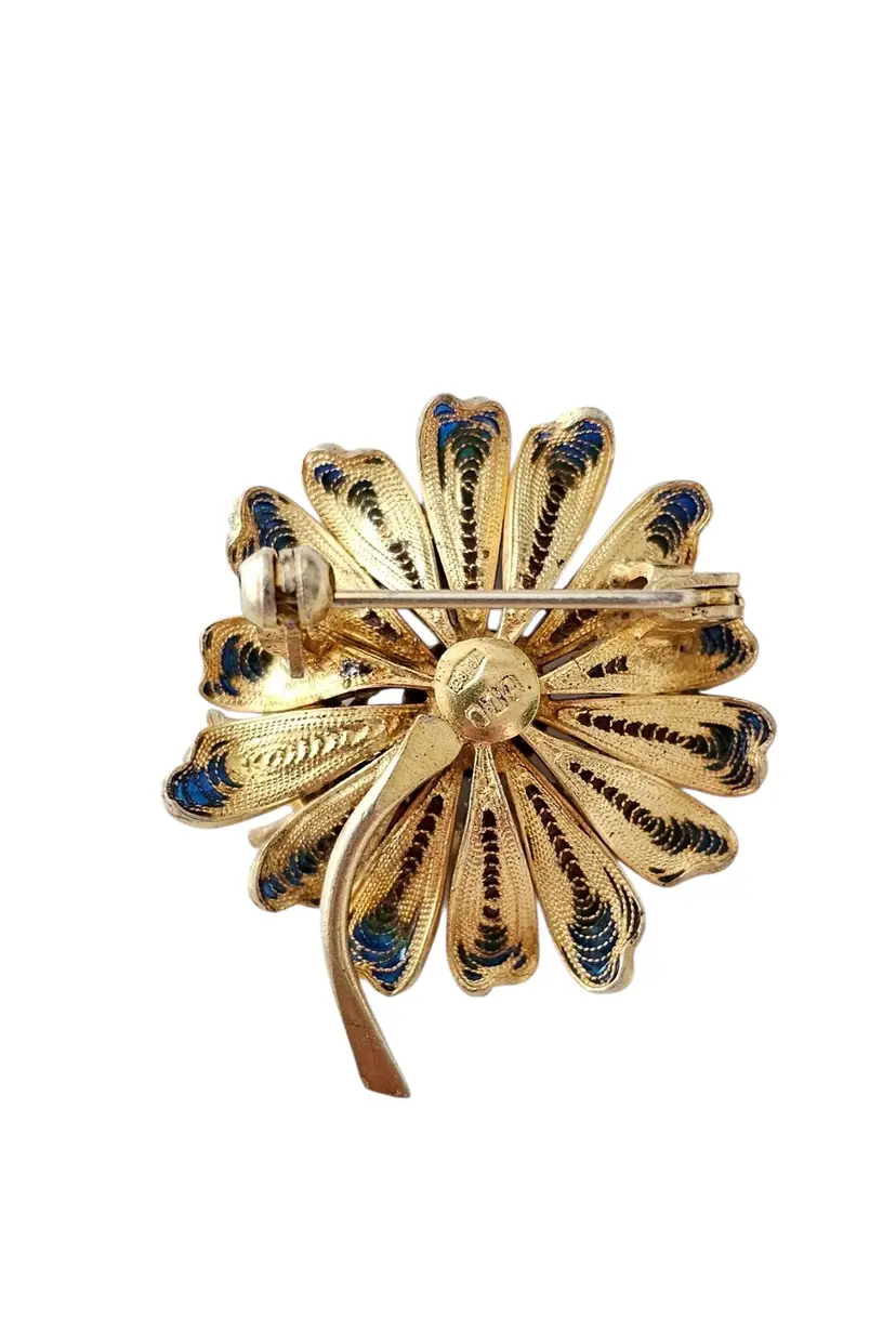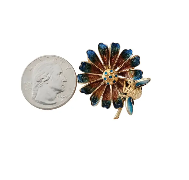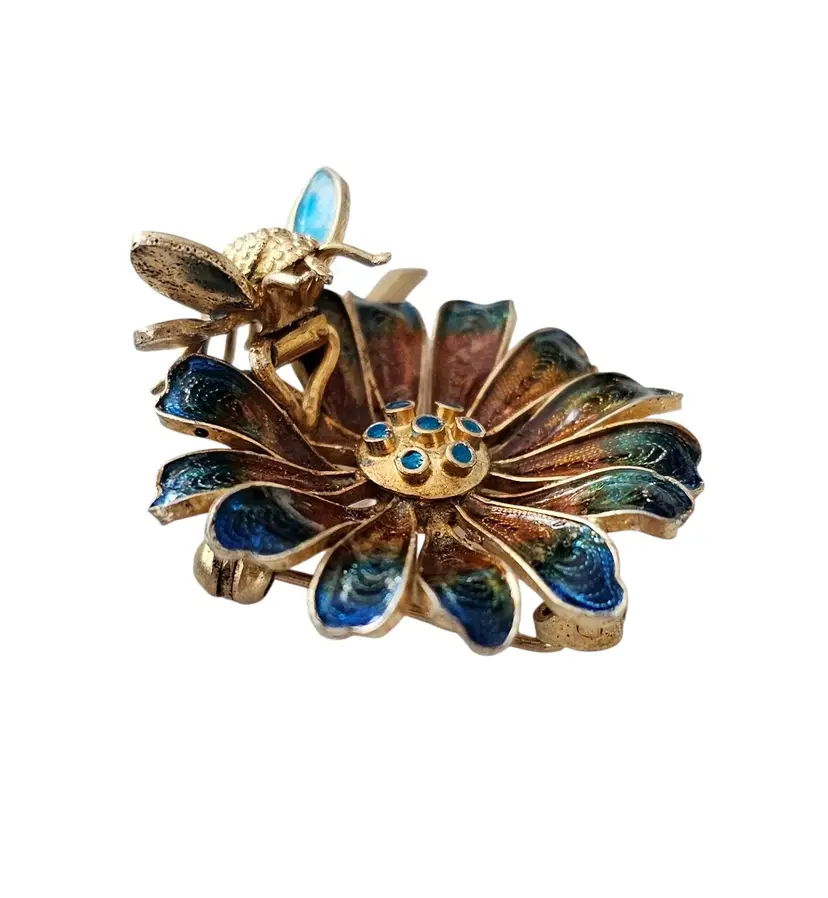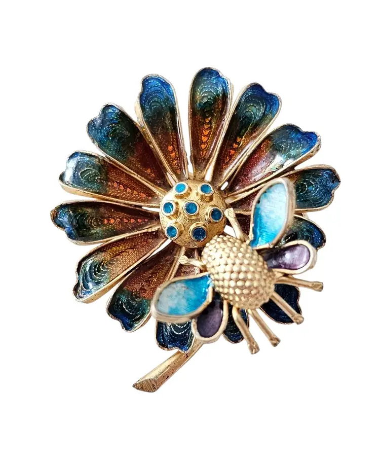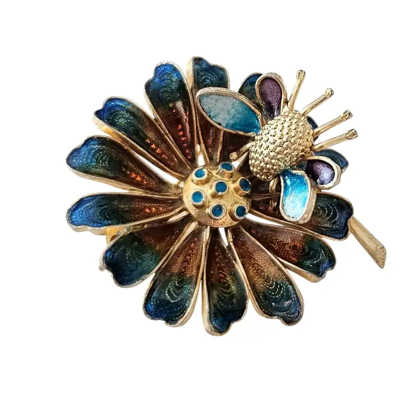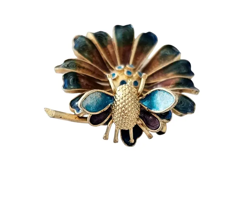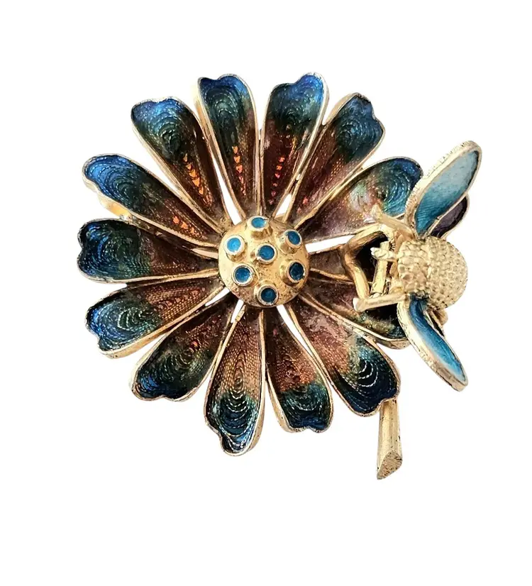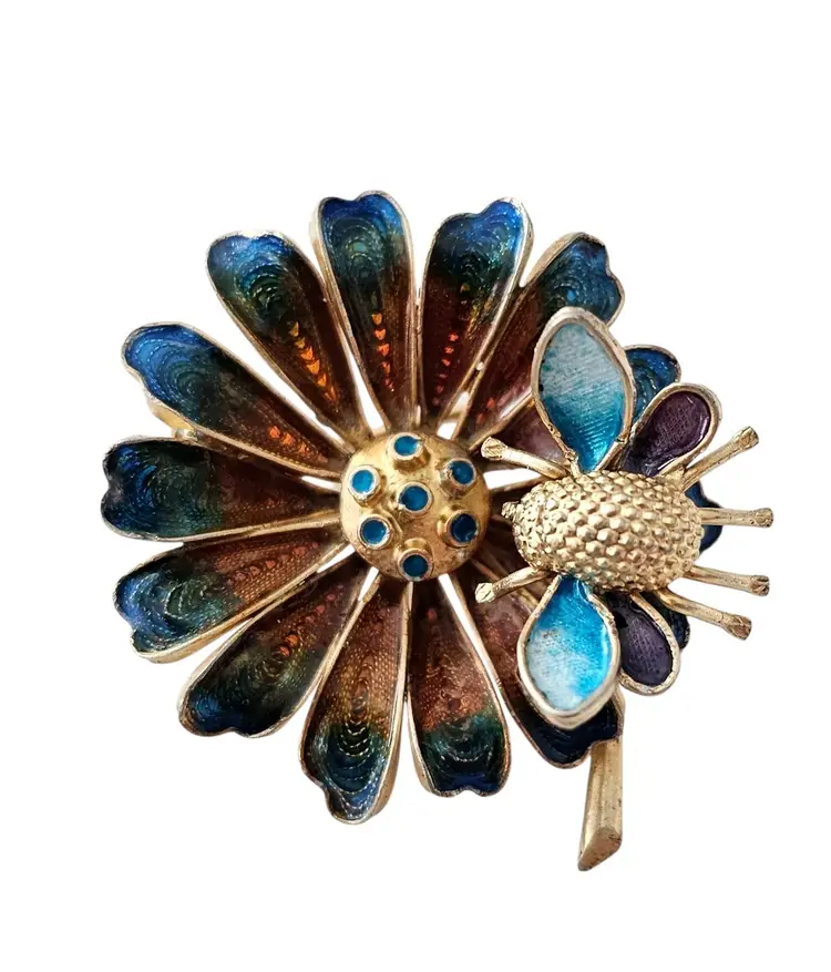 • Articulated Bug On A Flower Brooch • Vintage costume jewelry • Crafted from durable and high-quality 800 Silver base metal • Intricately decorative spun design • Blue and brown enamel details • The bug is articulated, a movable part • It moves when worn, giving a subtle movement • It measures approximately 1.28 inches in size • The back of this brooch has a straight pin and locking clasp that functions properly and is in perfect vintage condition • It is marked 800 on the reverse, affirming its silver content • Good condition • C272