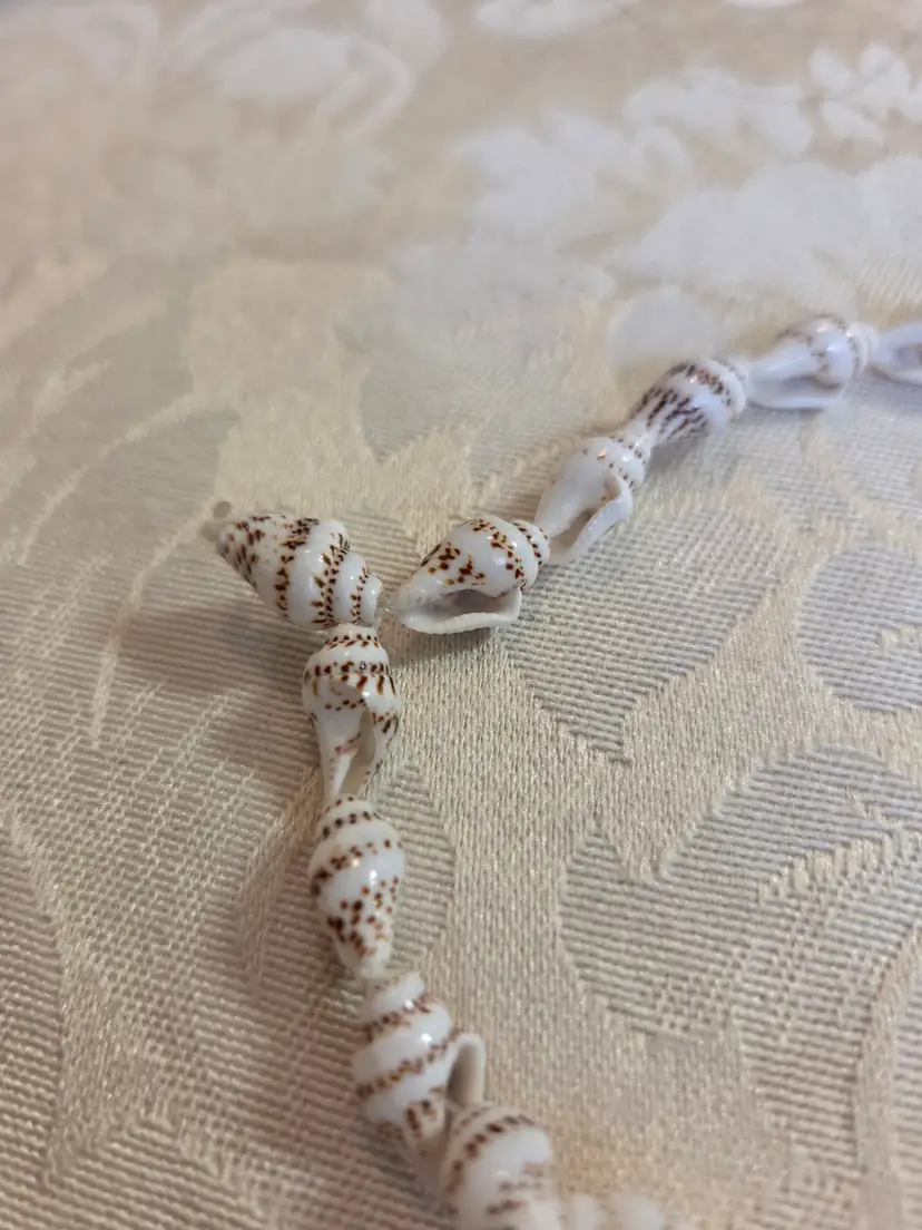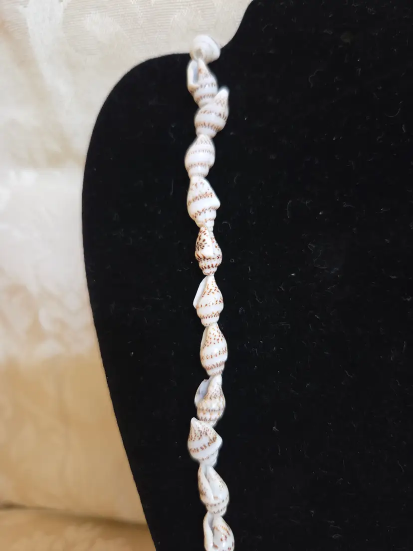 Vintage artisan made natural seashell necklace 11". Seashells are white with brown stripes.