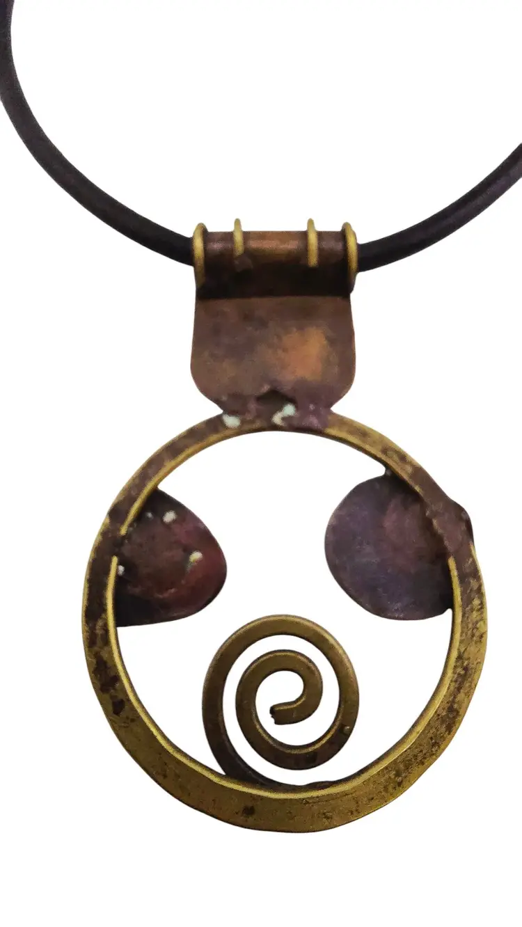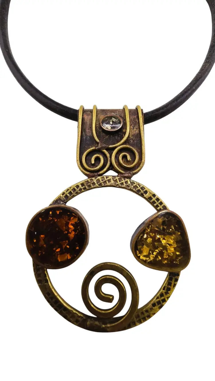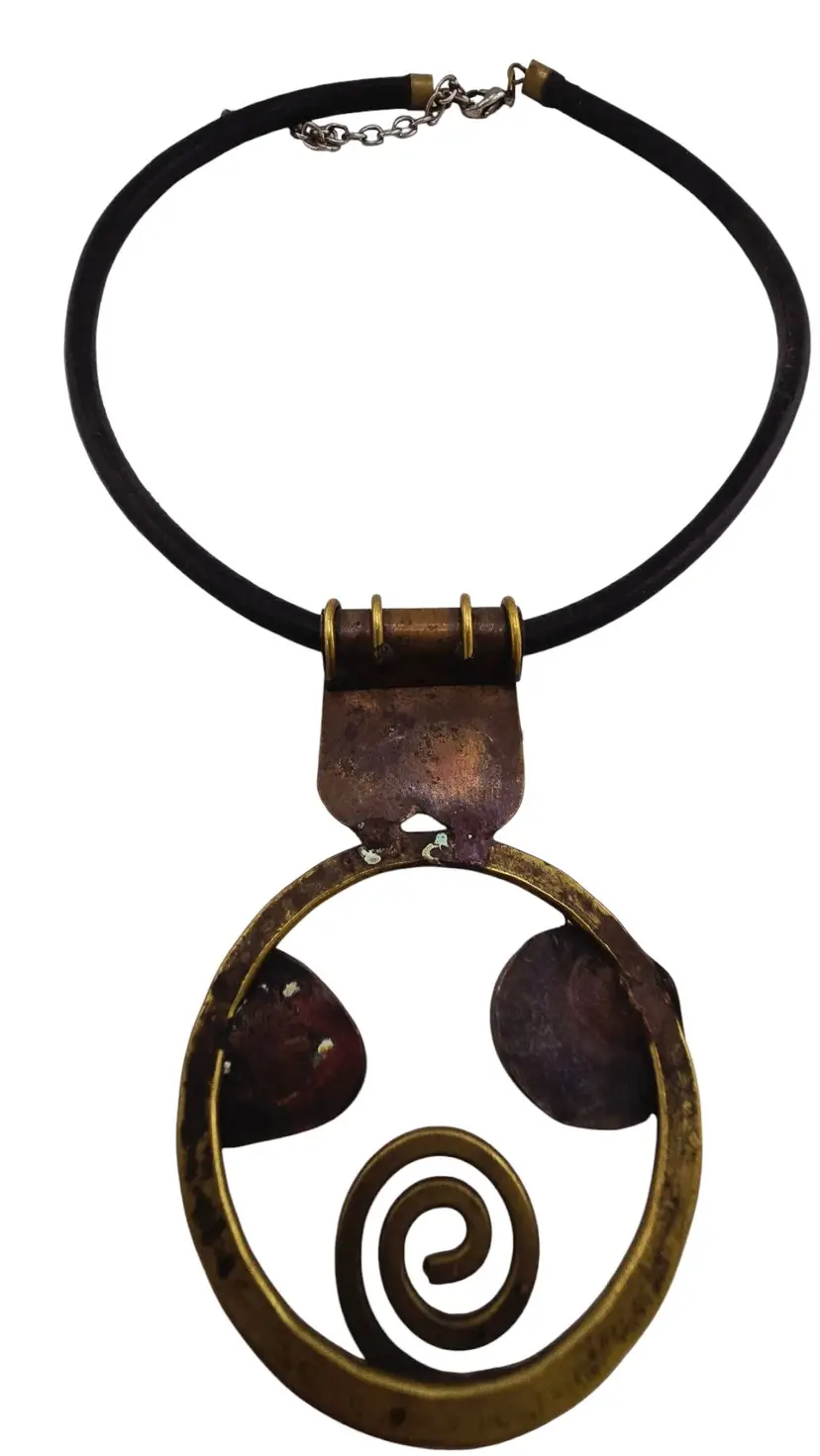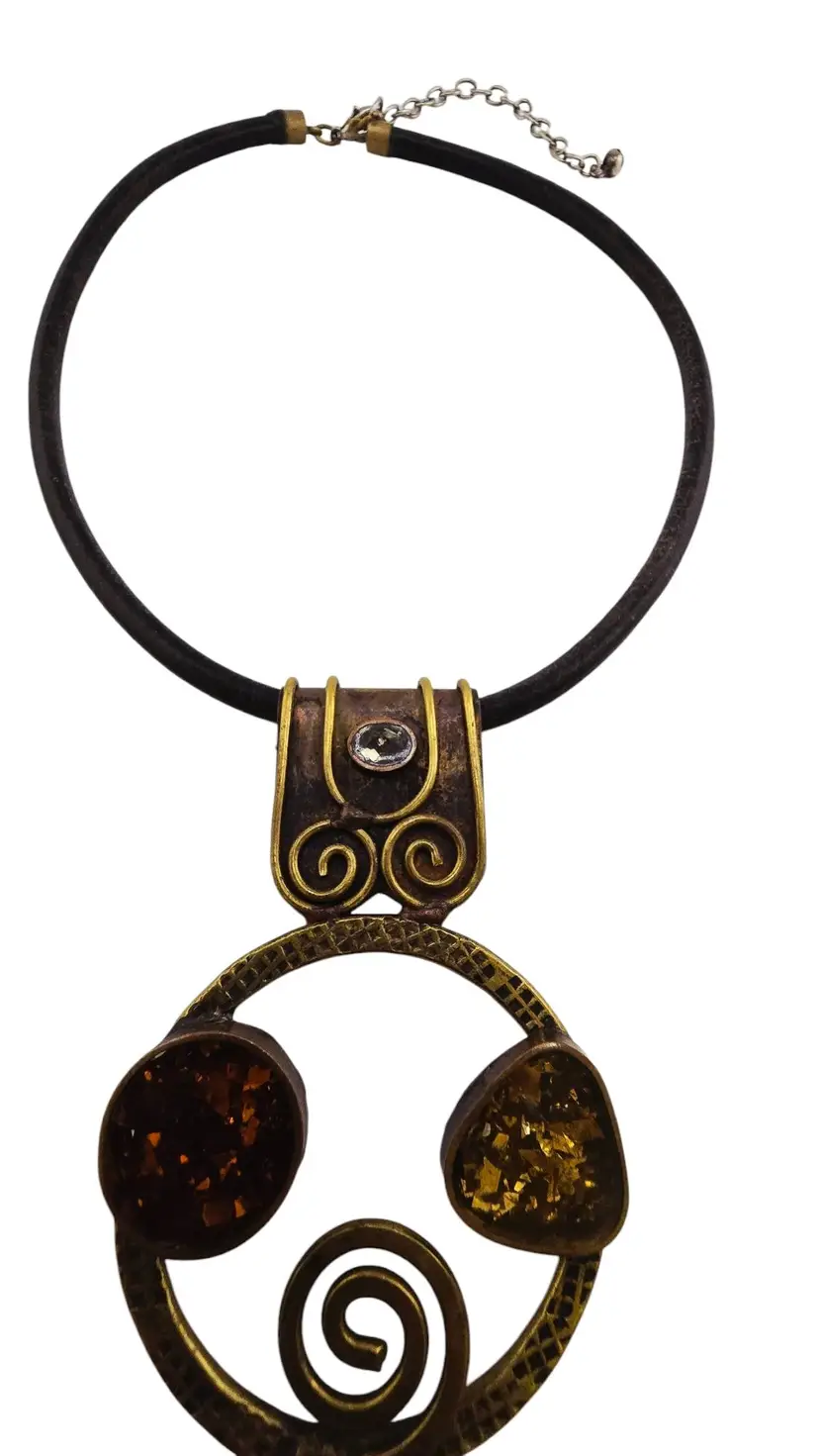 Vintage Artisan MCM Brutalist Bronze & Acrylic Pendant on Leather Necklace (A8667)