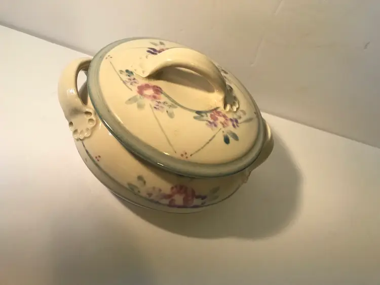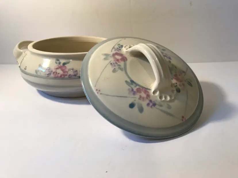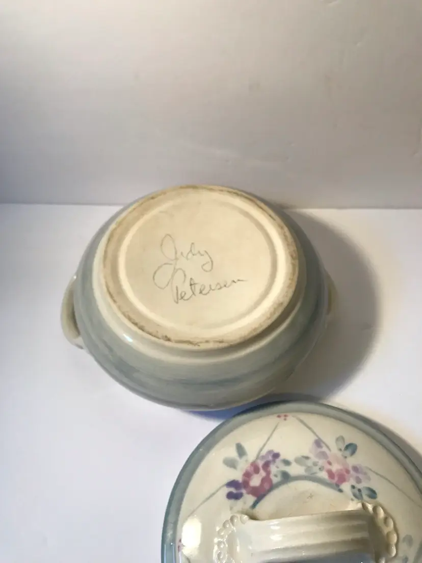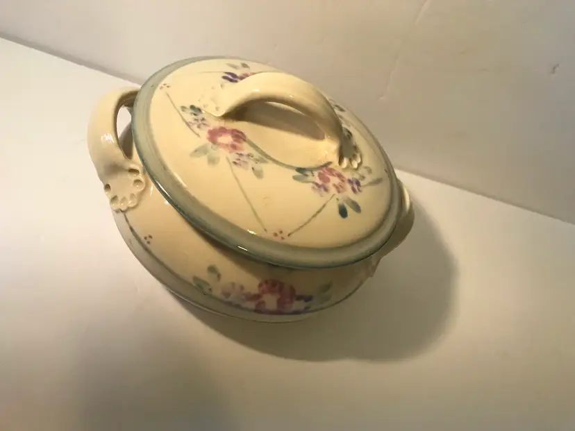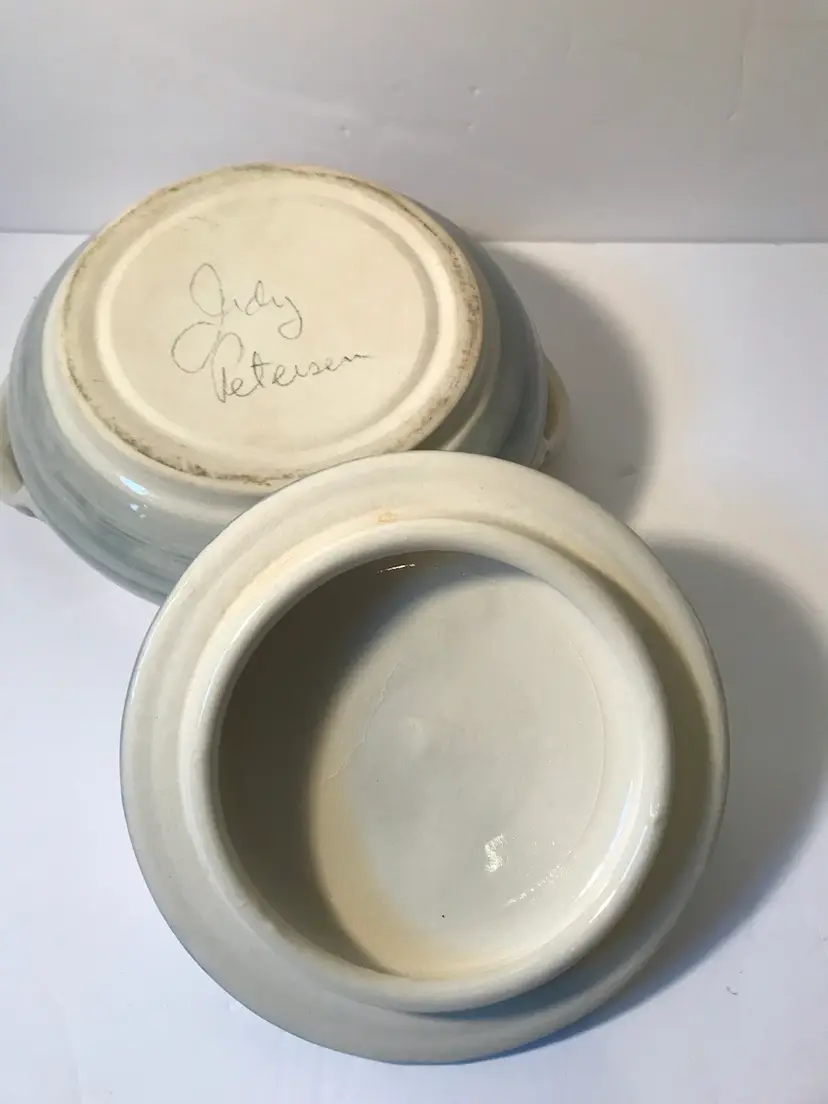 Great serving piece. It is glazed inside so it could b used. Great never used condition. About 6” around with handles.