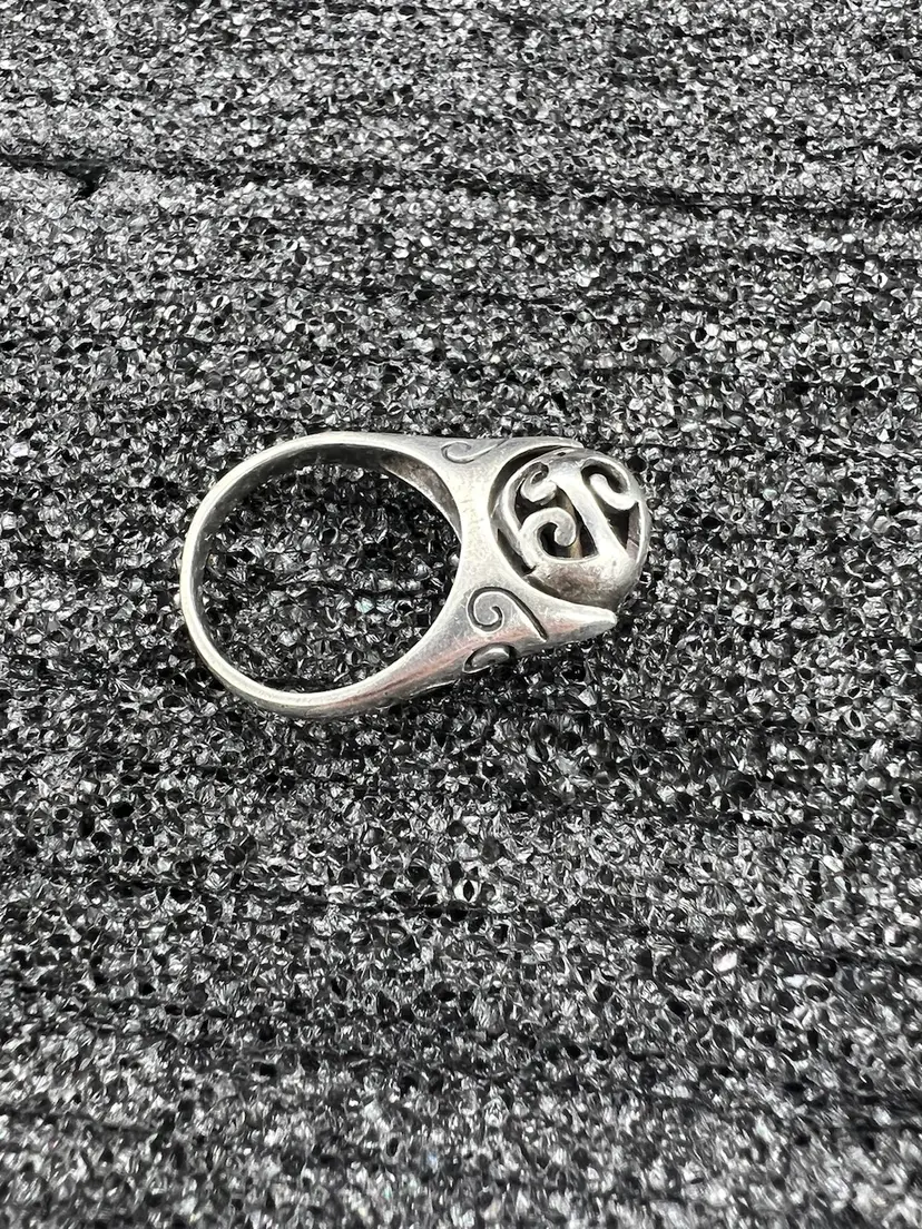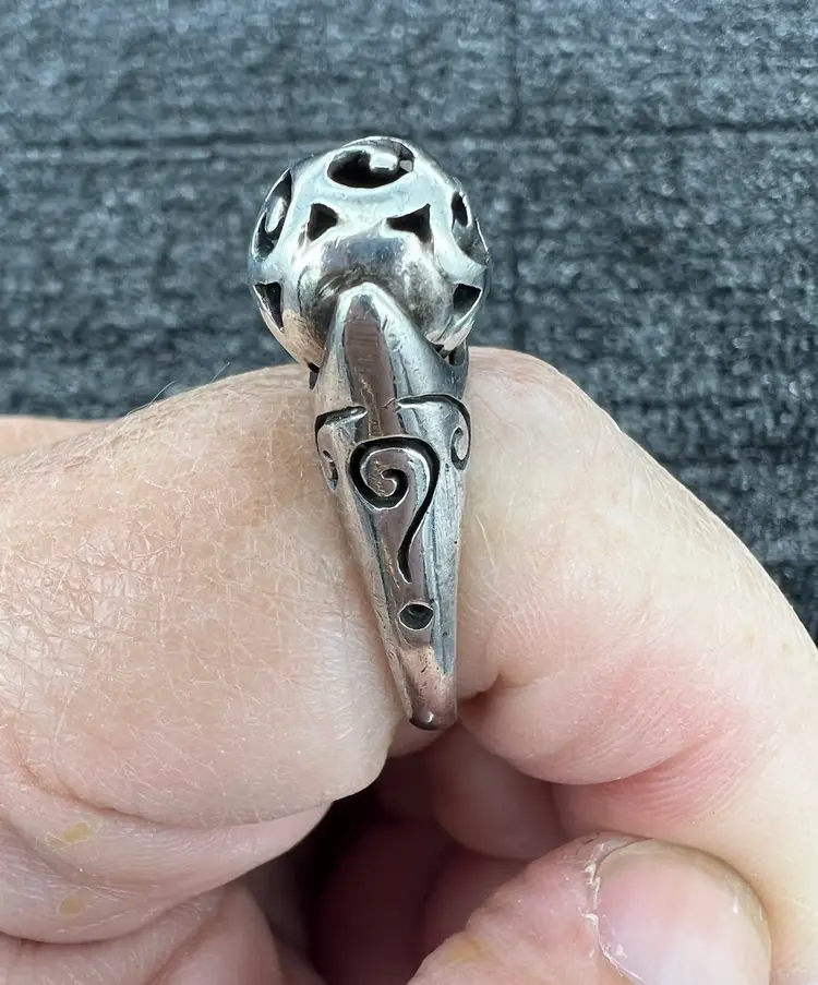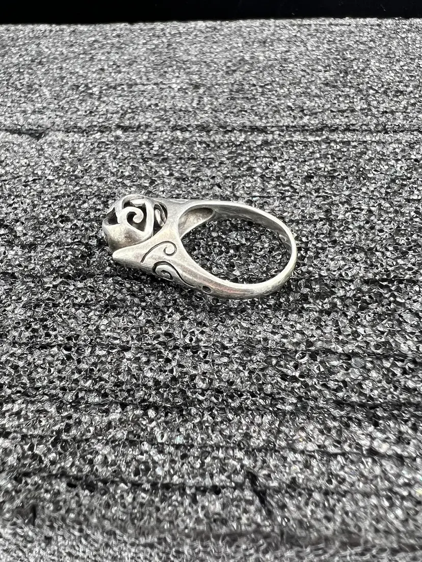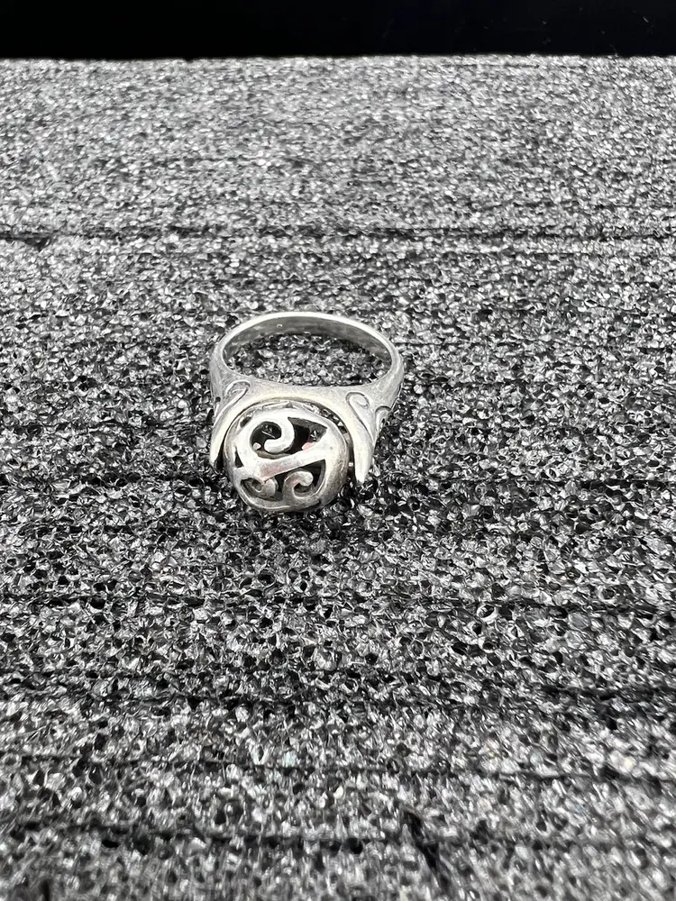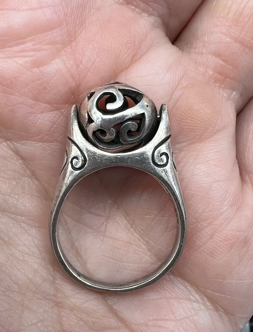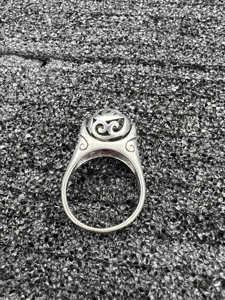 This vintage artisan sterling 925 ball spinner with filigree openwork ring is a unique addition to any jewelry collection. The ring is handcrafted with intricate details and features a beautiful spinning ball design. The sterling silver metal purity ensures durability and longevity, while the vintage style adds a touch of nostalgia. The ring is perfect for those who appreciate fine jewelry and is available in size 8.5. It is not signed. A unique one of a kind statement piece. 6.2 grams