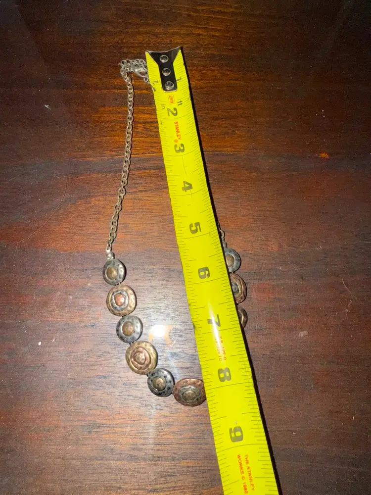 The Artisan Unsigned Mixed Metals Necklace is a vintage piece with a unique collar style design. Made of brass and stainless steel, this necklace features a hook closure and is suitable for all occasions. With its silver, bronze, and gold color, it is a statement piece perfect for both men and women. This artisan creation is not signed and is not personalized, making it a versatile addition to any jewelry collection.