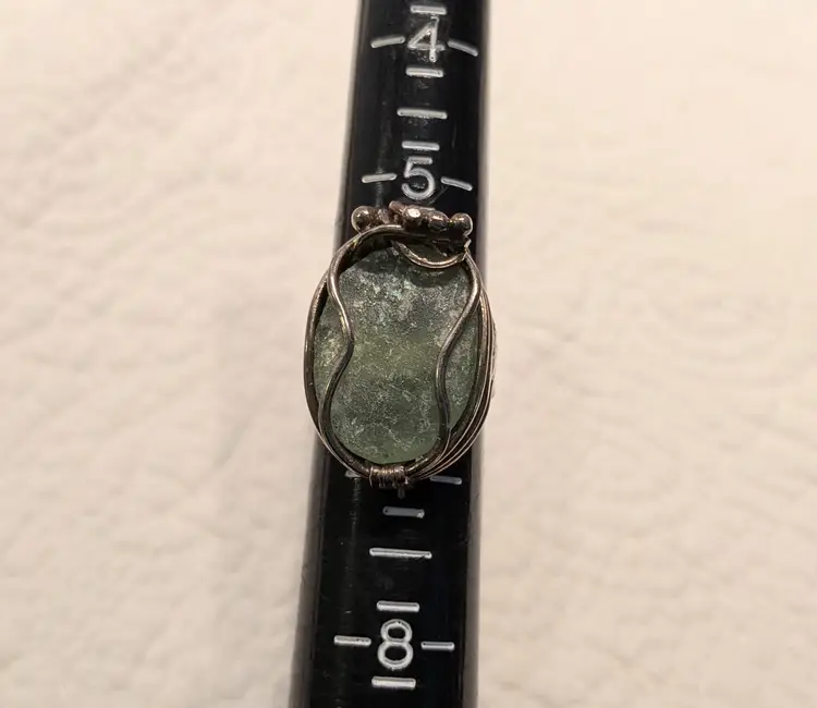 The front face of the ring is 1" long. Marked 925 with an artist seal. Interesting wire technique artfully holds the glass in place and is contrasted by a very simple band.
