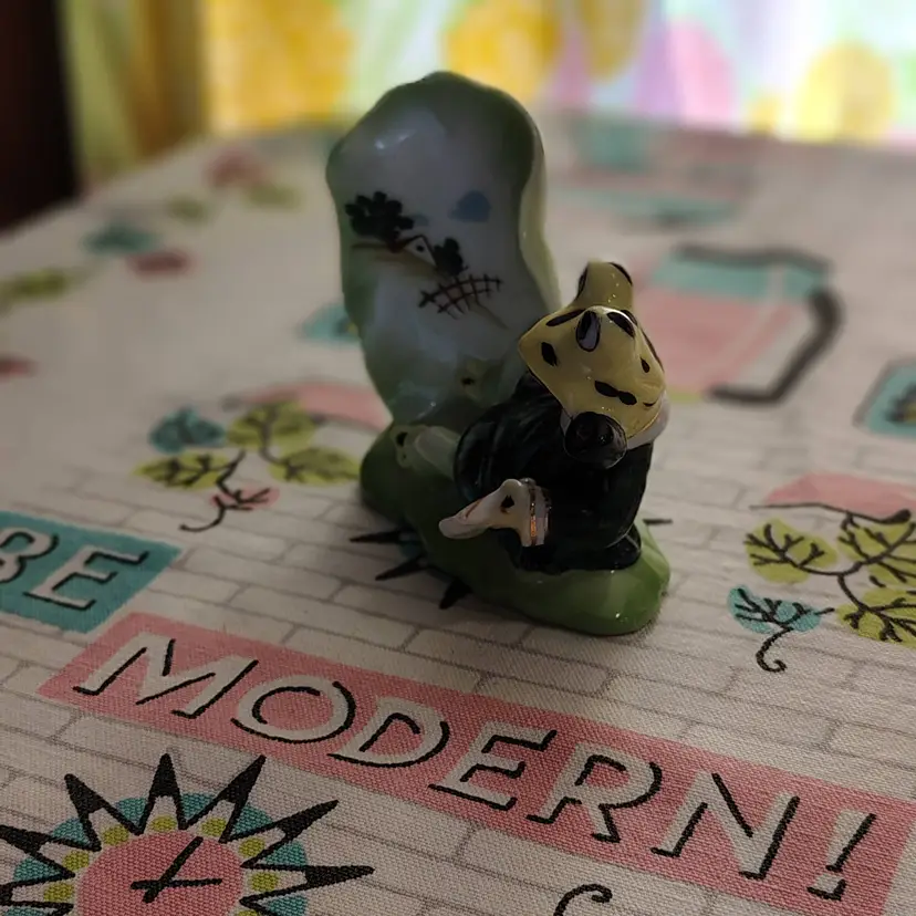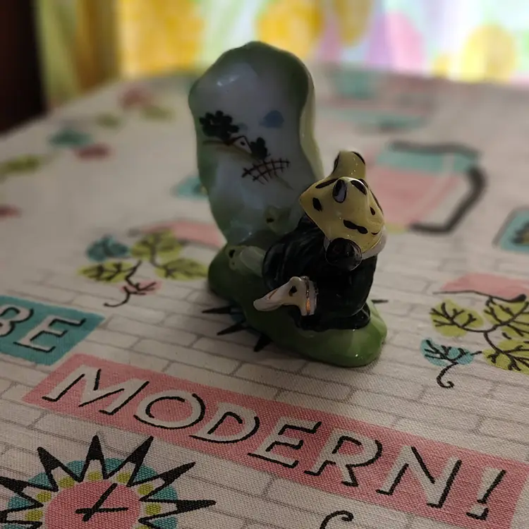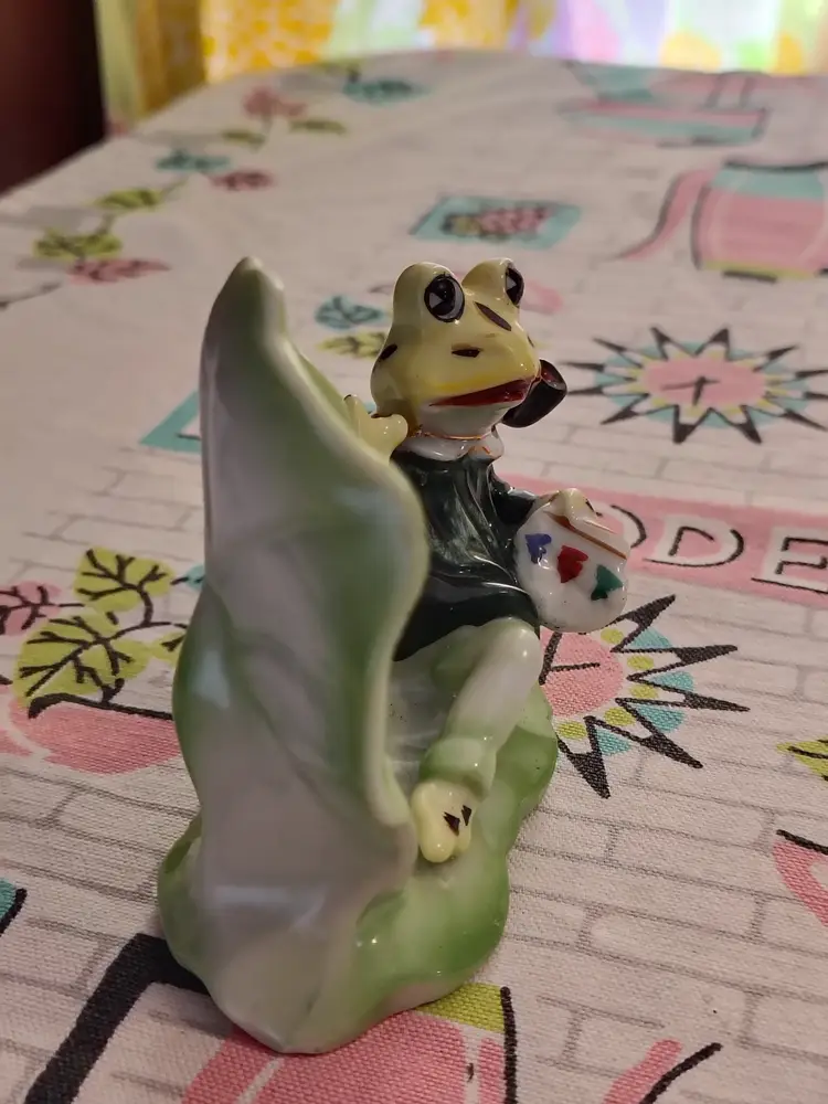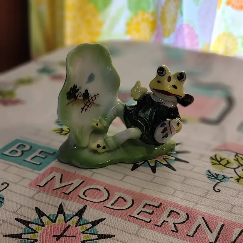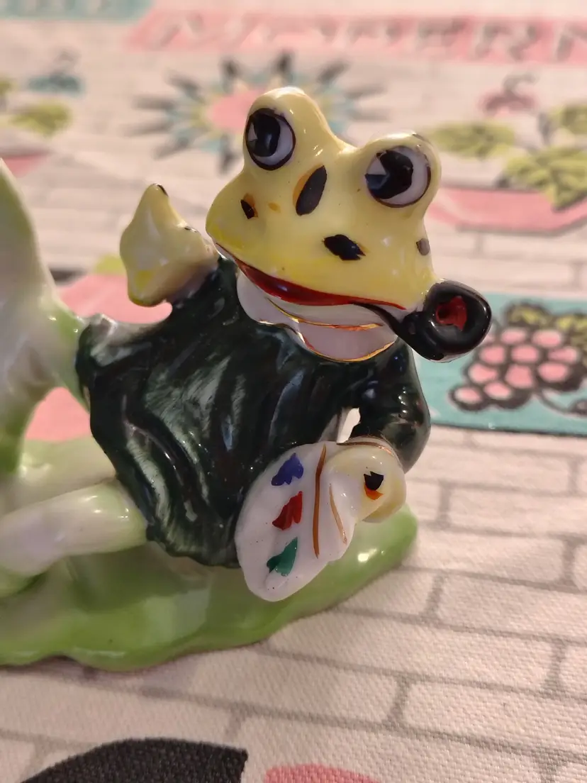 This is a vintage figurine of a very fine frog! Made in Japan, probably during the mid 1950s, this happy little hopper was crafted from a light-weight porcelain, and hand painted. He is posed reclining in his smock, but with his painter's palette still in hand. Perhaps he is taking a break, to smoke his pipe and admire his work. He has used a large lily pad as his canvas, and has painted a little country cottage on a hill. Truly a great artist! Condition: This frog is in excellent shape! He has no chips, cracks, repairs, or any other damage that I could find. A lot of his details were added in cold-paint, which is prone to wear over time, but his paint is nearly completely intact, with hardly a missing speckle. I don't often say this, but he's honestly nearly perfect. Size: He measures 3½" across, is 1¾" wide, and sits nearly 3½" tall.
