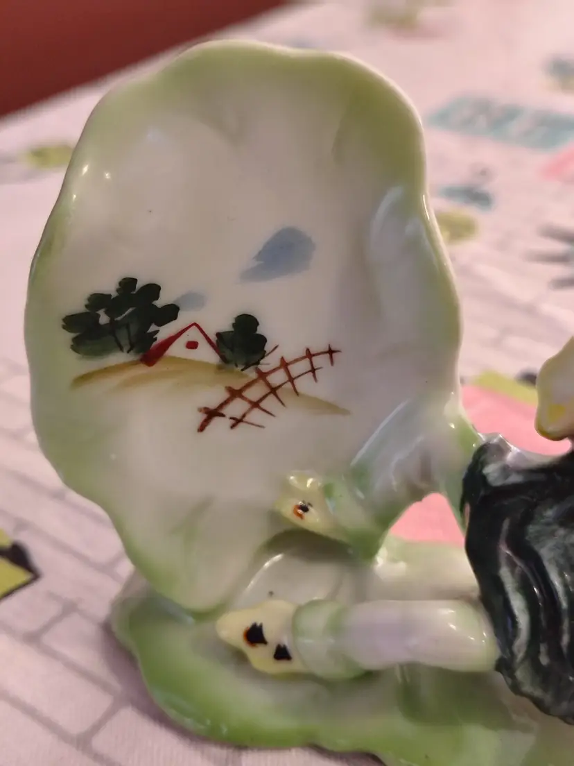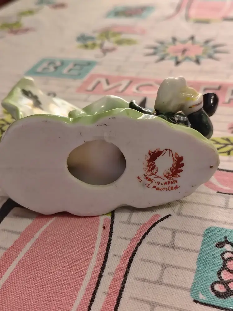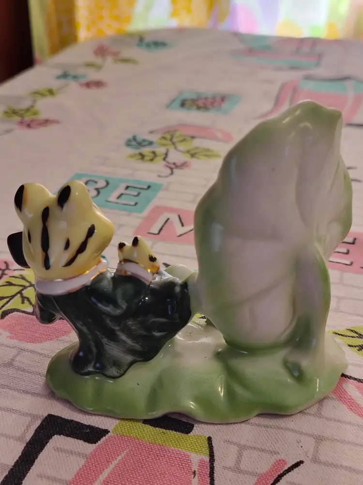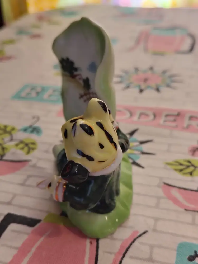 This is a vintage figurine of a very fine frog! Made in Japan, probably during the mid 1950s, this happy little hopper was crafted from a light-weight porcelain, and hand painted. He is posed reclining in his smock, but with his painter's palette still in hand. Perhaps he is taking a break, to smoke his pipe and admire his work. He has used a large lily pad as his canvas, and has painted a little country cottage on a hill. Truly a great artist! Condition: This frog is in excellent shape! He has no chips, cracks, repairs, or any other damage that I could find. A lot of his details were added in cold-paint, which is prone to wear over time, but his paint is nearly completely intact, with hardly a missing speckle. I don't often say this, but he's honestly nearly perfect. Size: He measures 3½" across, is 1¾" wide, and sits nearly 3½" tall.