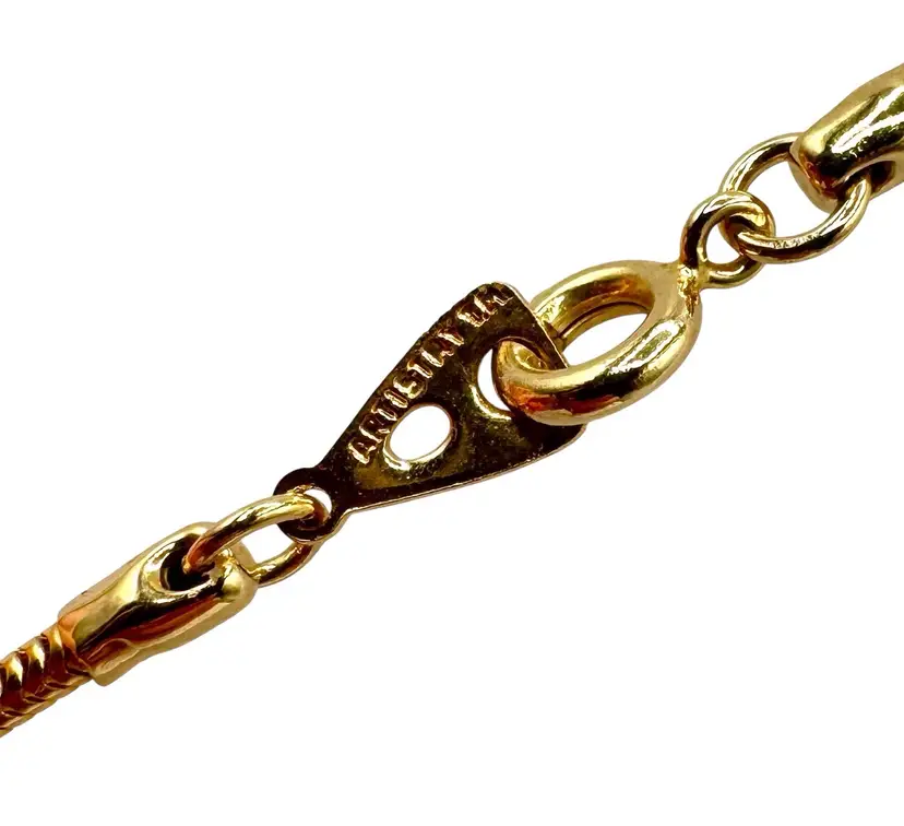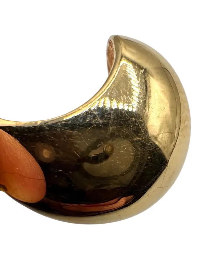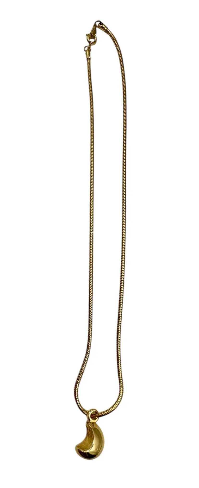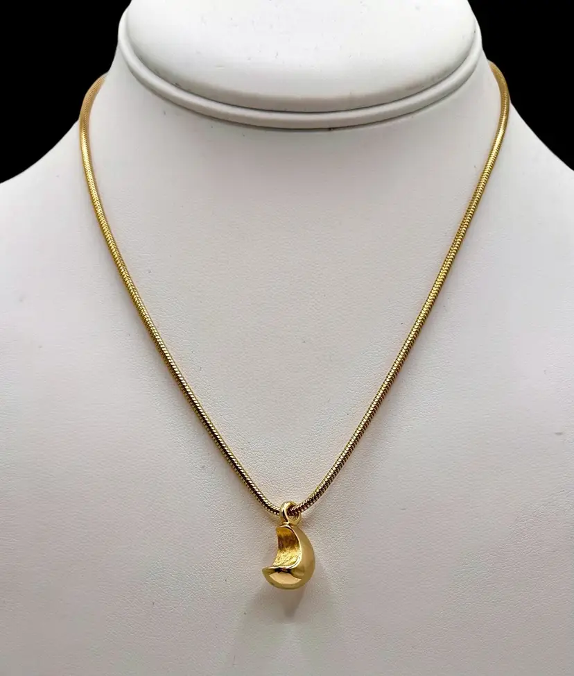 Gold tone necklace with a moon shaped pendant. The moon faces front to back and not side to side.