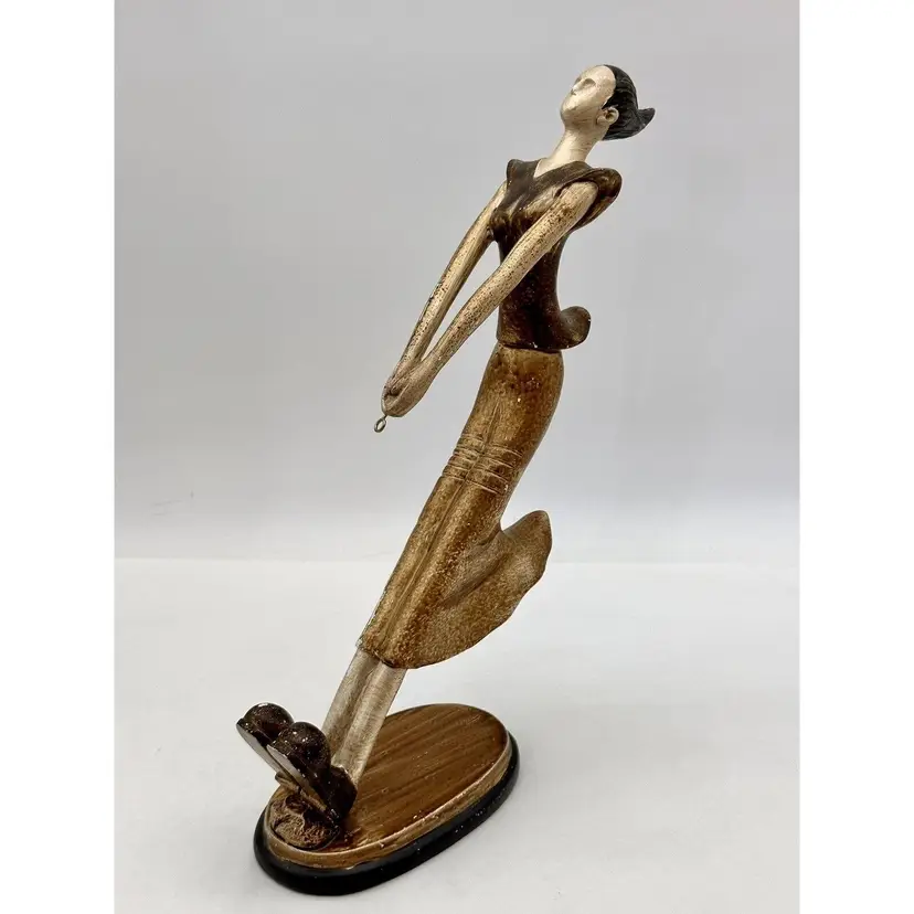 This piece features a modern woman in an Art Deco style who would be leaning back and digging her heels in to gain control of her unruly dog.