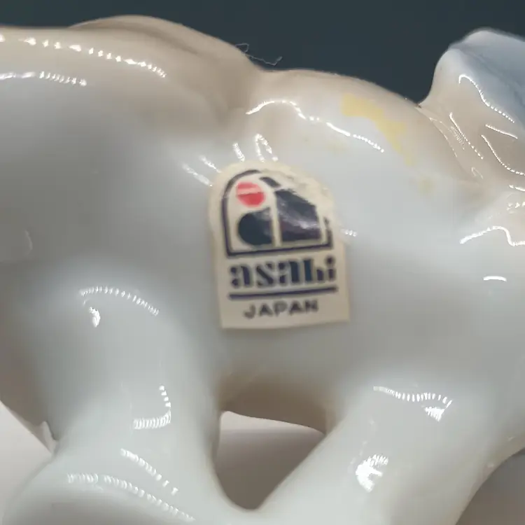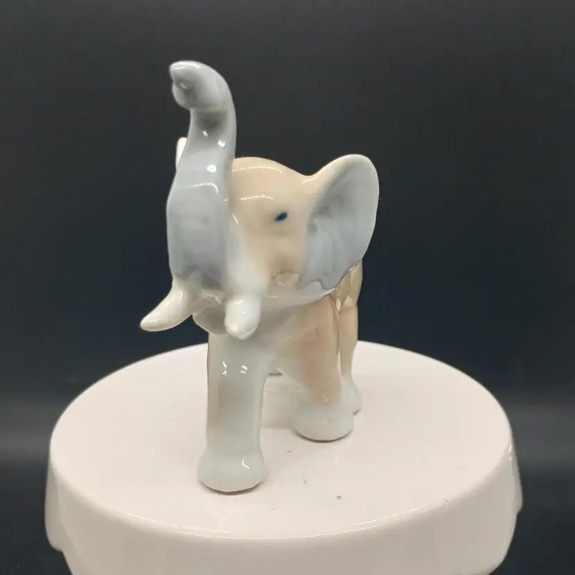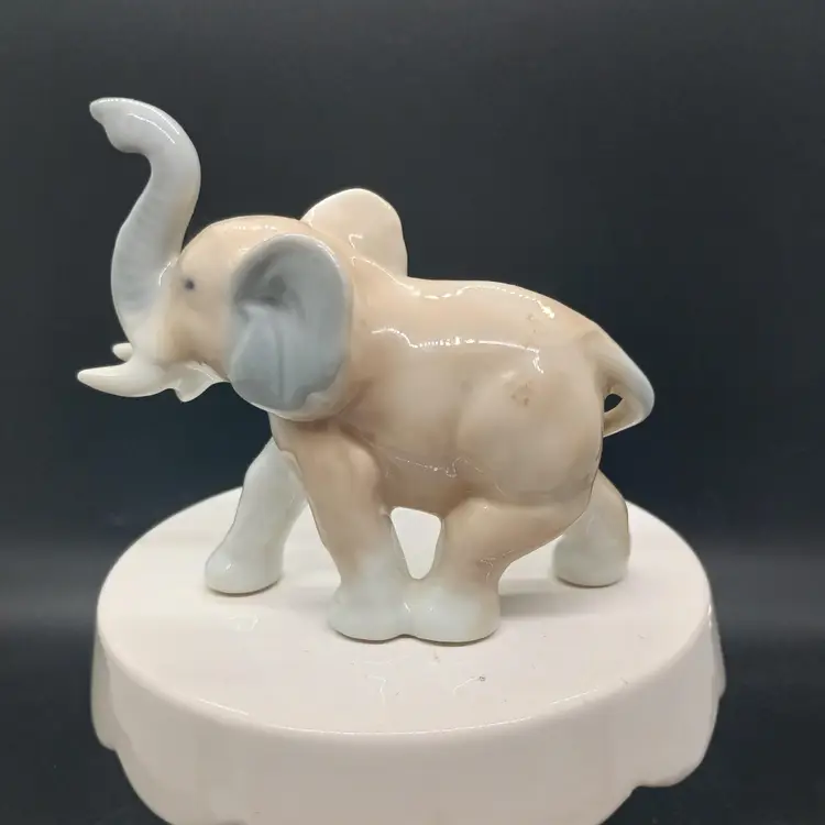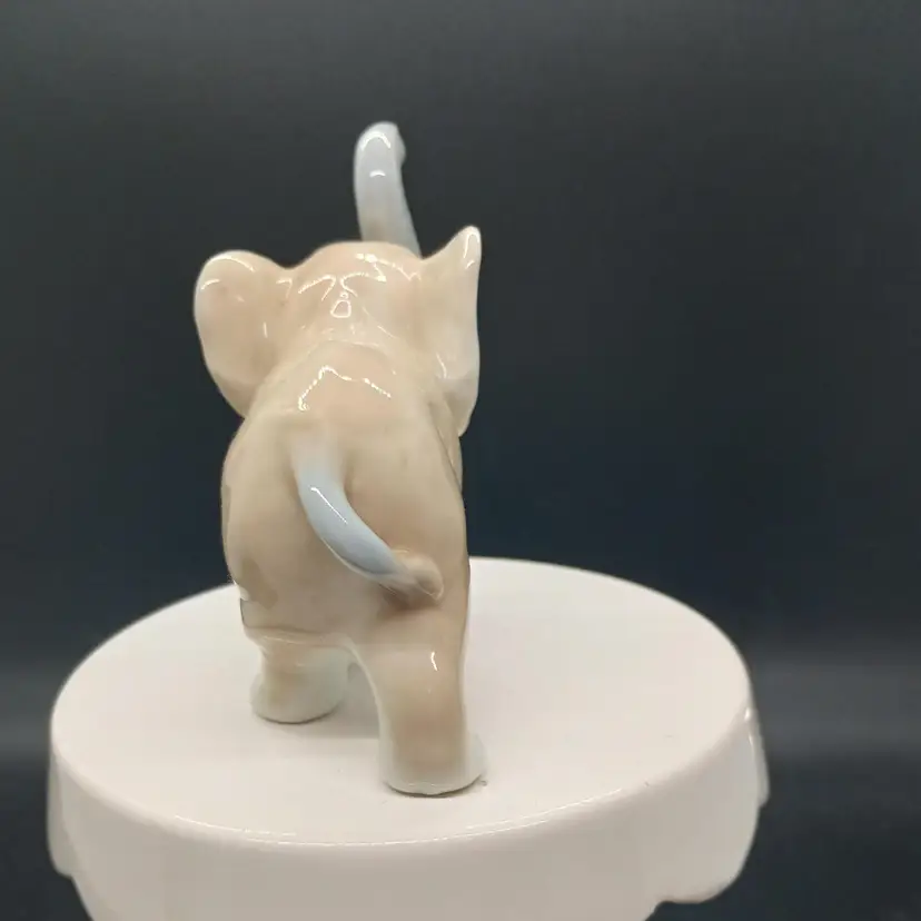Well executed elephant with trunk up and original sticker. The elephant is 3 3/4 tall by 4 1/4 inches long by 2 in wide. There are no chips or cracks to this elephant. (B)