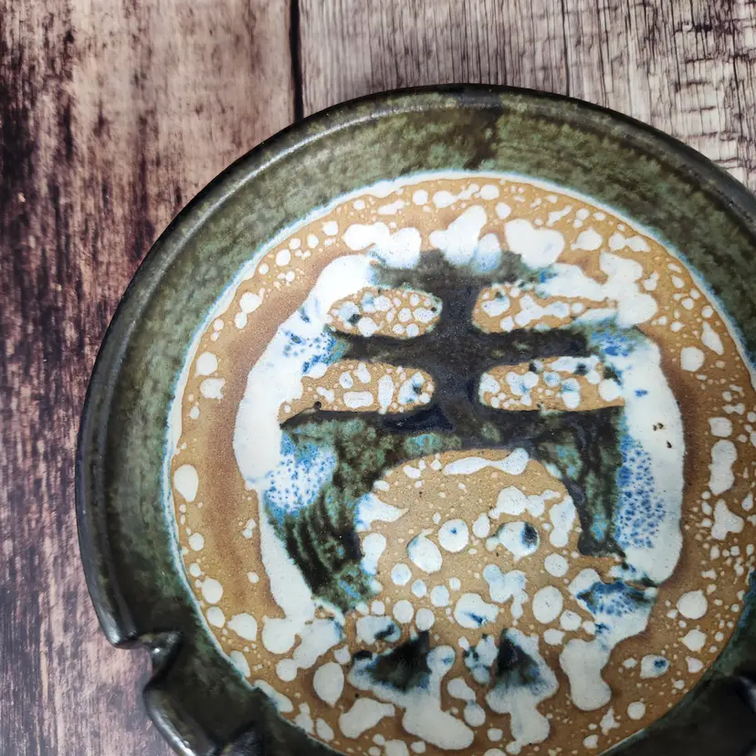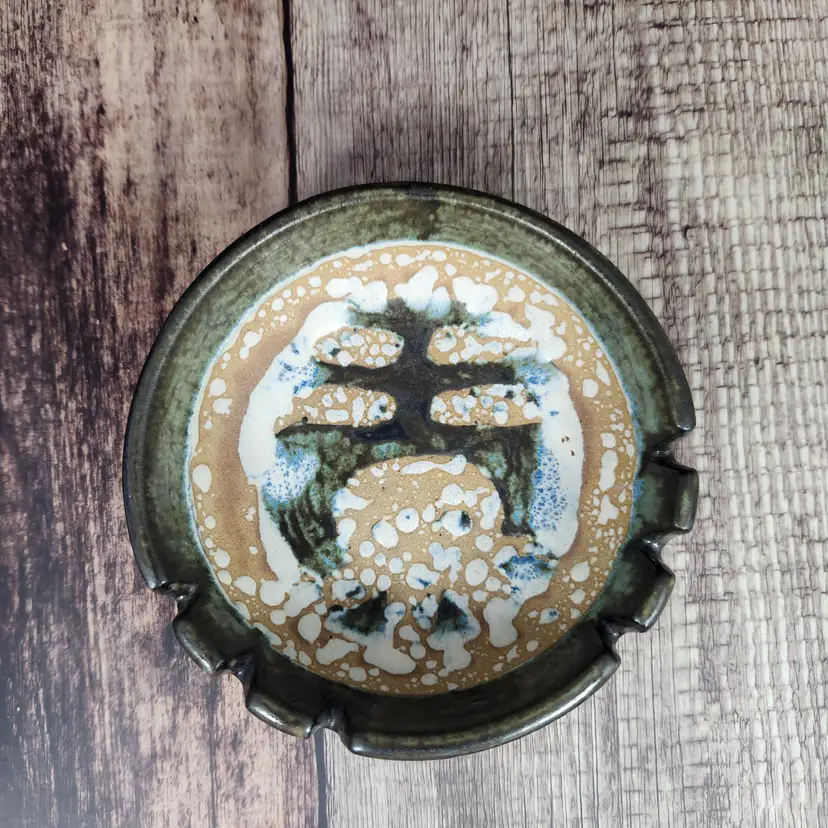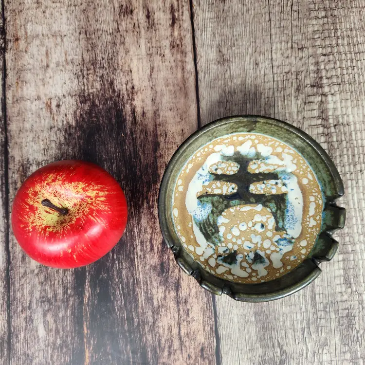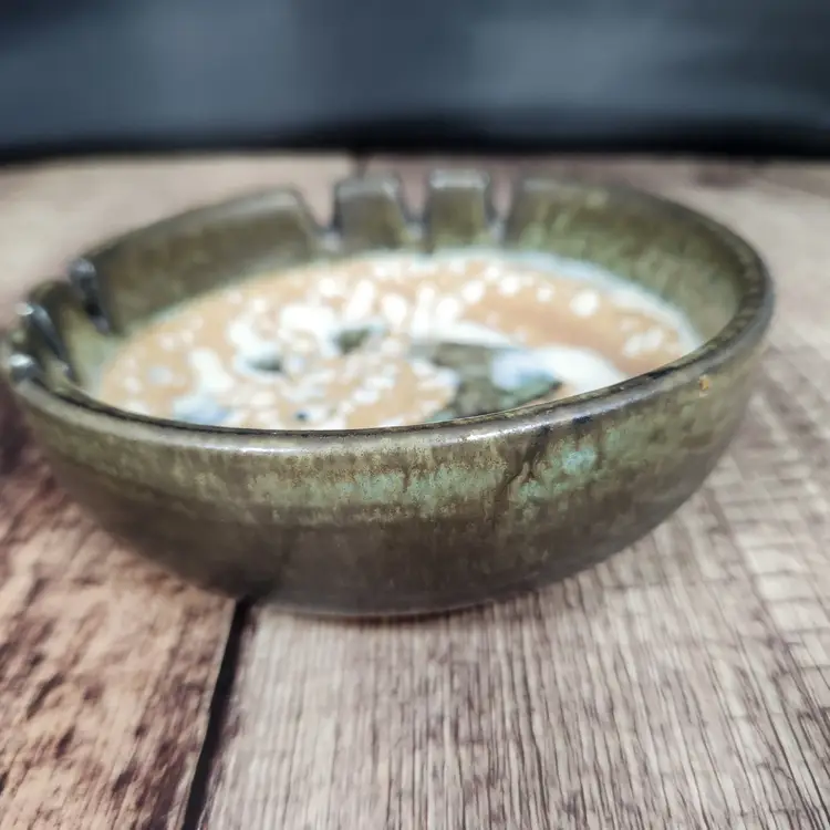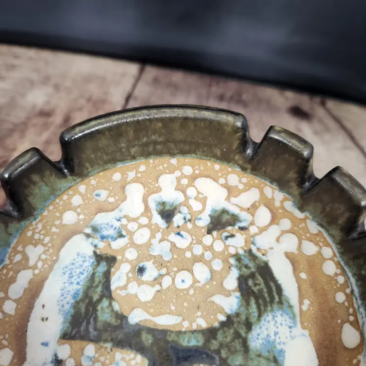 Lovely Lapid Pottery cigar or cigarette ashtray made in Israel. It is hard to see in the photos but the border of the tray is a pretty olive green tone, the design on the bowl of the piece is blackish. Lapid Pottery was in business from the 1940s until 1990 so it is at least that old, being an ashtray I am guessing it is older than that. Lapid pottery was designed with Scandinavian influences and hand painted so each piece is unique, most of the artists were women.