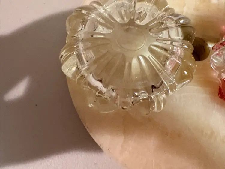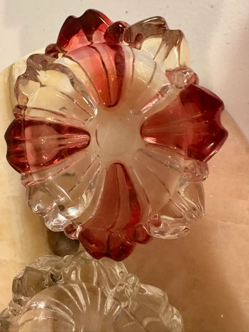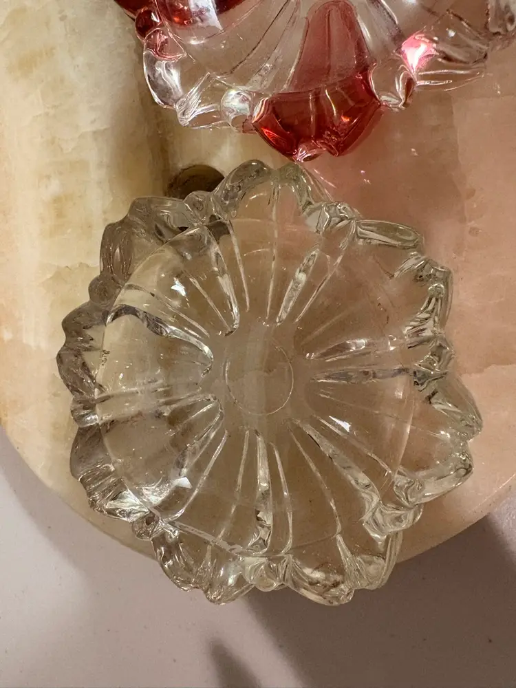 Two small vintage ashtrays or trinket dishes. One is clear glass and the other has cranberry flashing. No chips and the flash is in perfect condition. Each measures 3 1/2” across.