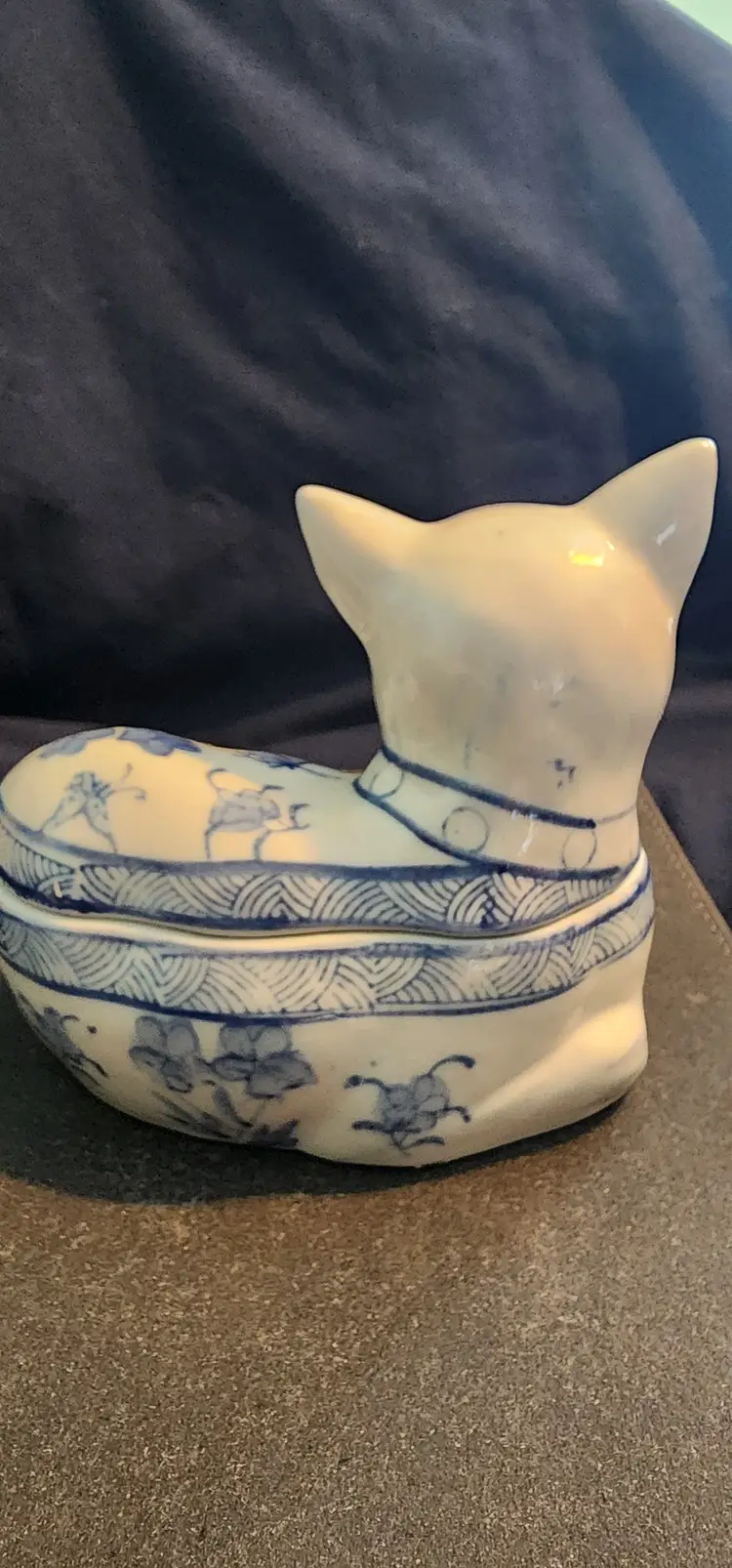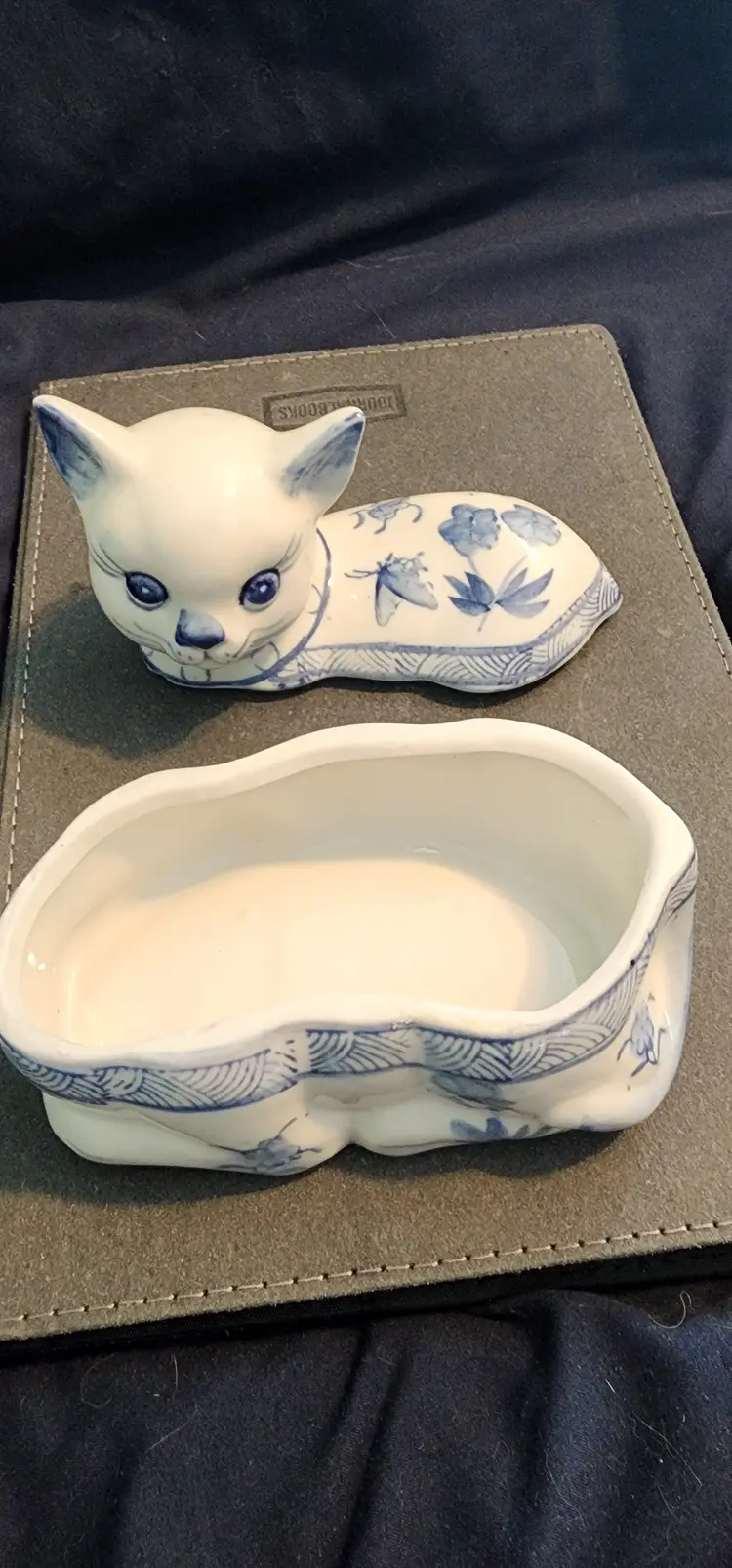 This trinket box is a very sweet blue and white kitten. It has been designed in the delft style. There are a few dings on the bottom, I included a picture of the bottom. It measures 5 inches wide and 4.25 tall.