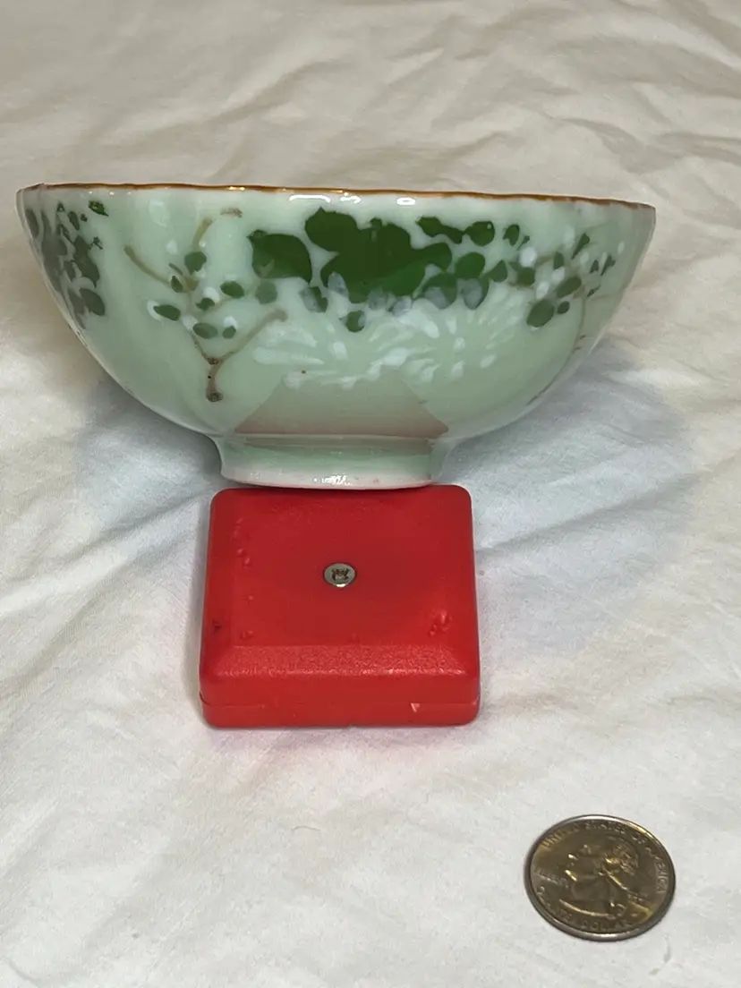 This porcelain piece is hand painted with a dark green and white flower motif.