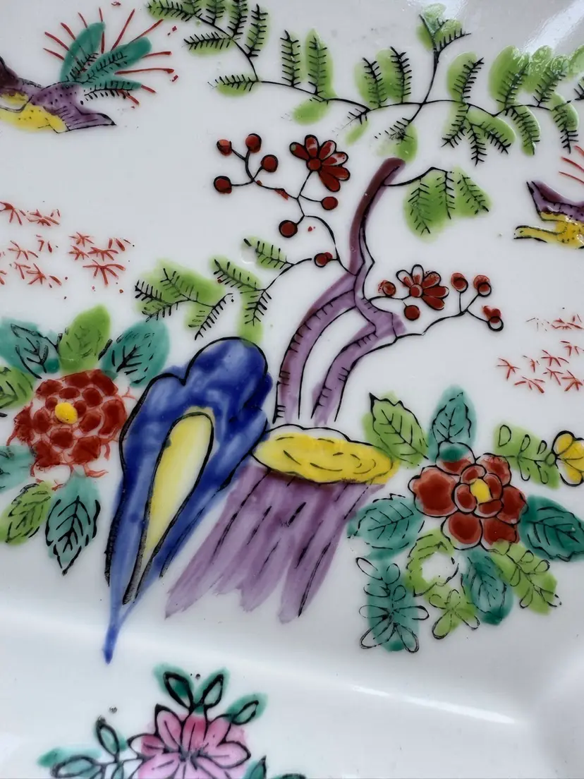 Enhance your dining experience with this exquisite decorative porcelain plate. Featuring a vibrant floral and bird design, this plate adds a touch of elegance to any table setting. The intricate patterns in green, blue, and pink make it a standout piece for your home dining collection.