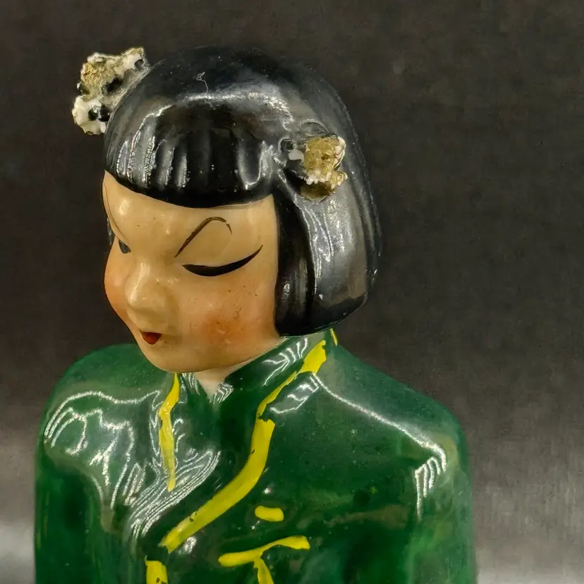 The spaghetti detail in the girls hair has some damage. Otherwise, in good condition. Approximately 6” tall.