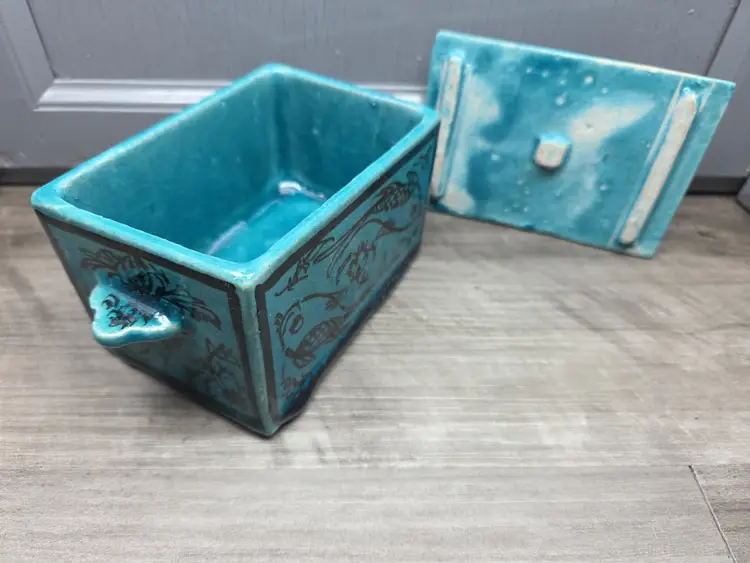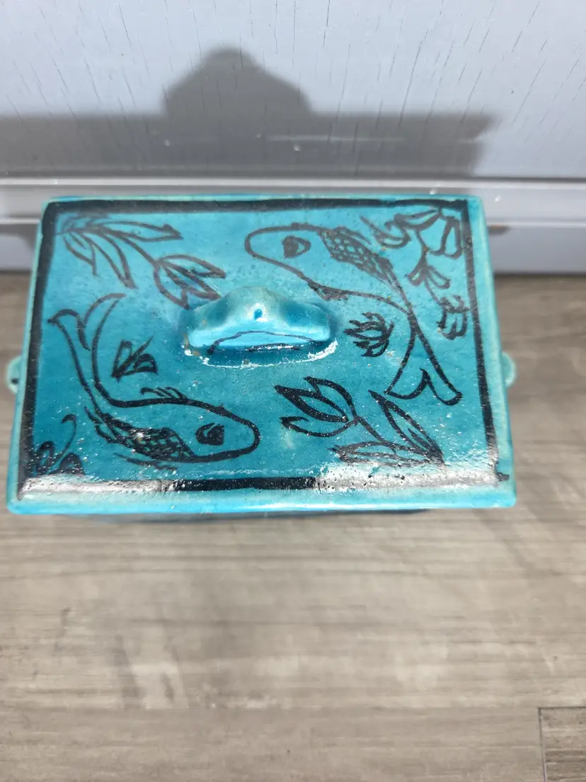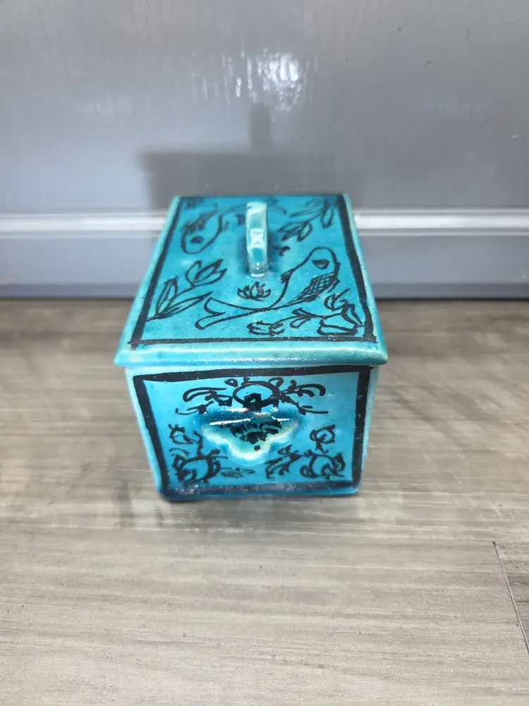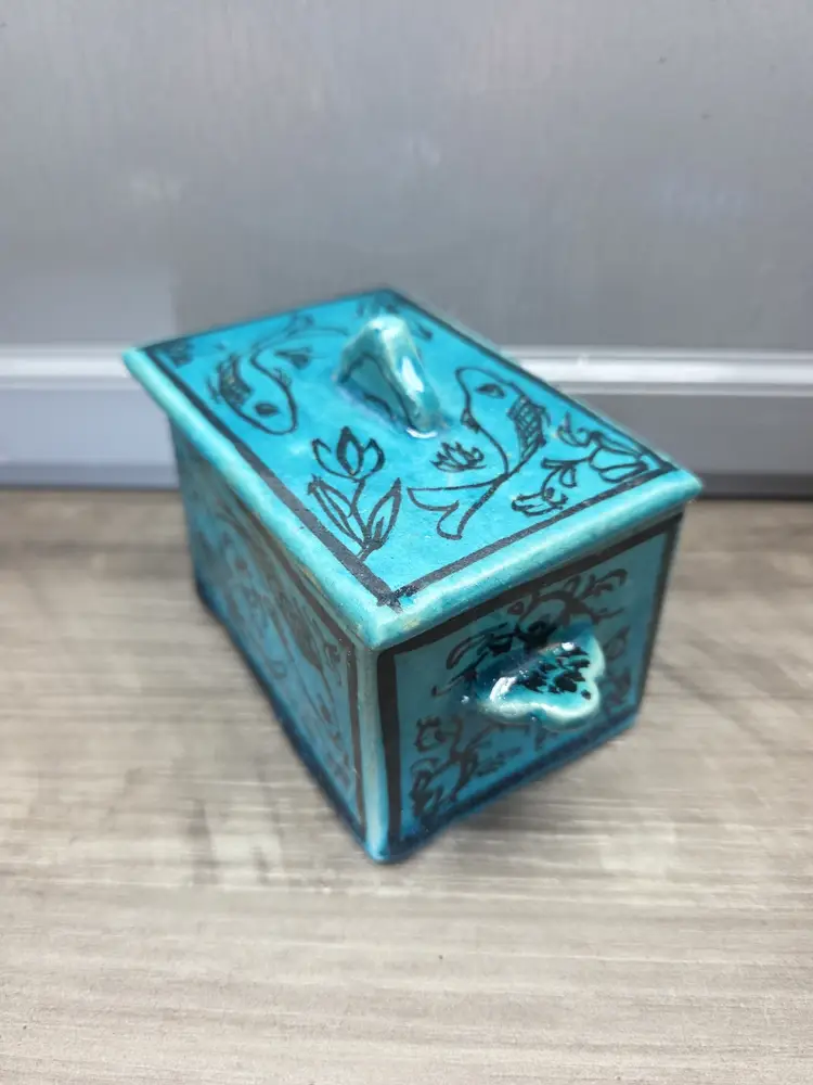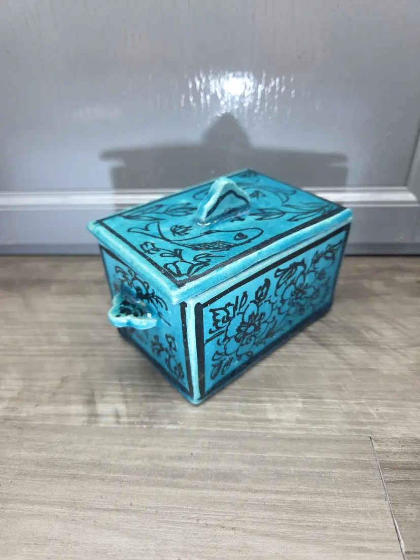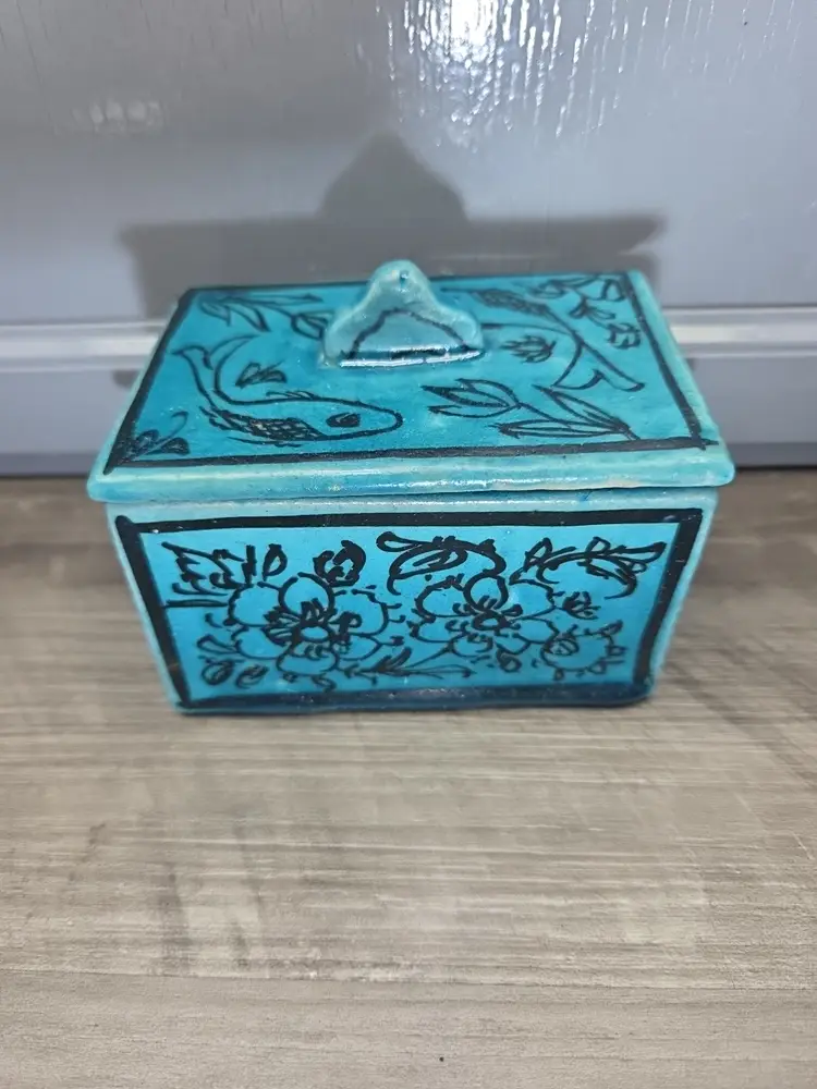 This vintage Asian inspired trinket box is a beautifully hand-painted ceramic or porcelain piece, featuring a rectangular shape with a decorative blue color. The intricate design of flowers and fish adds an artistic touch, making it suitable for any room and occasion. This handmade trinket box is a unique and original piece that can be used as a keepsake box for teens or adults. Its glazed finish and hand-painted details add to its charm, while its small size makes it easy to display on a window or piece of furniture. Ideal for collectors of decorative items, this trinket box is a beautiful addition to any home.