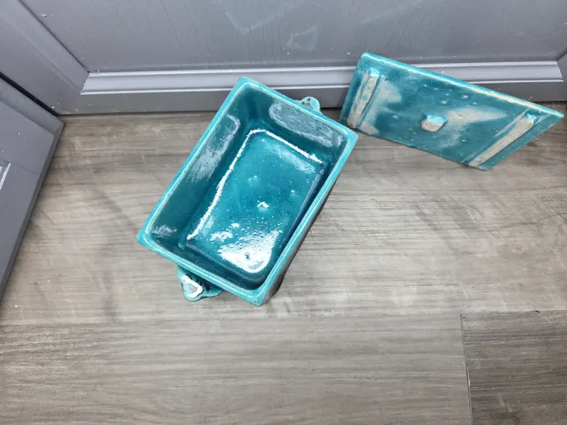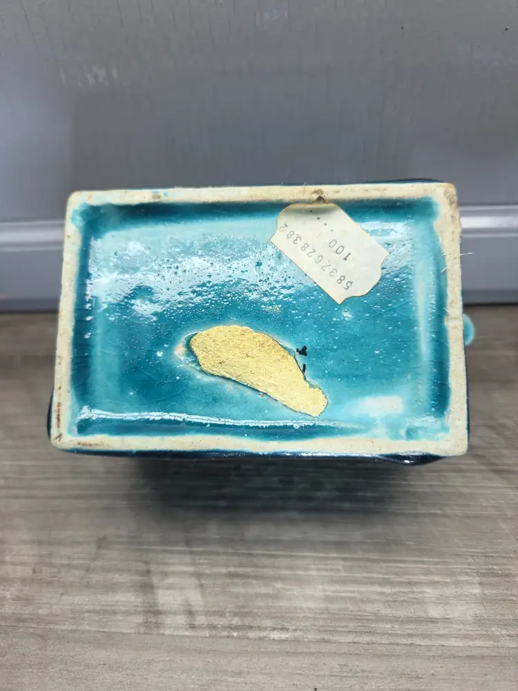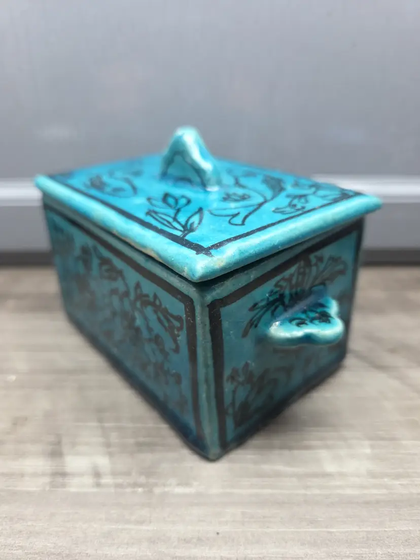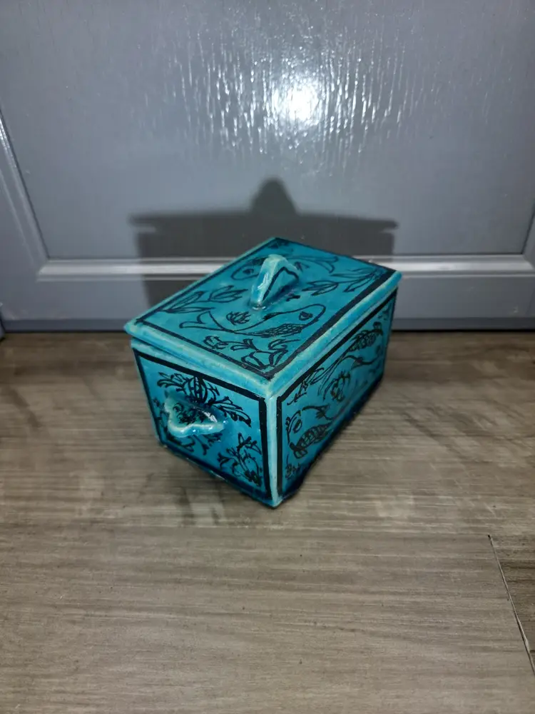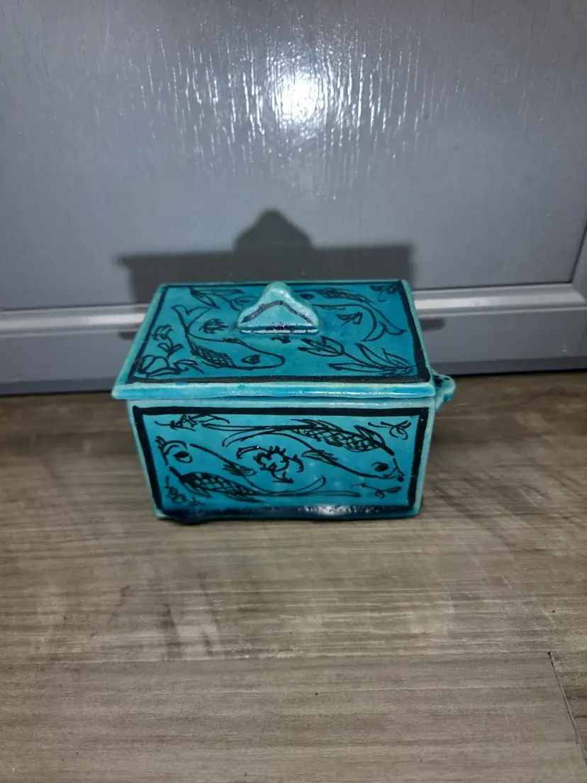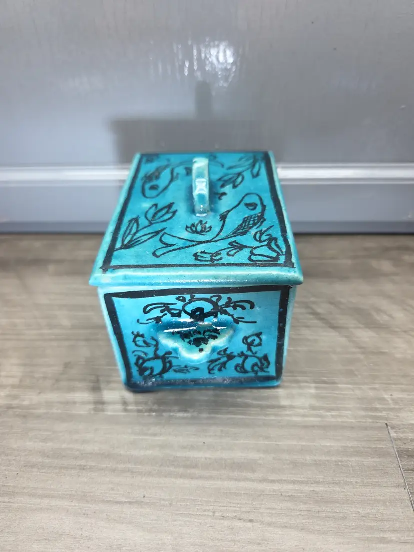 This vintage Asian inspired trinket box is a beautifully hand-painted ceramic or porcelain piece, featuring a rectangular shape with a decorative blue color. The intricate design of flowers and fish adds an artistic touch, making it suitable for any room and occasion. This handmade trinket box is a unique and original piece that can be used as a keepsake box for teens or adults. Its glazed finish and hand-painted details add to its charm, while its small size makes it easy to display on a window or piece of furniture. Ideal for collectors of decorative items, this trinket box is a beautiful addition to any home.
