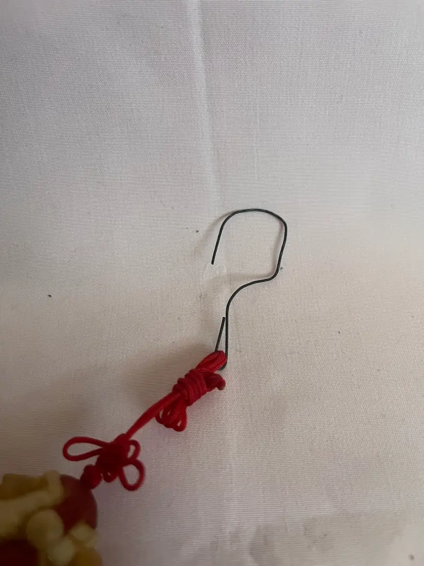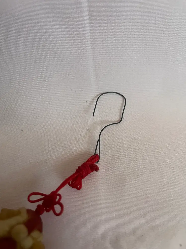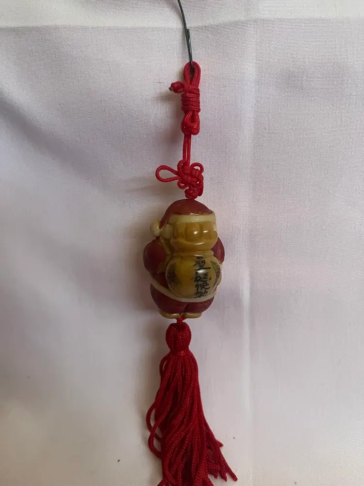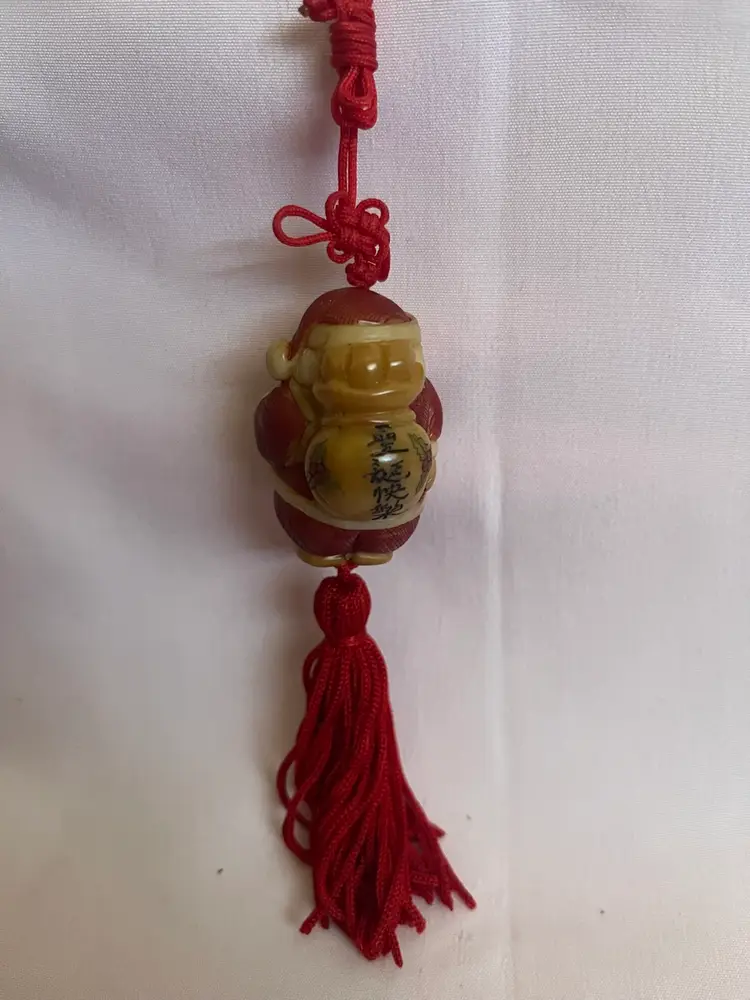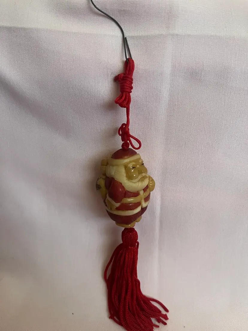 Red santa with tassel and hook thrifted find I don’t know what’s written on it