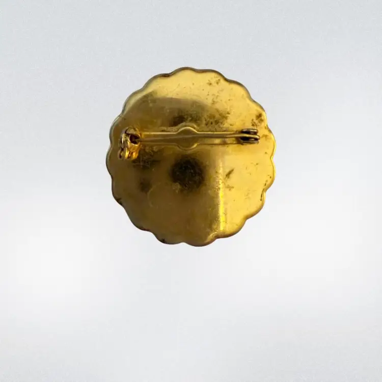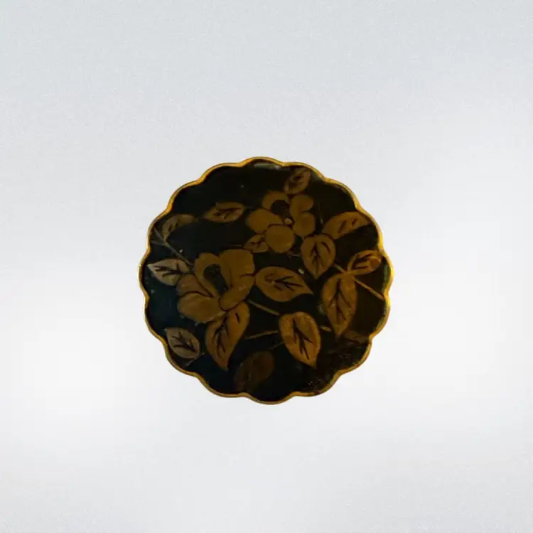 Scalloped edges. Gold tone back with good working clasp. Front with black background and gold toned flowers.