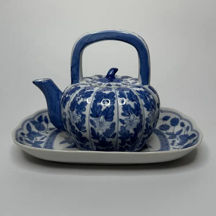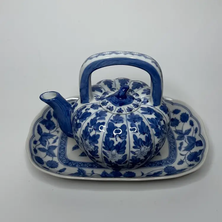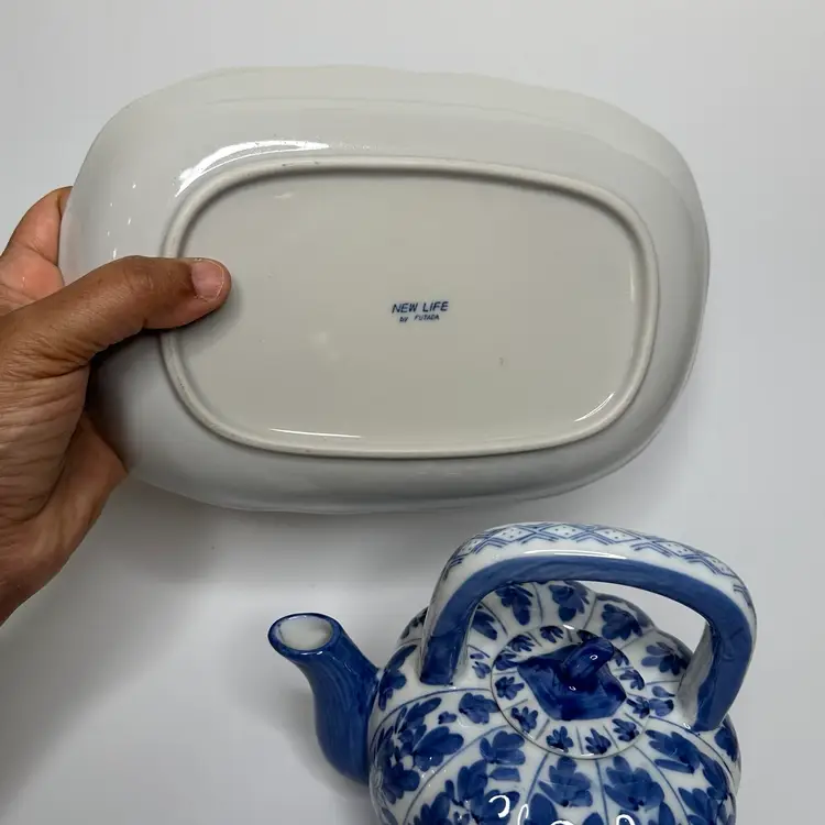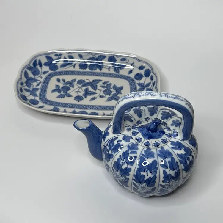 Approx dish size 9.5” x 6.5” and teapot 5.5” tall