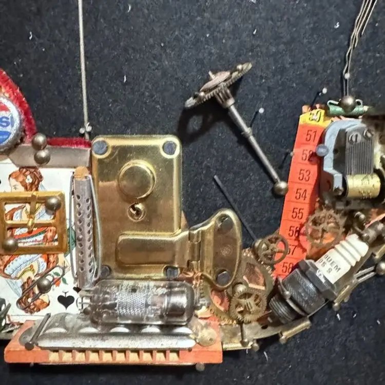 This steampunk masterpiece blends nostalgia and quirkiness with its junk art design. Featuring faux brass wheels and a vibrant blue canopy,Working Music Box it adds a whimsical touch to any space. Perfect for those who appreciate the unique marriage of past and future in their décor.