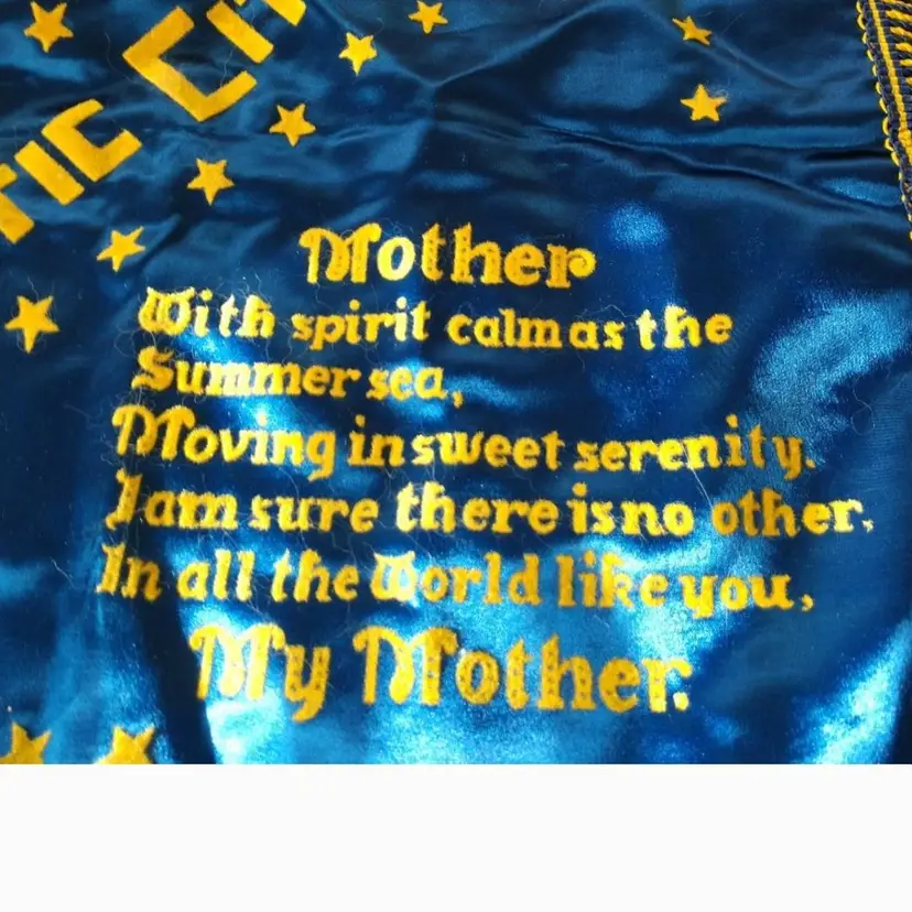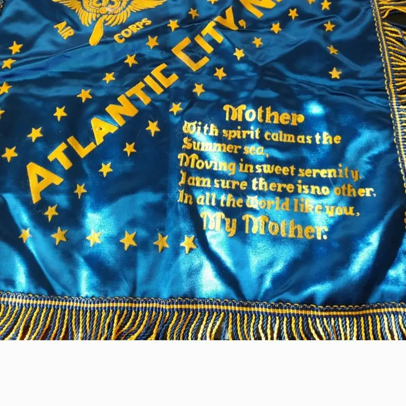 This is an old pillow cover from the US army. It is from Atlanta City with a mother poem. Excellent condition. It measures 18 inches with the fringe.