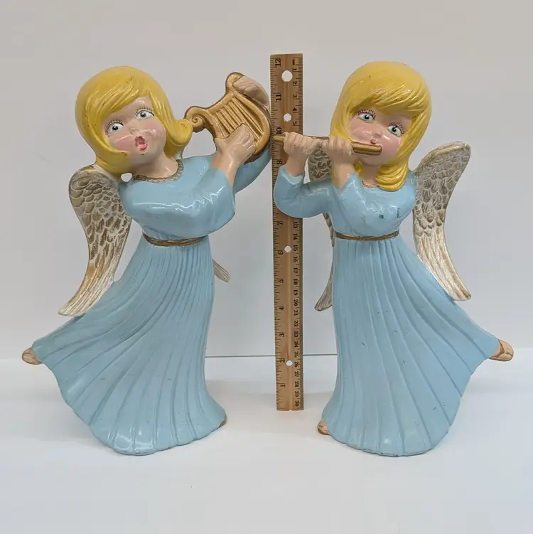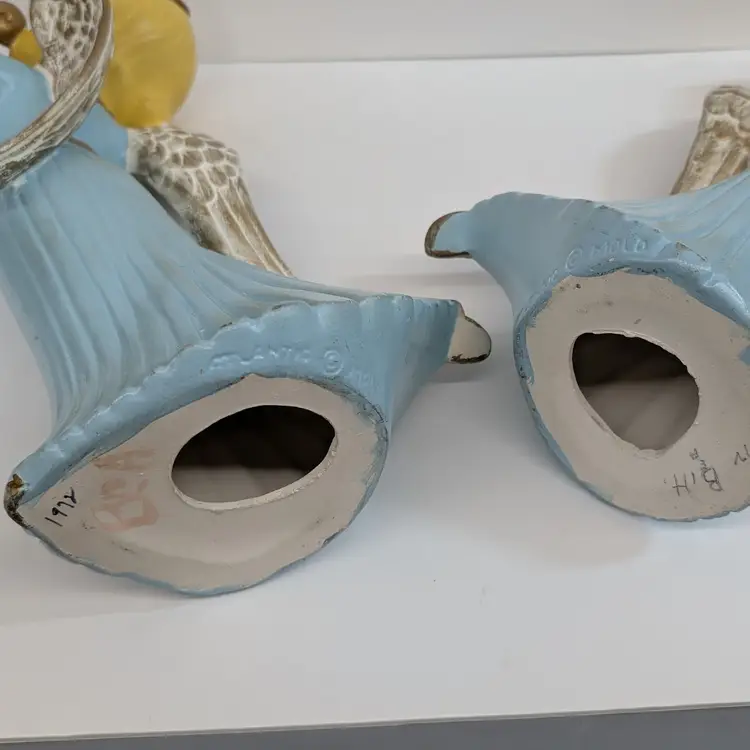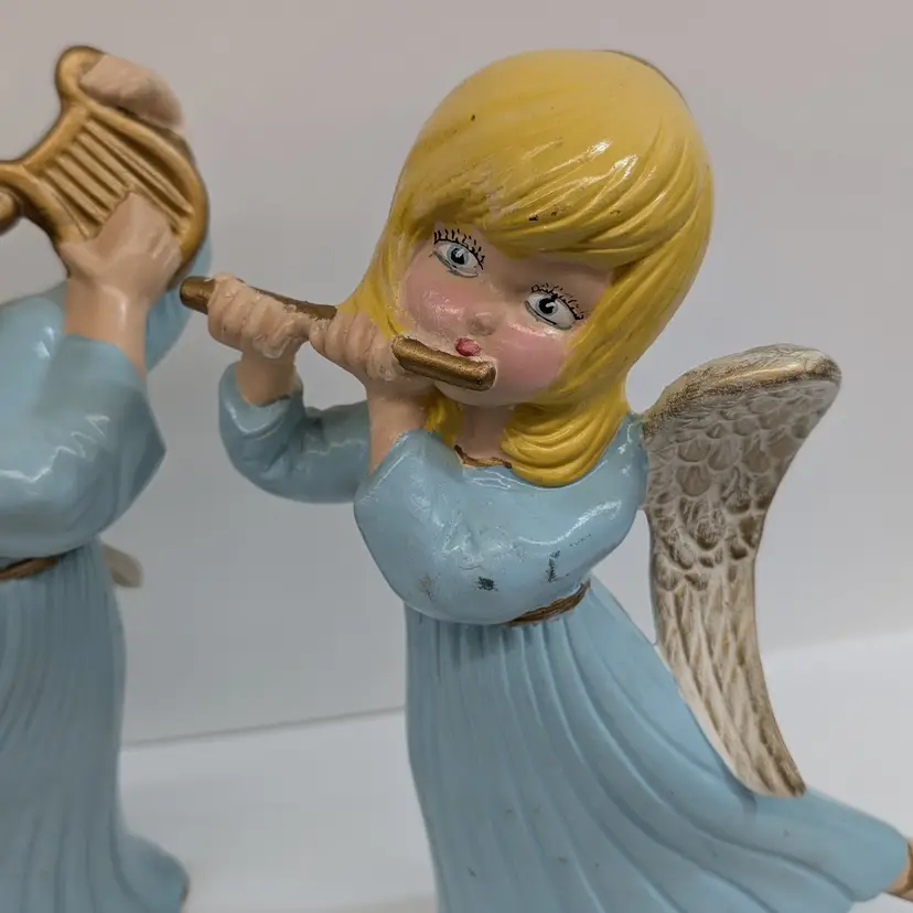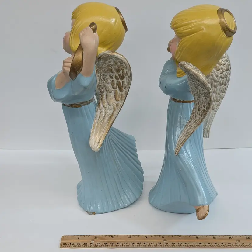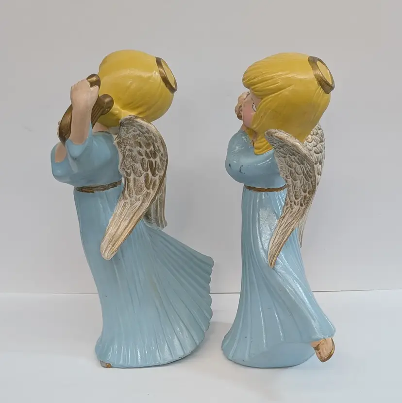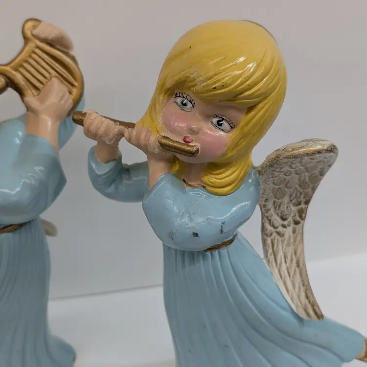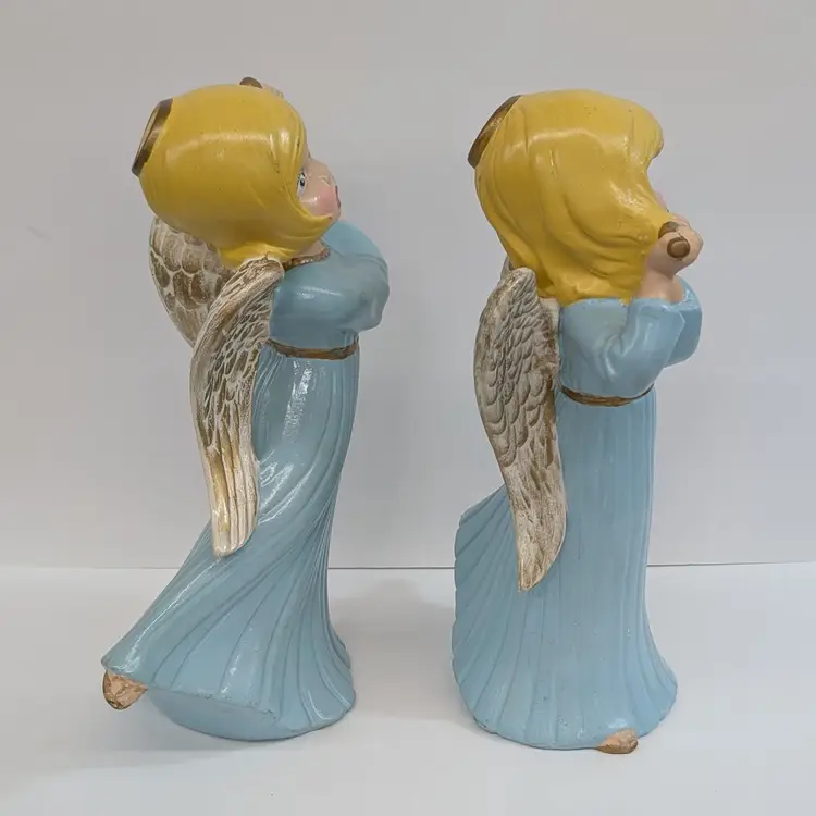 Retro and kitschy set of Atlantic Mold ceramic angels that have been hand painted in a blue and gold motif. There are some scuffs and paint wear from age (see pictures). Measurements ~ 8-8.75" x 4.5-5" x 12"