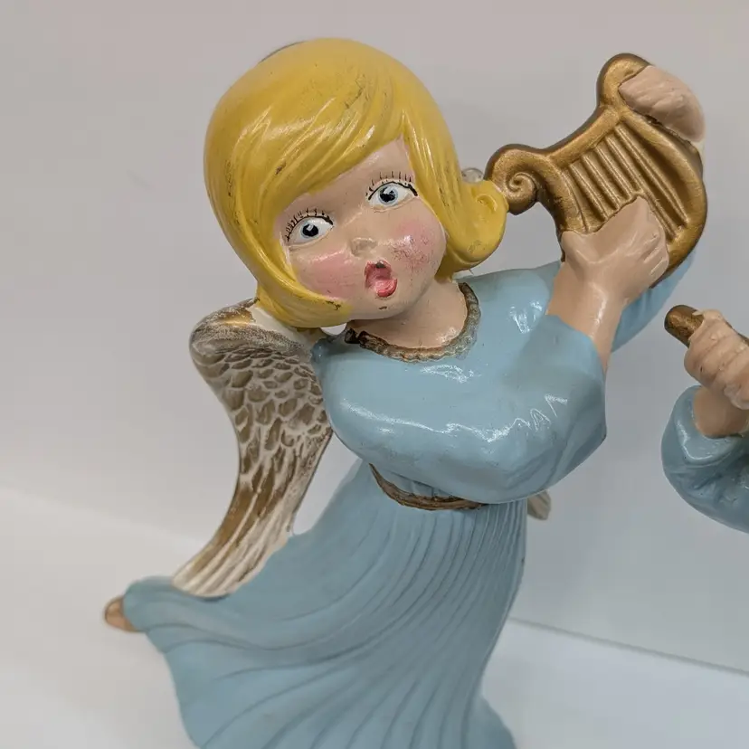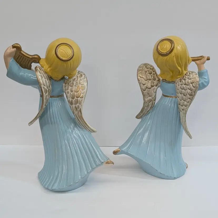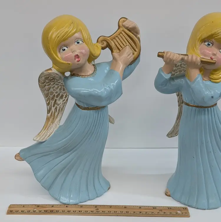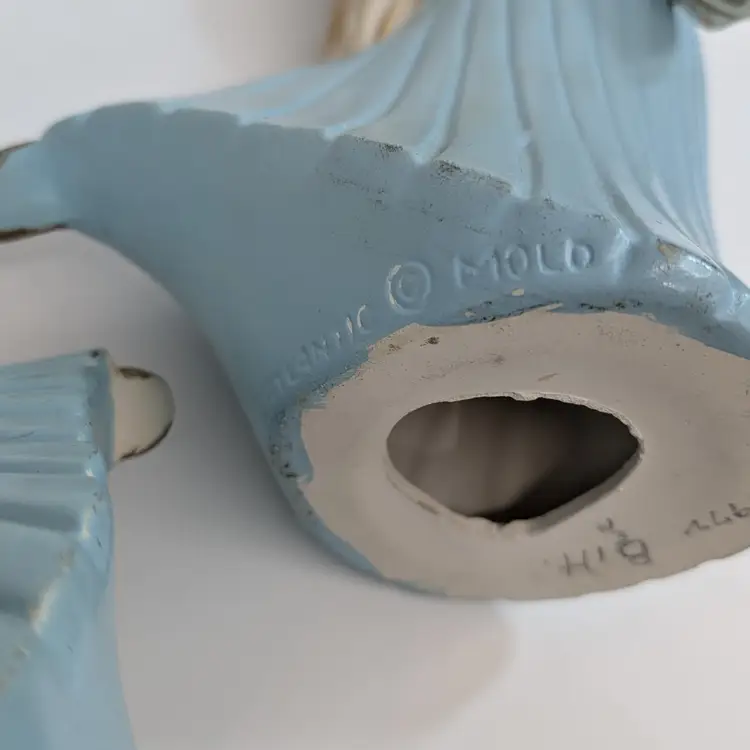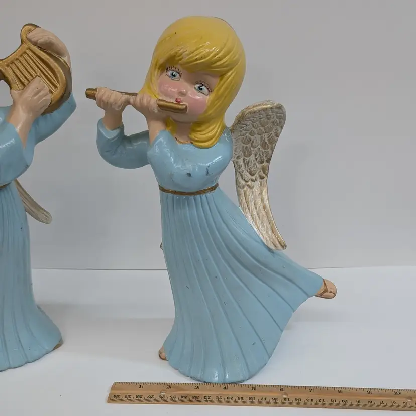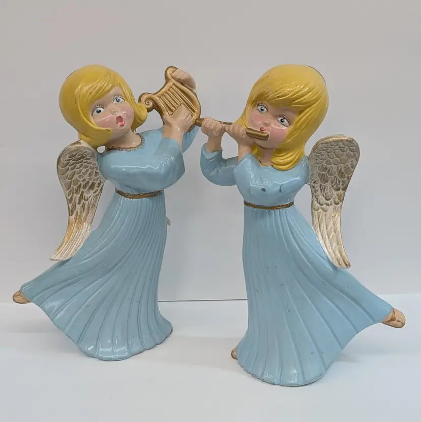 Retro and kitschy set of Atlantic Mold ceramic angels that have been hand painted in a blue and gold motif. There are some scuffs and paint wear from age (see pictures). Measurements ~ 8-8.75" x 4.5-5" x 12"