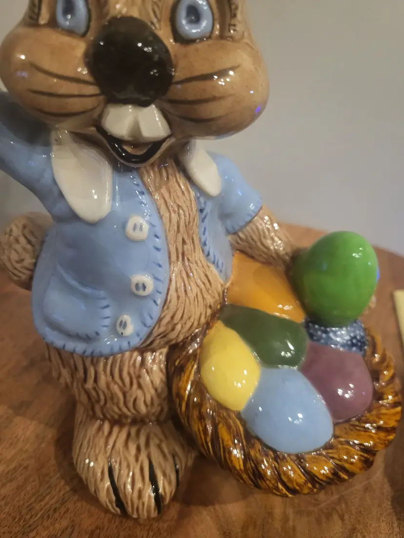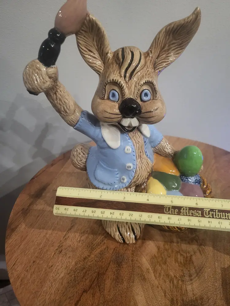 Nice shape ceramic bunny. Small chip on back of eae, not noticeable. Cant tell if bottom of paint brush broke off or it should be longer. Looks fine and I have seen bunnies like this both ways. See pictures. Shipping cost is based on your location, size and weight of box item is shipped in. If you feel shipping cost is to high let me know what your zip code is and I can see if there is a cheaper option. Shipping is done by USPS, I choose cheapest option when listing but shipping will be USPS. I do combine shipping if you buy more than one item from my store. Any questions please do not hesitate to ask.