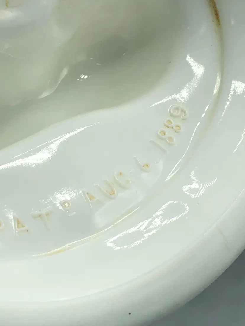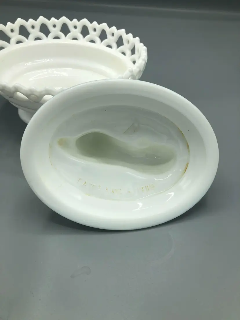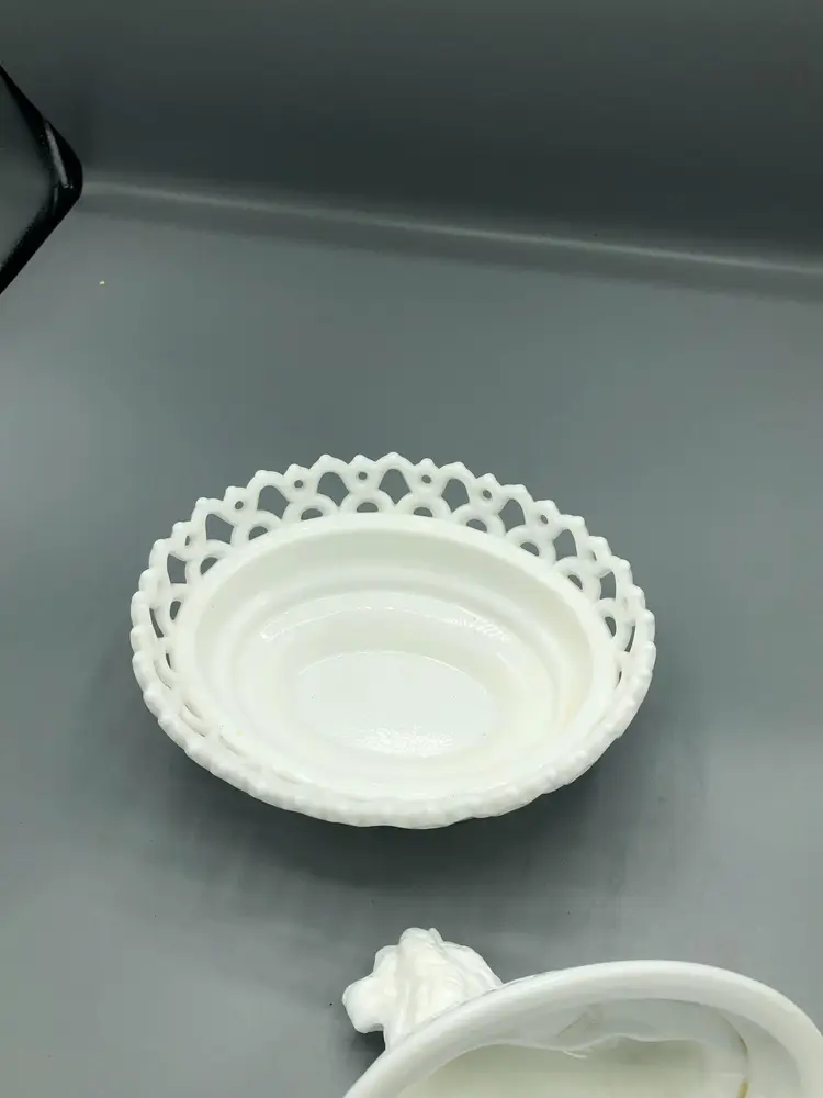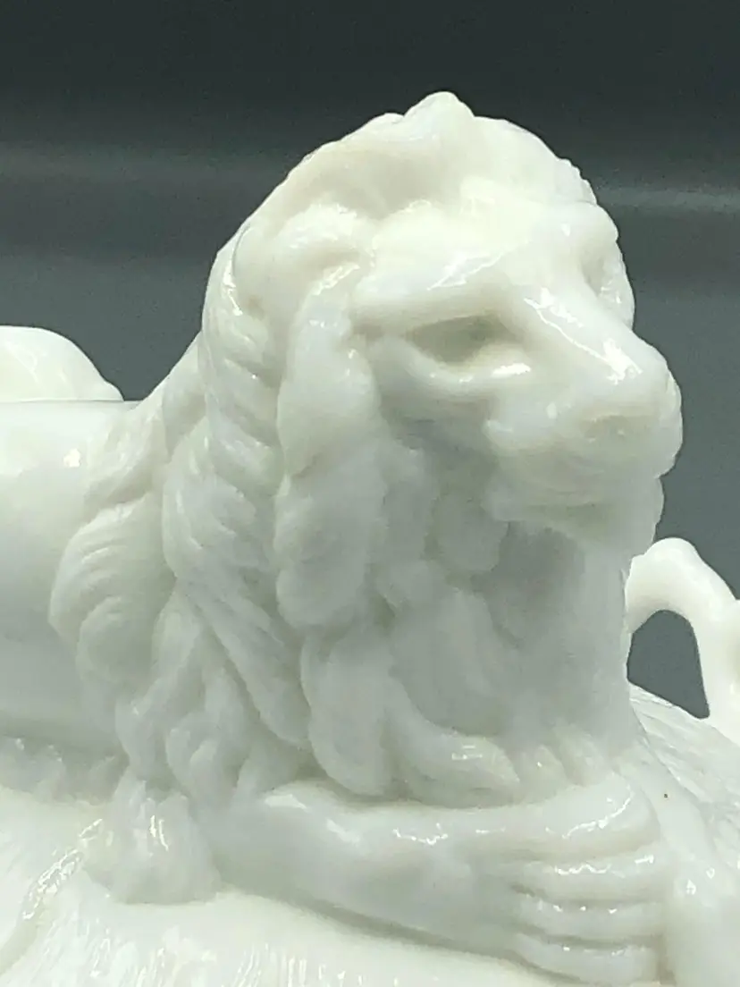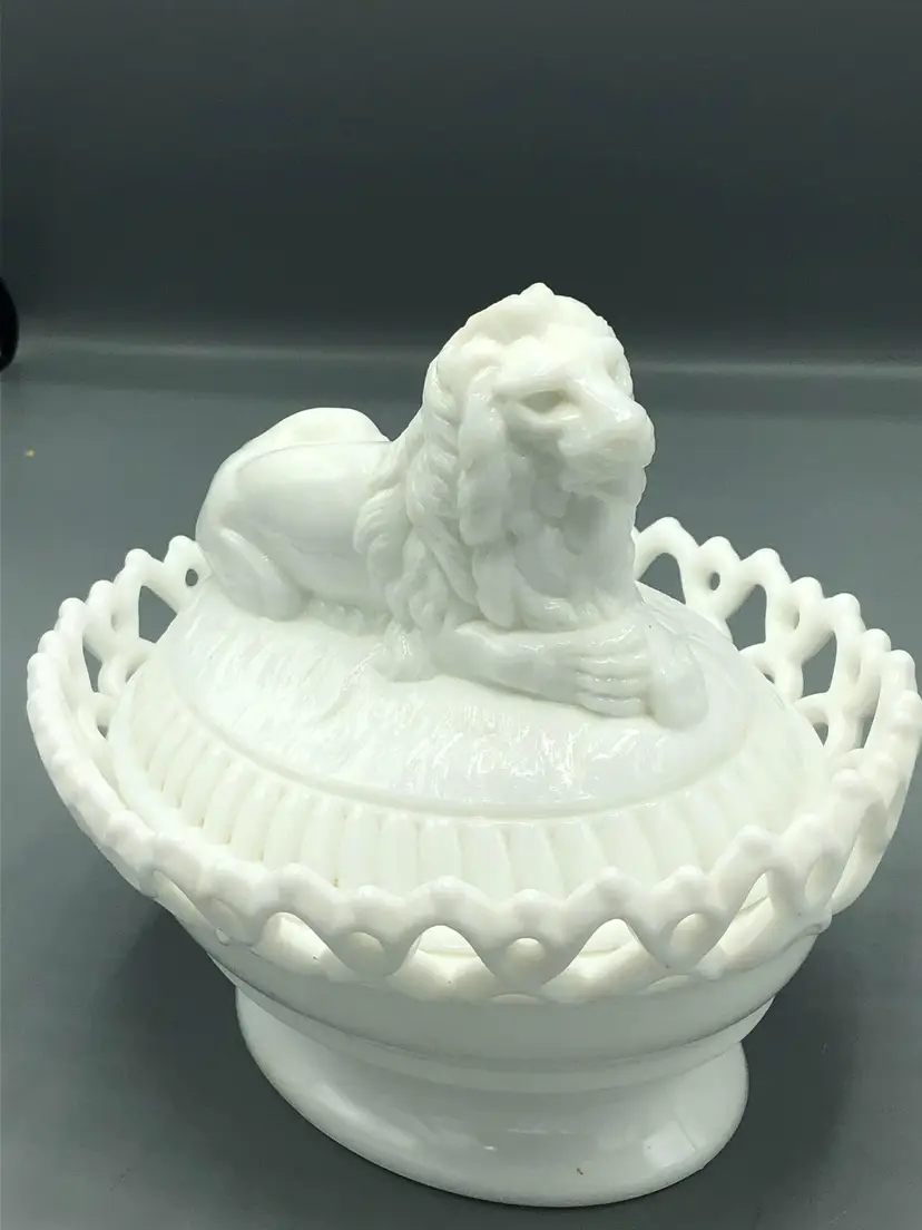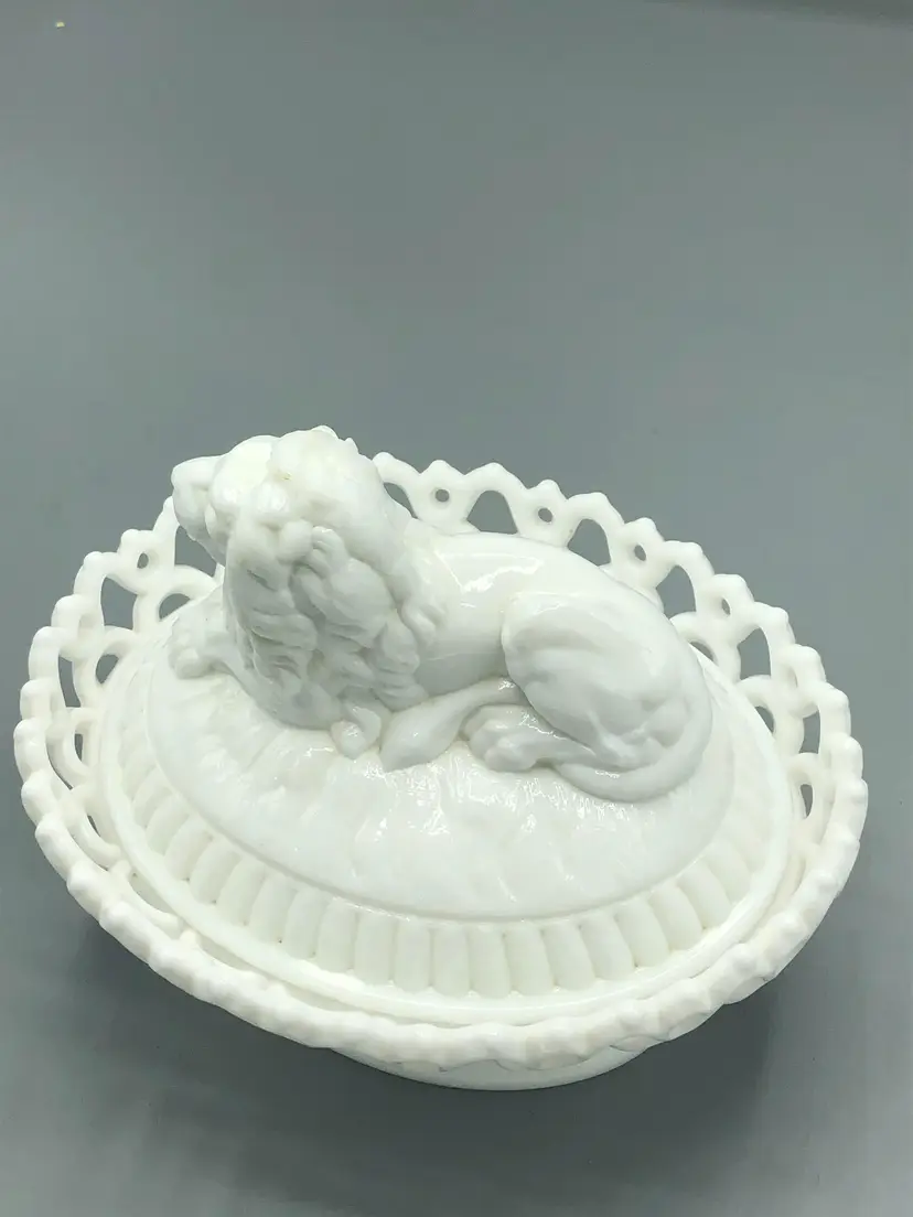 Vintage Aterbury milk glass lion on nest that is definately a conversation starter. This would make a great gift.This has no cracks or chips.