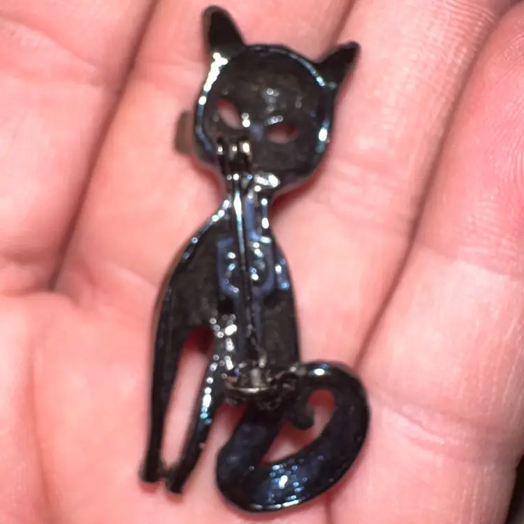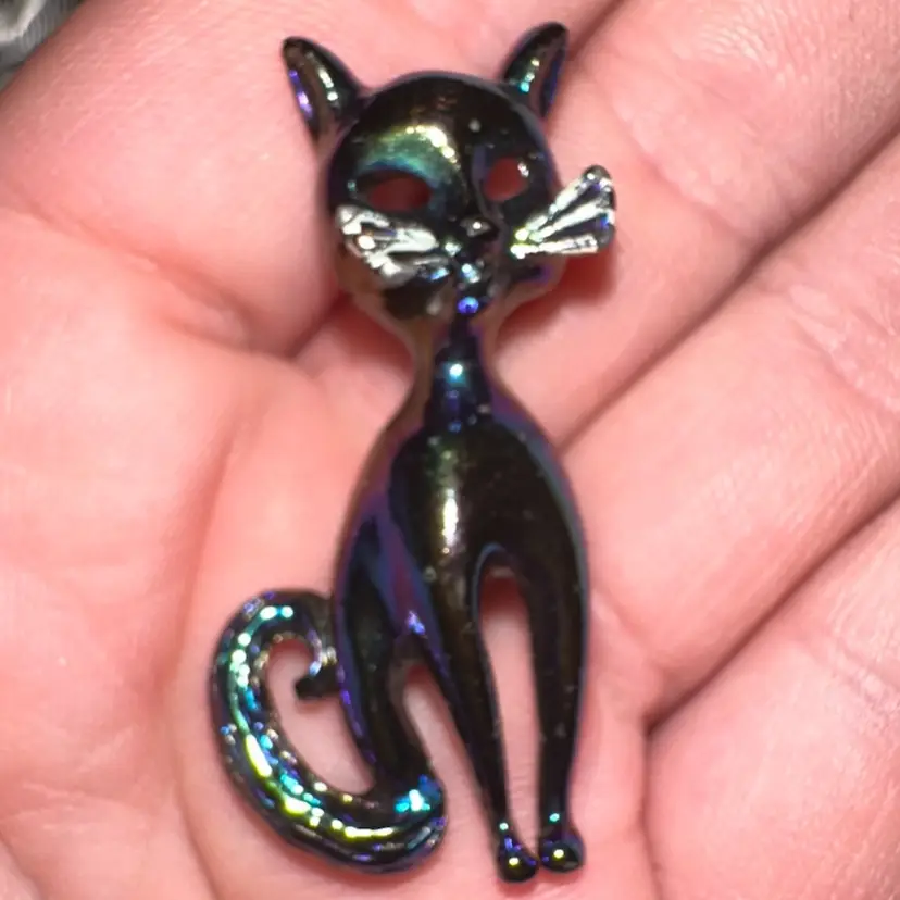 Vintage Atomic Black CAT Figural Pin Iridescent Enamel pin brooch 1.5” tall x 3/4”