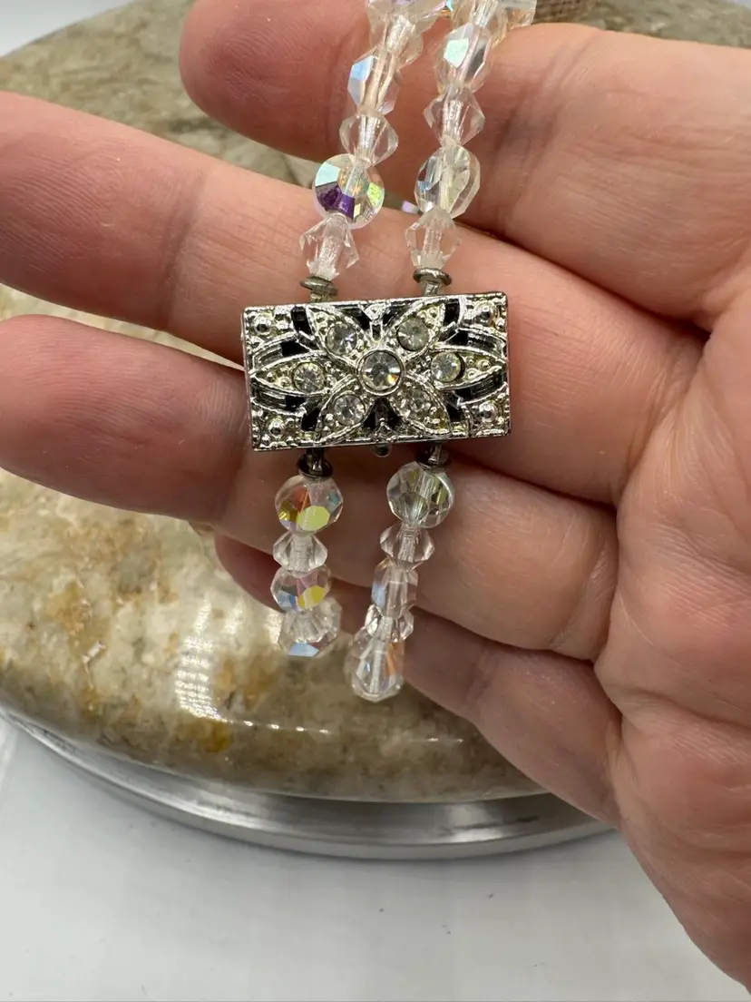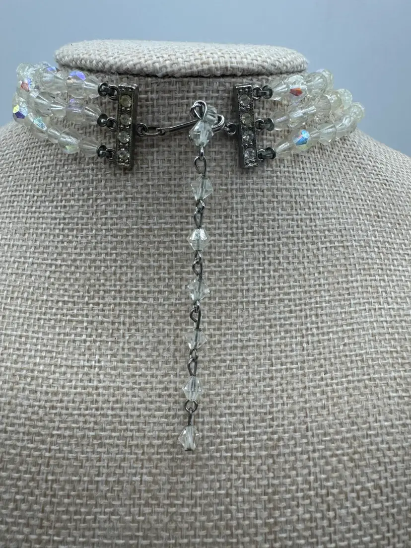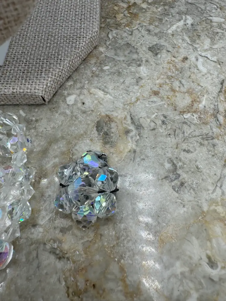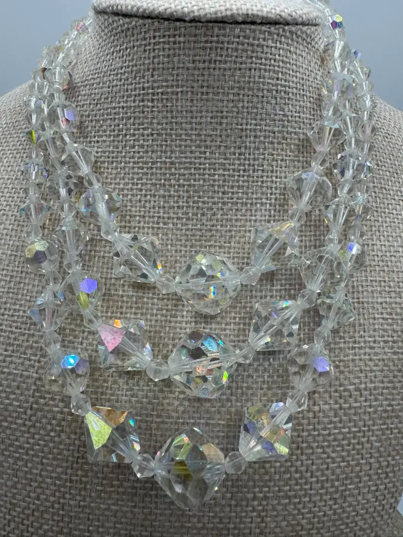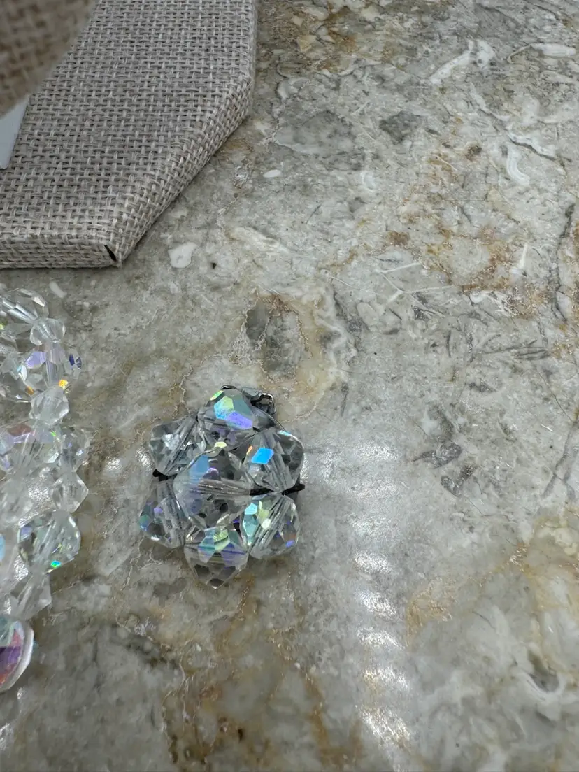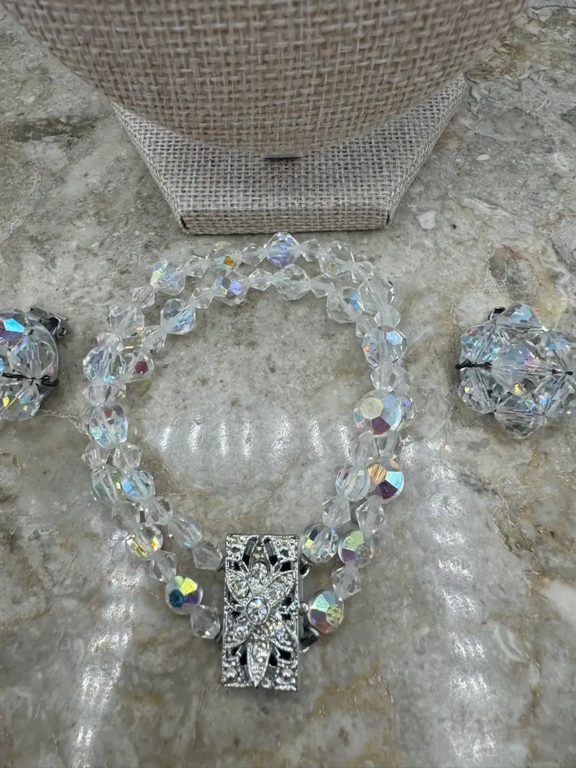 Vintage Aurora Borealis Crystal And Rhinestone Necklace, Bracelet, And Clip On Earrings Set. This jewelry set is exquisite! The AB coating, developed by Swarovski in collaboration with Christian Dior in the mid-1950s, gives the clear, faceted crystals their characteristic iridescent, rainbow-like shimmer. The set is an excellent condition! Necklace 12” with 2.5” extender Bracelet 6 1/4” Earrings 1”