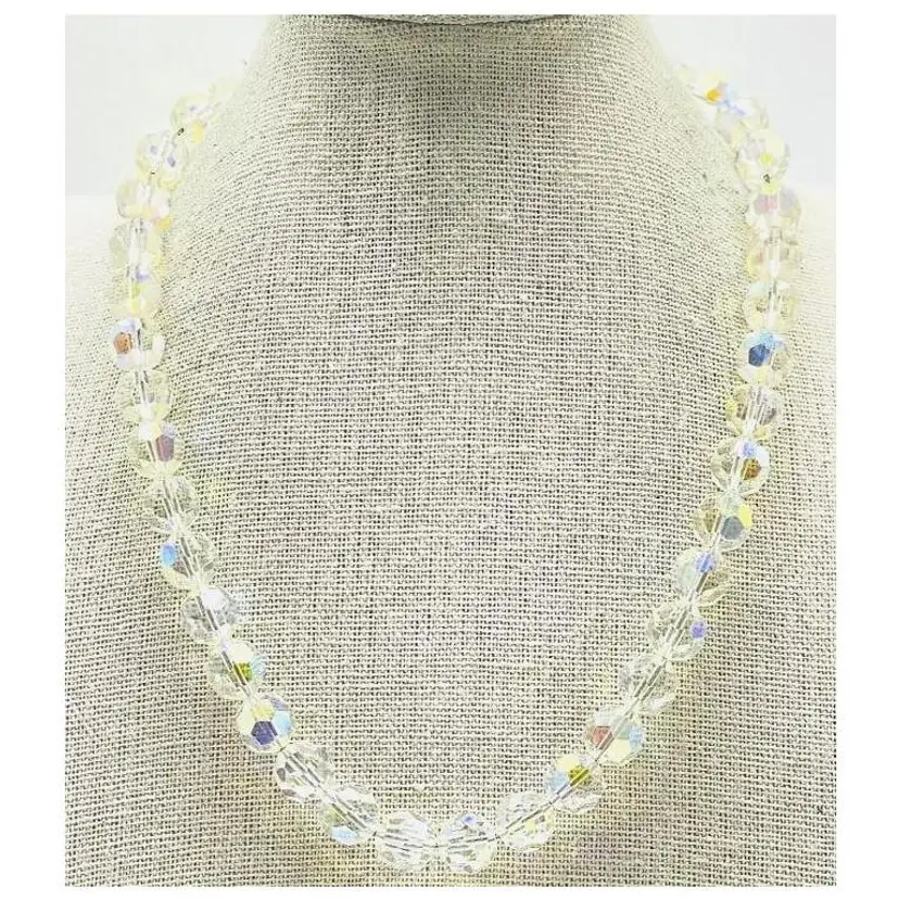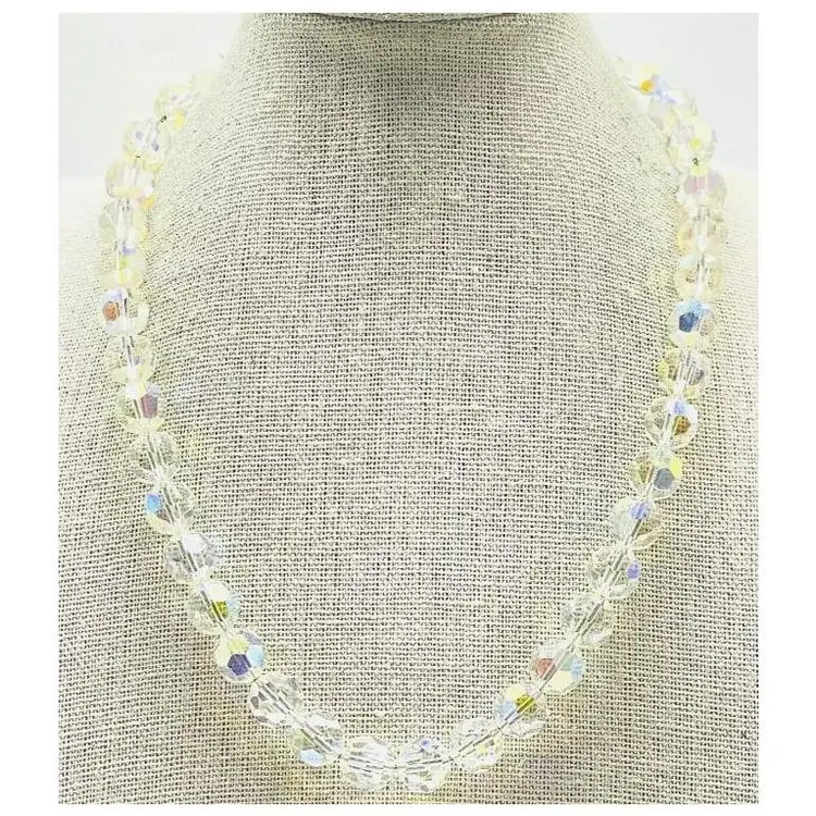 This stunning vintage necklace features sparkling Aurora Borealis crystal beads, measuring 18 inches in length. Perfect for adding a touch of elegance to any outfit.