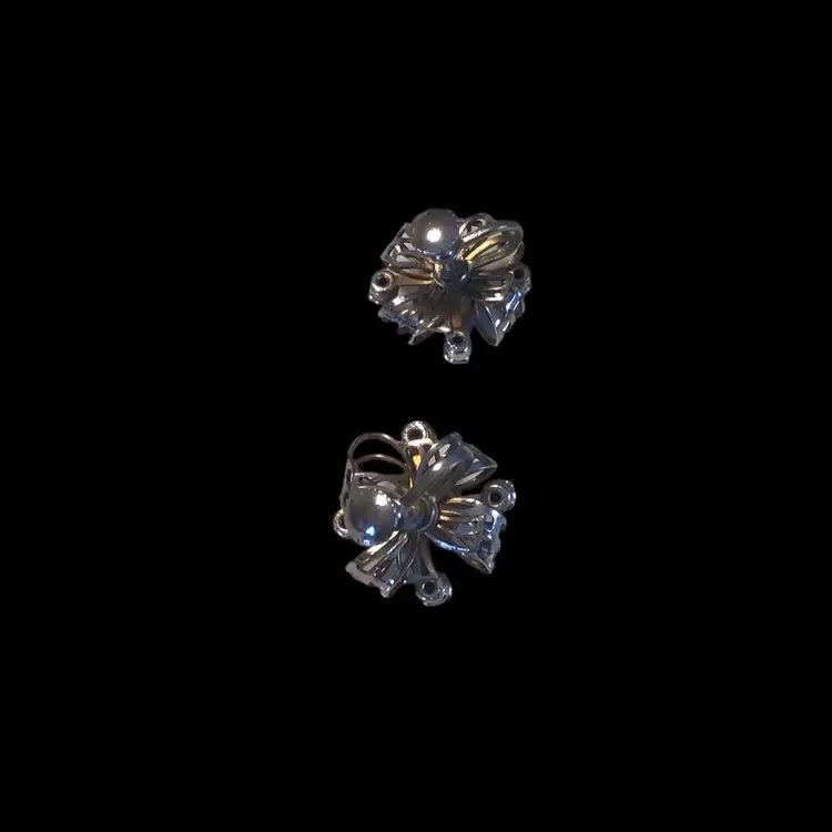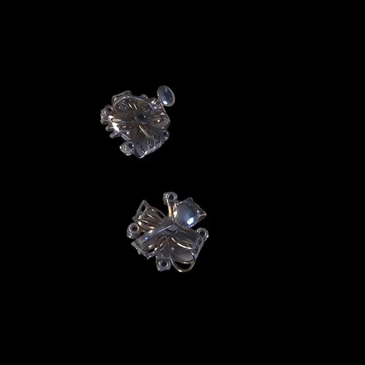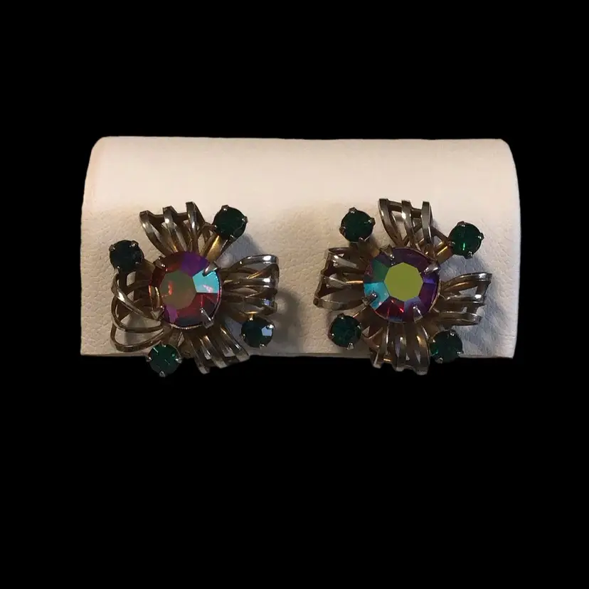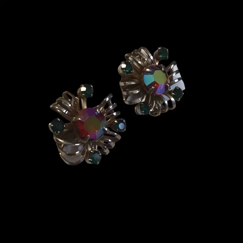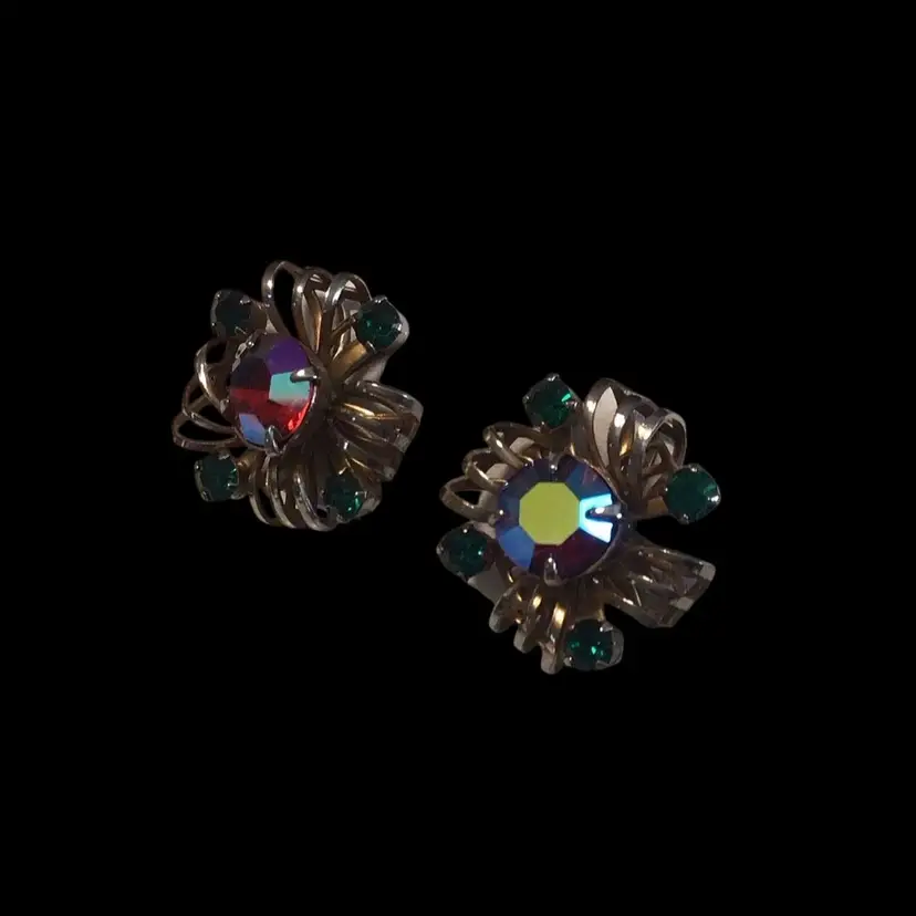 Faceted AB center stone & deep green prong set rhinestones with brass tone wire work screw back accent 3/4" across. 1940s era #173