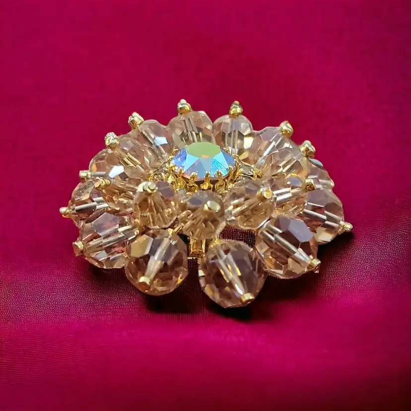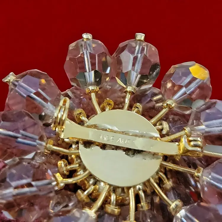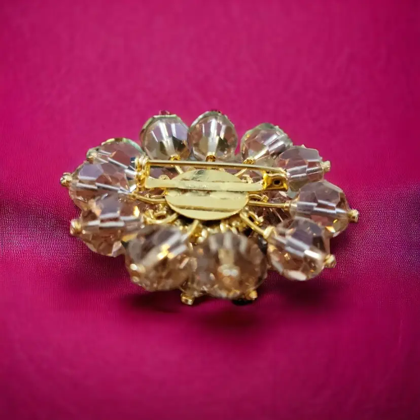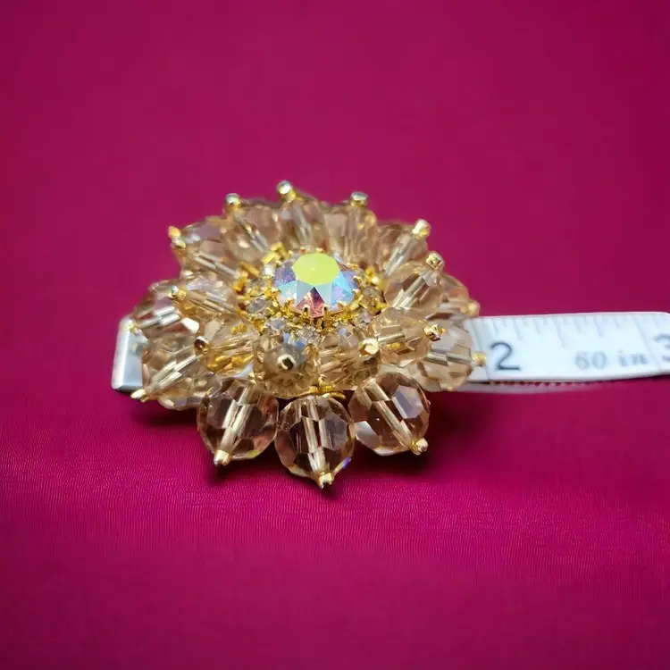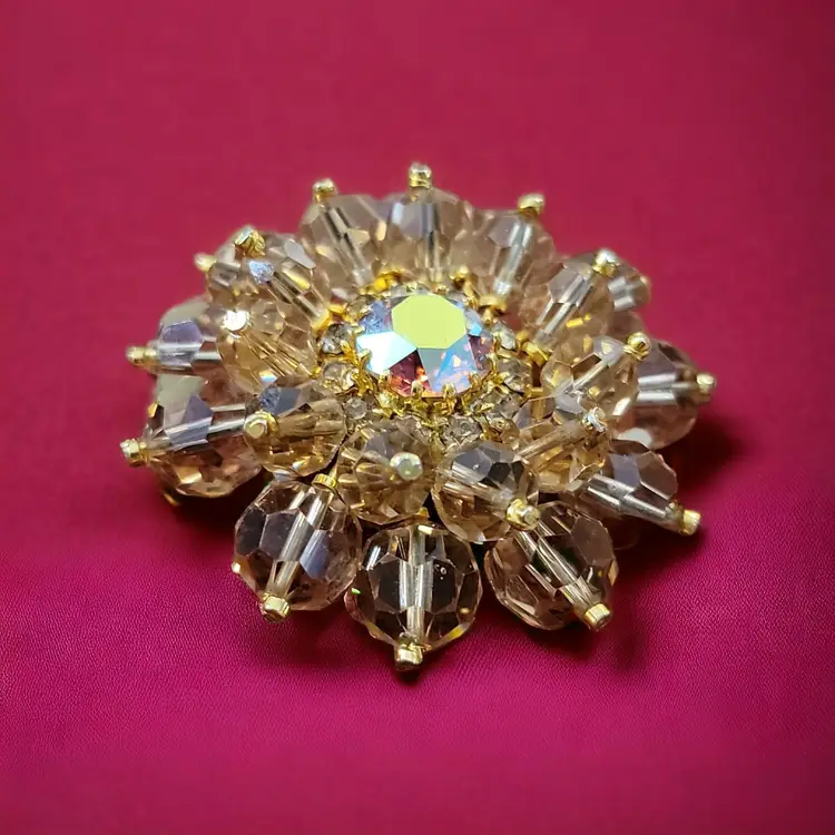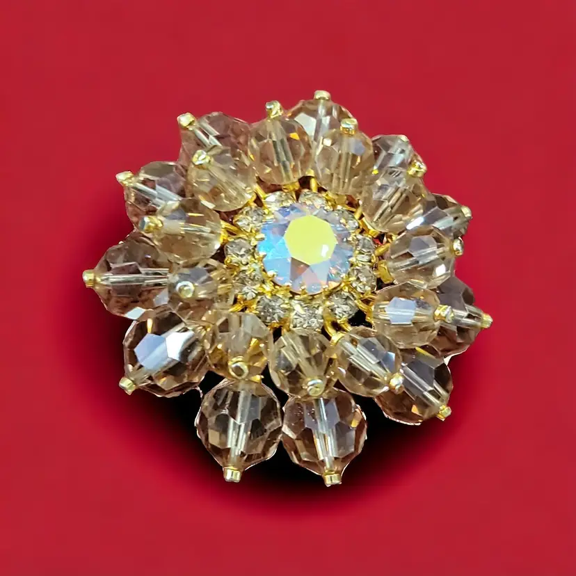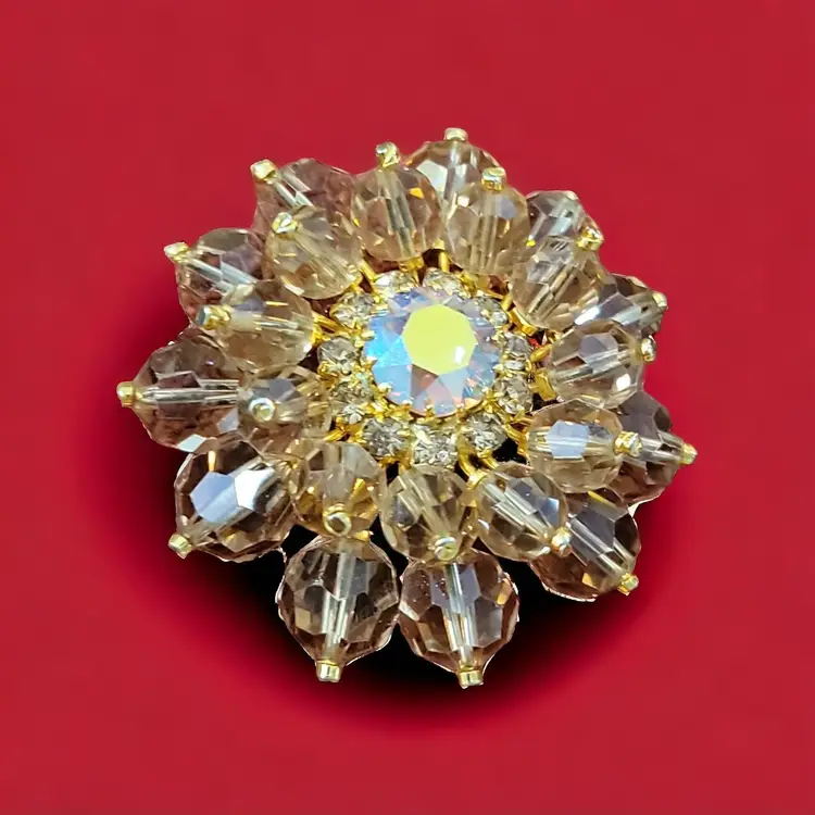 This stunning brooch has four layers centered around a faceted aurora borealis cabochon. The brooch has two rows of amber colored glass balls that protect a row of tiny clear rhinestones deep inside the brooch as a halo surrounding the lovely cabochon. The fastener looks like a sloppy repair job but that could be repaired. If it is not the original fastener, then the mark,'made in Aust(ria is covered) may not be a proper identifier or mark. See photos. Still it is a gorgeous brooch that will command attention.