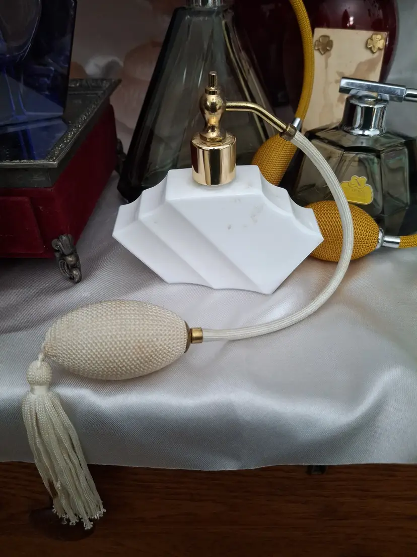 Vintage milk glass perfume atomizer marked “Made in Austria,” featuring a geometric Art Deco form with gold-tone hardware and original bulb.